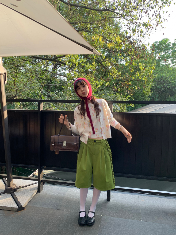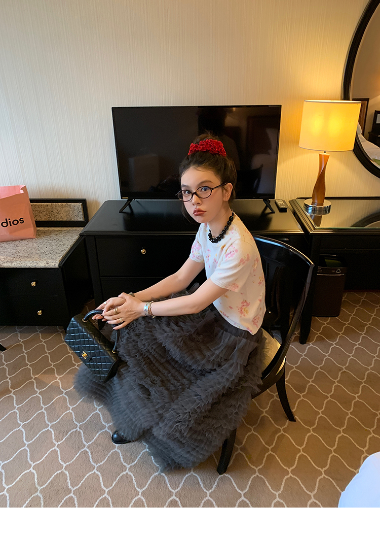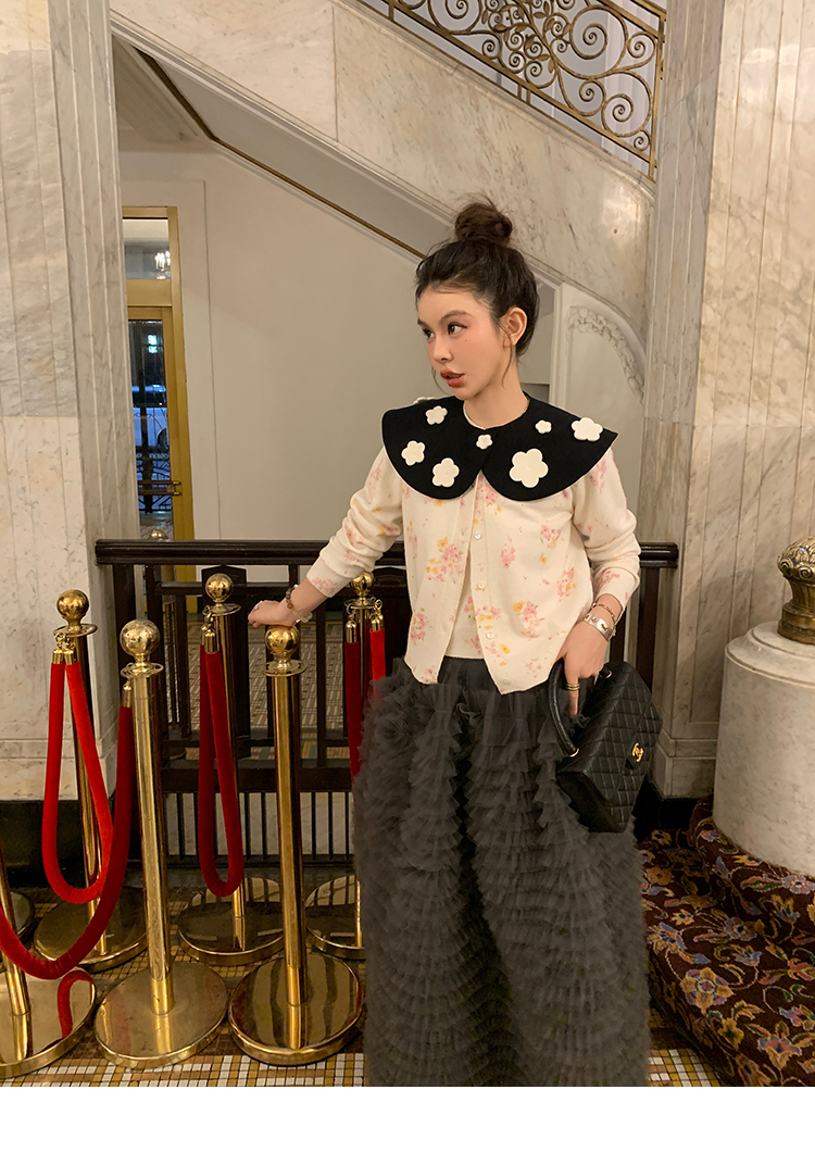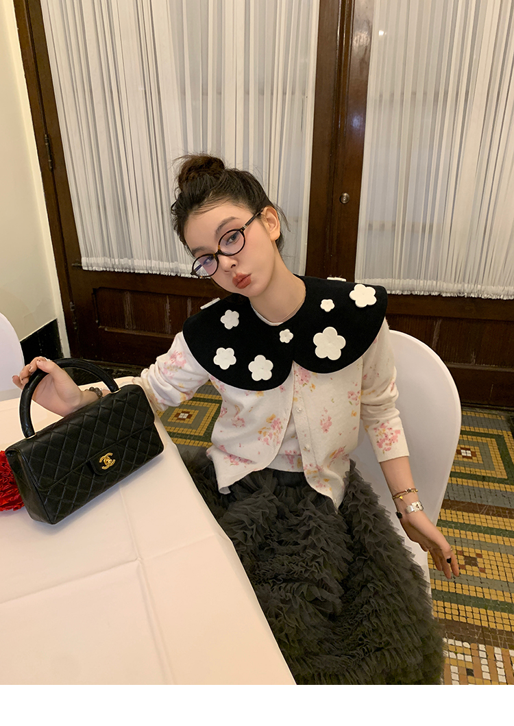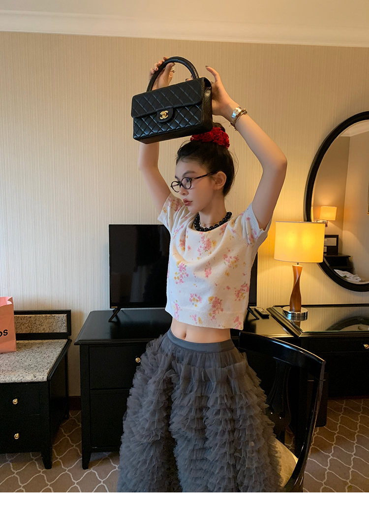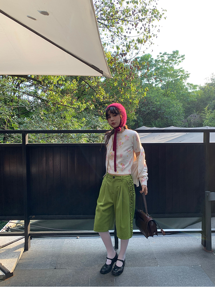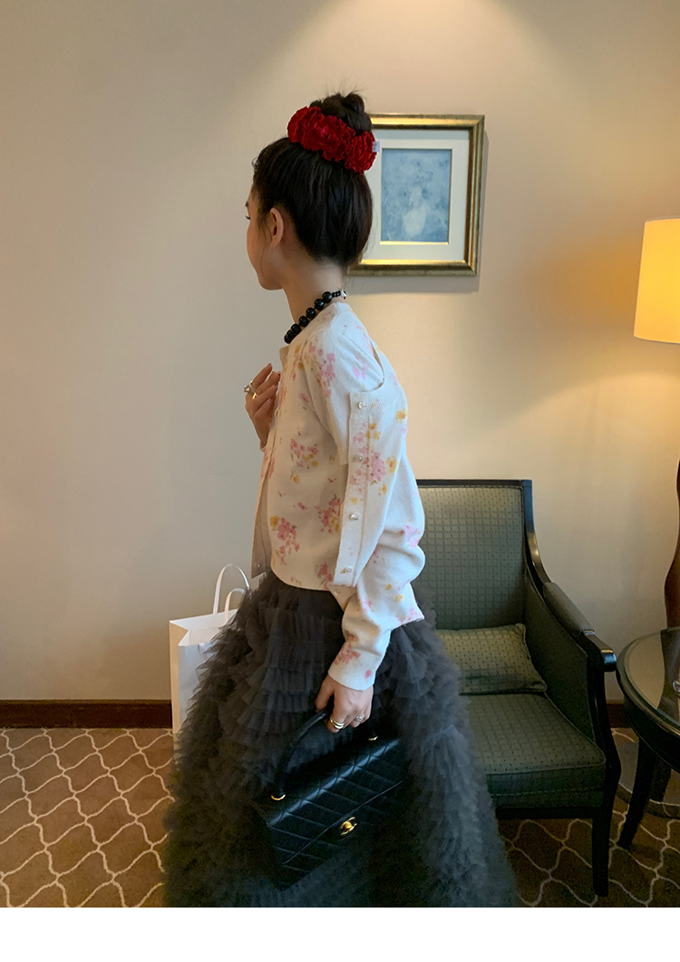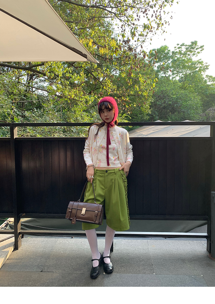 LRIB pink floral wool round neck short-sleeved knitted cardigan two-piece set