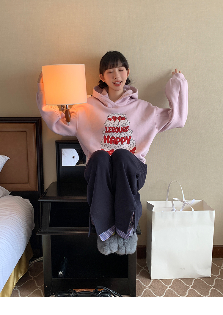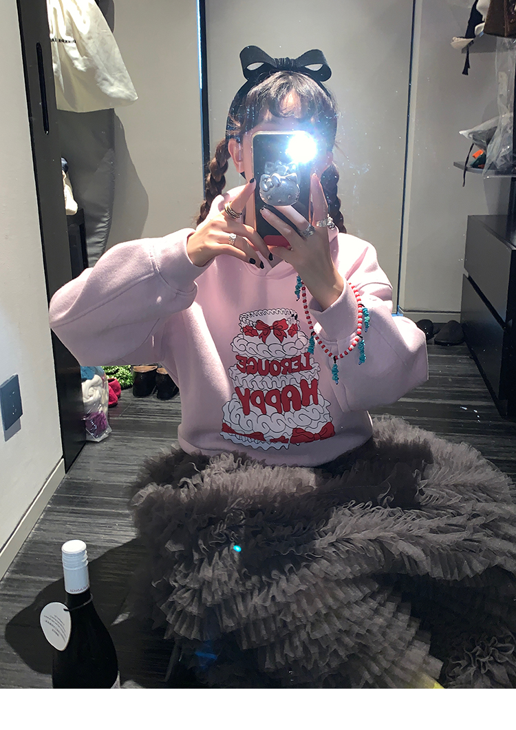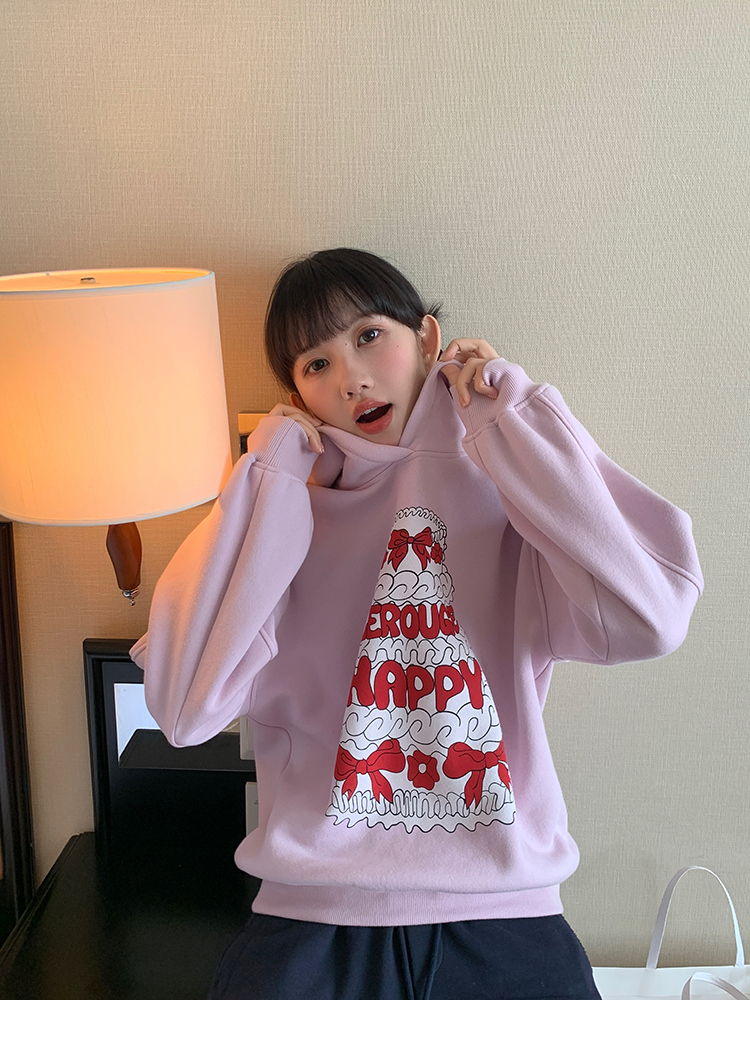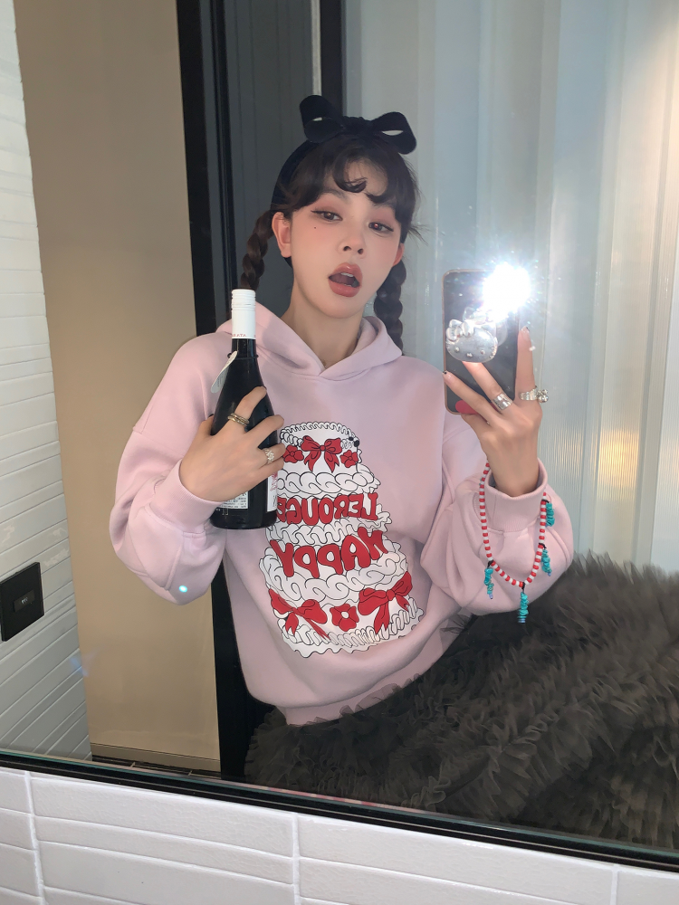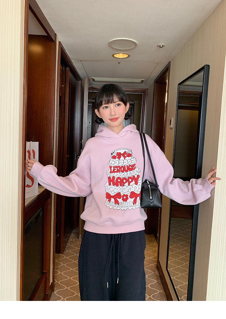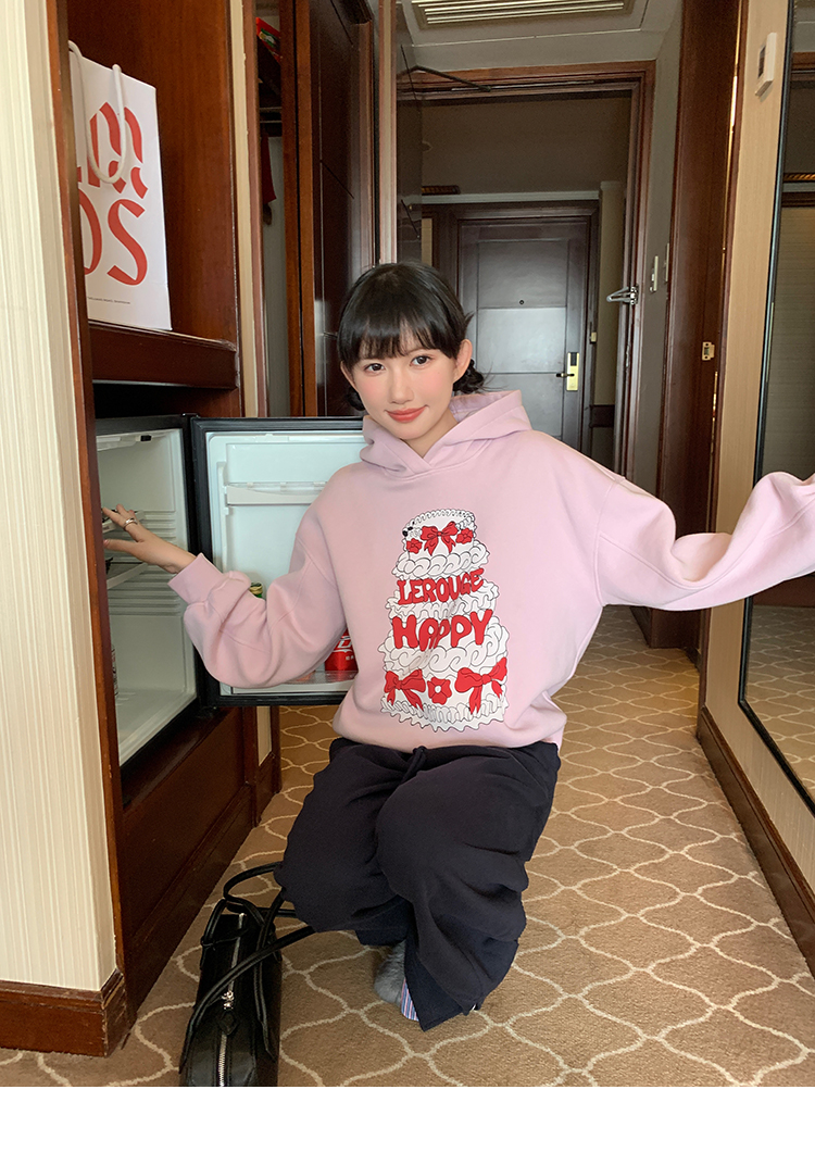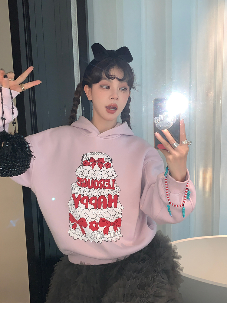 LRIB taro powder birthday cake print loose plush hooded sweatshirt
