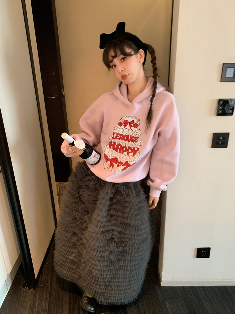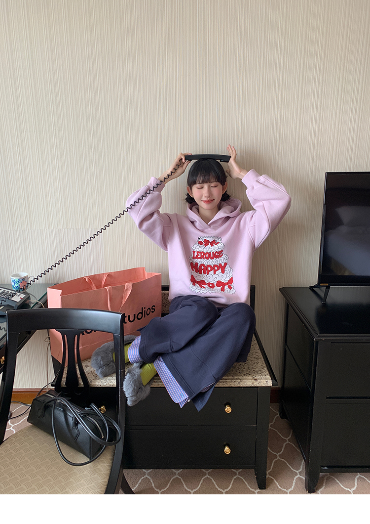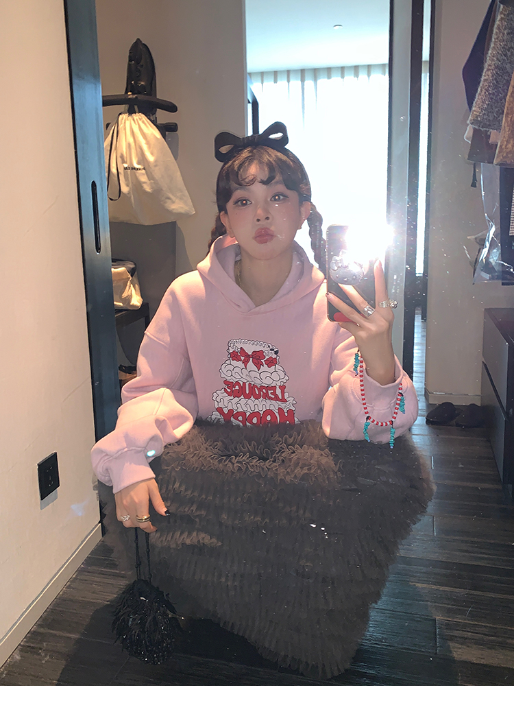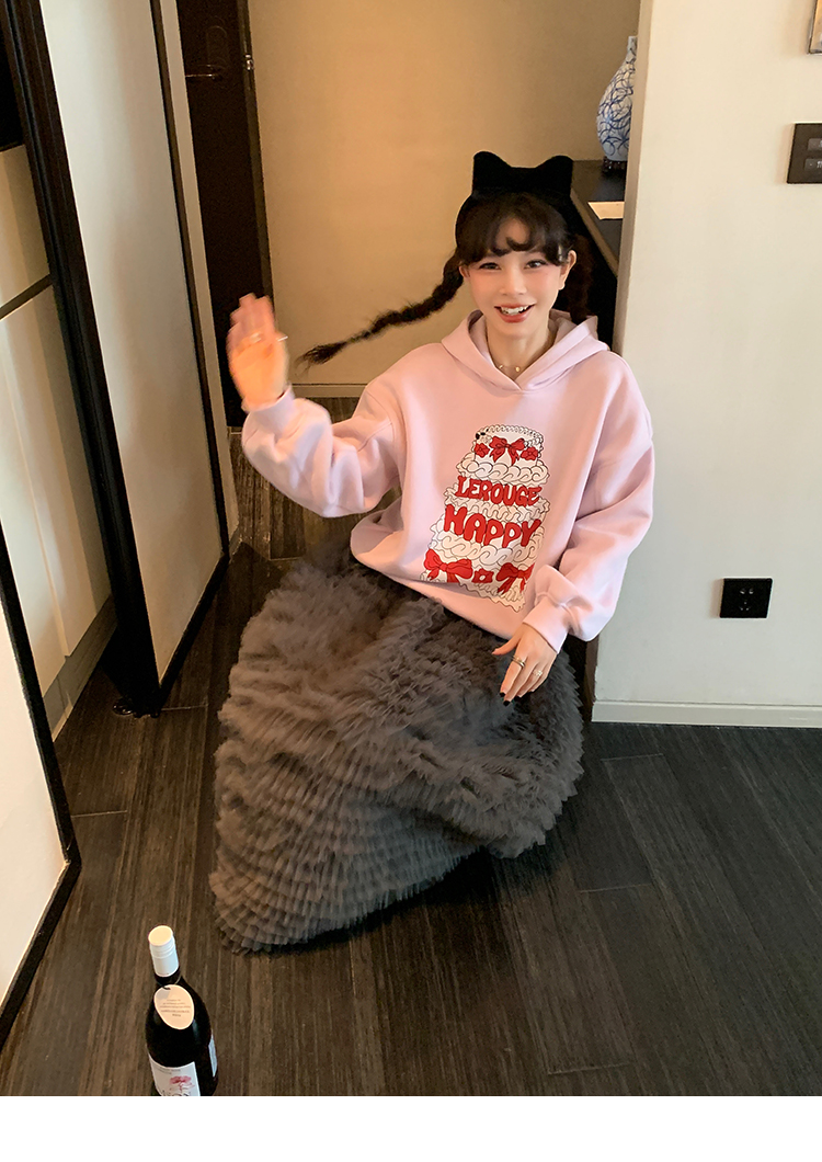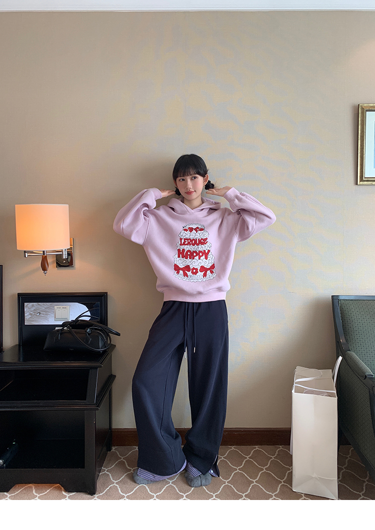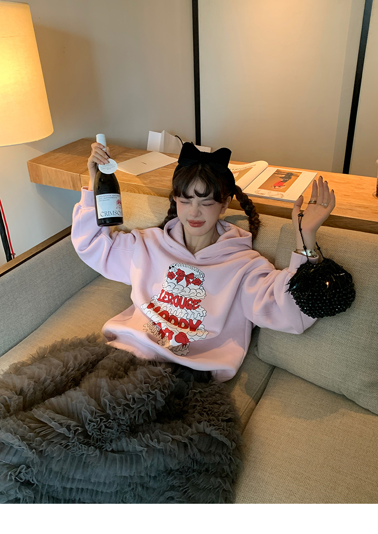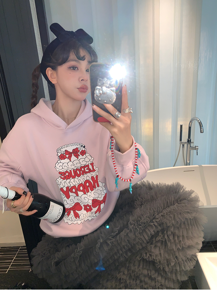 LRIB taro powder birthday cake print loose plush hooded sweatshirt