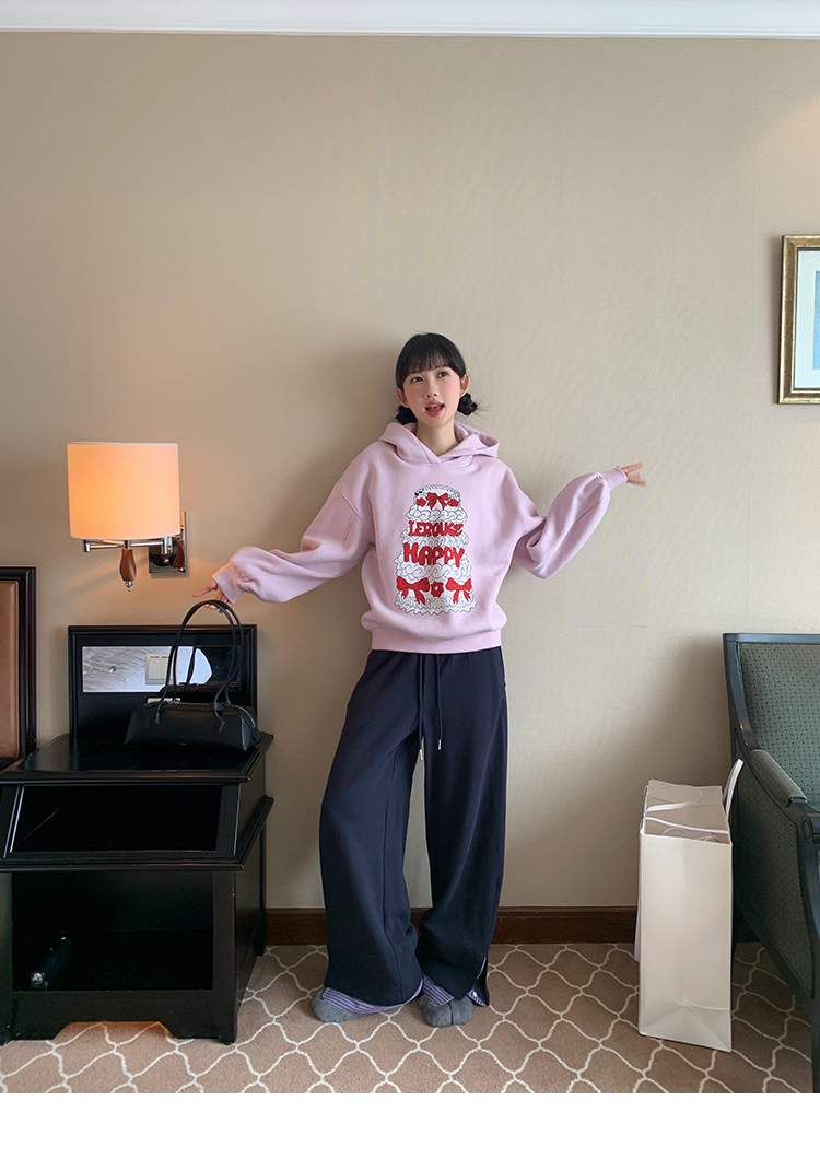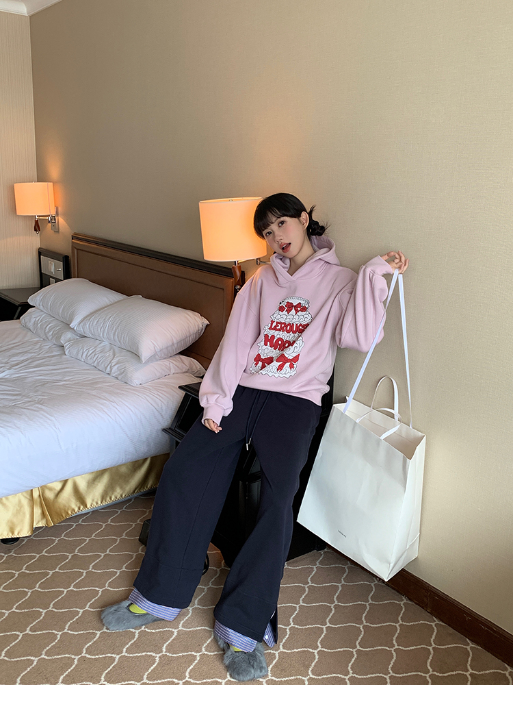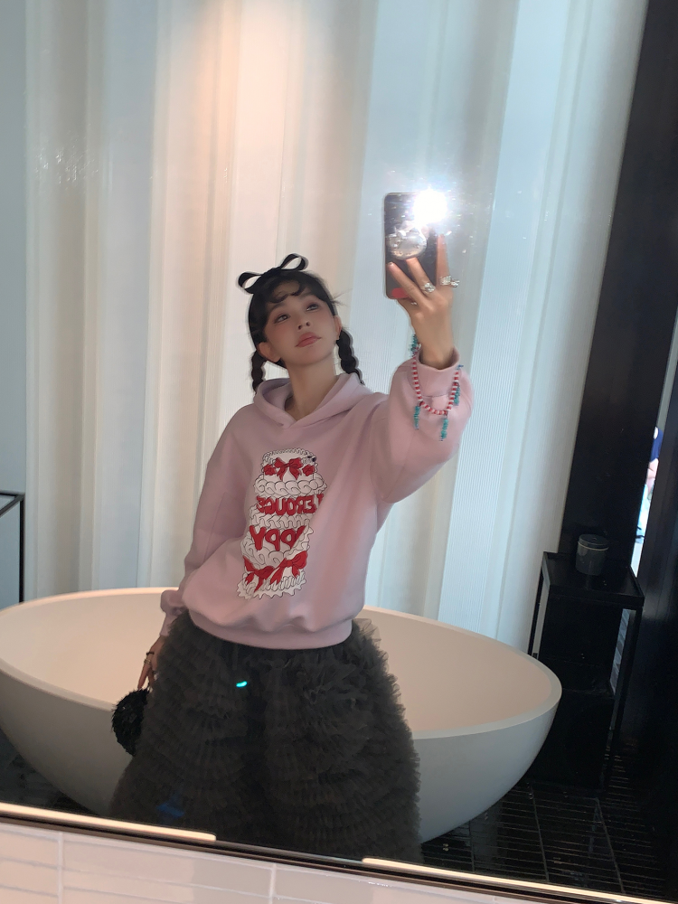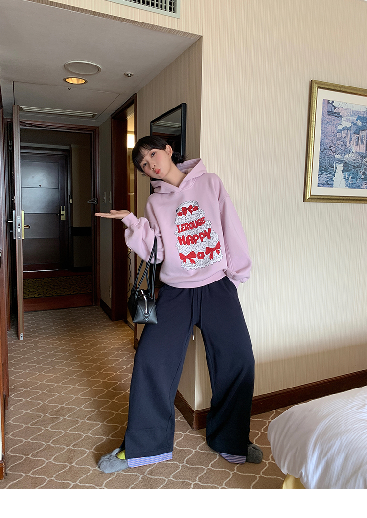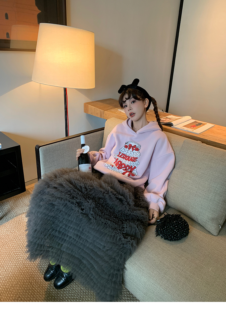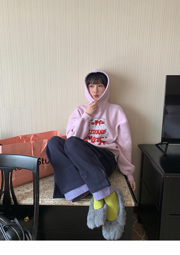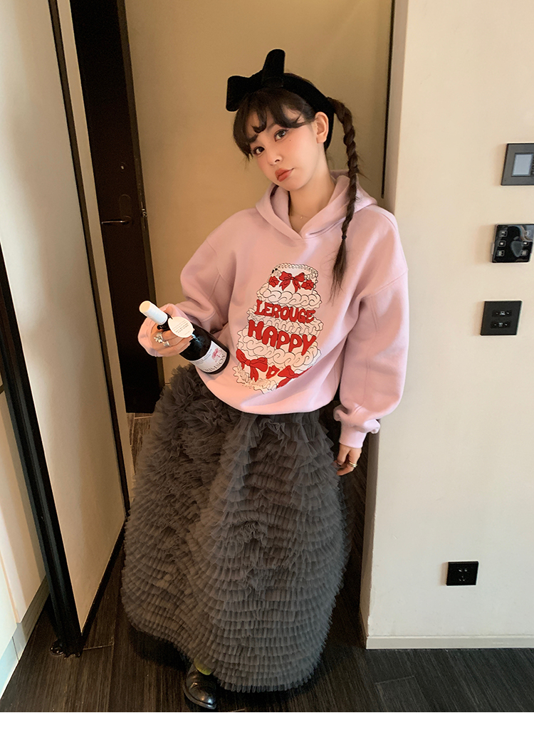 LRIB taro powder birthday cake print loose plush hooded sweatshirt