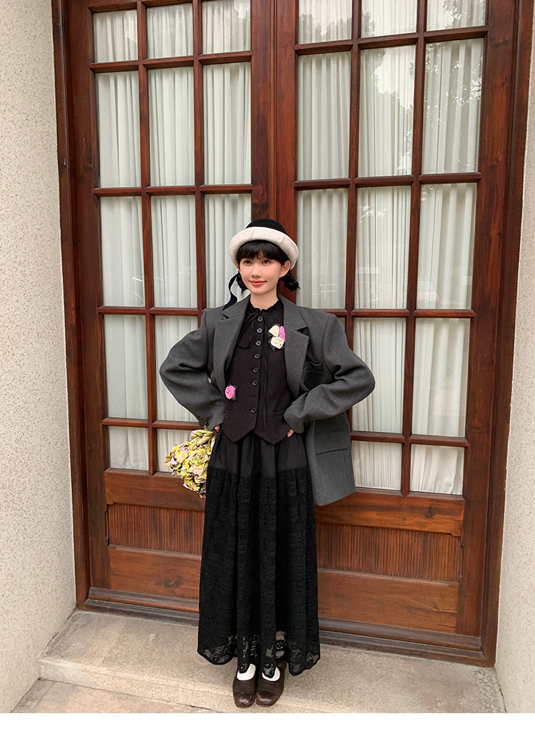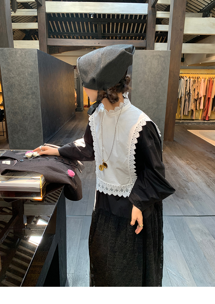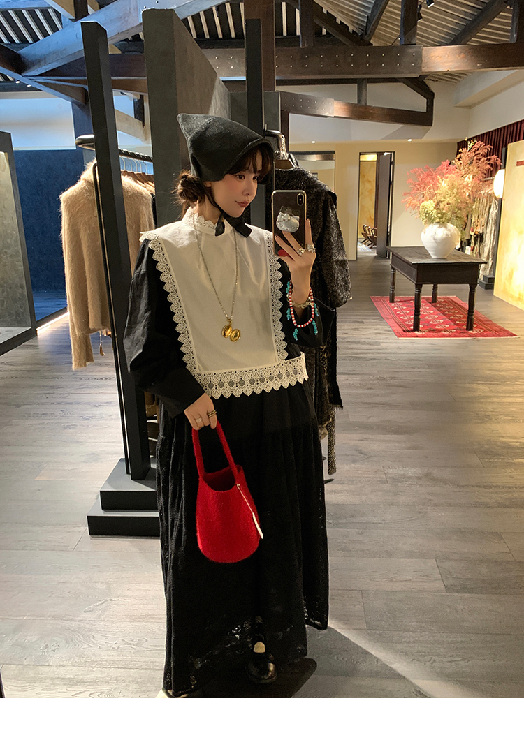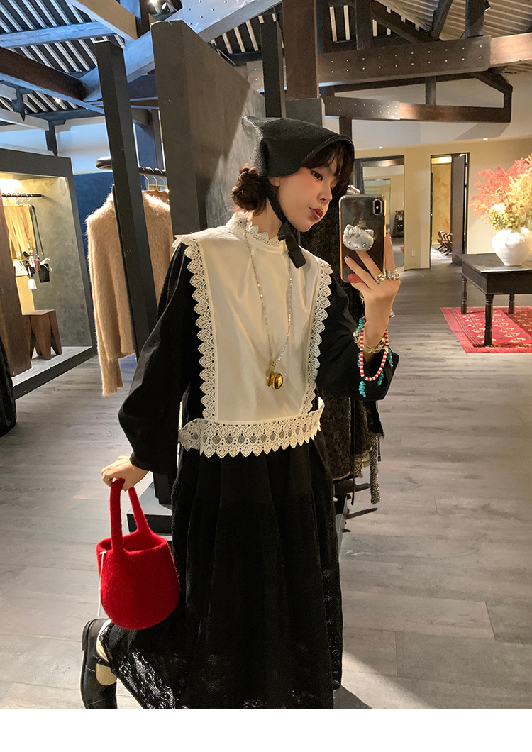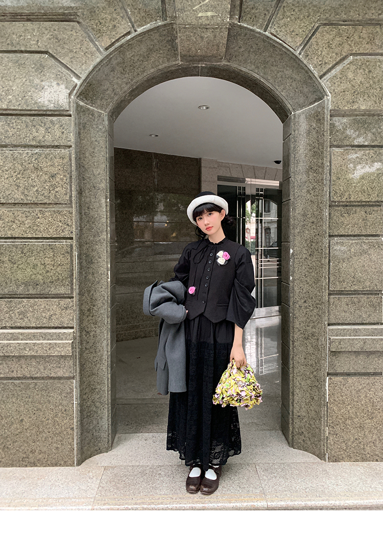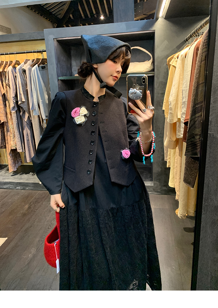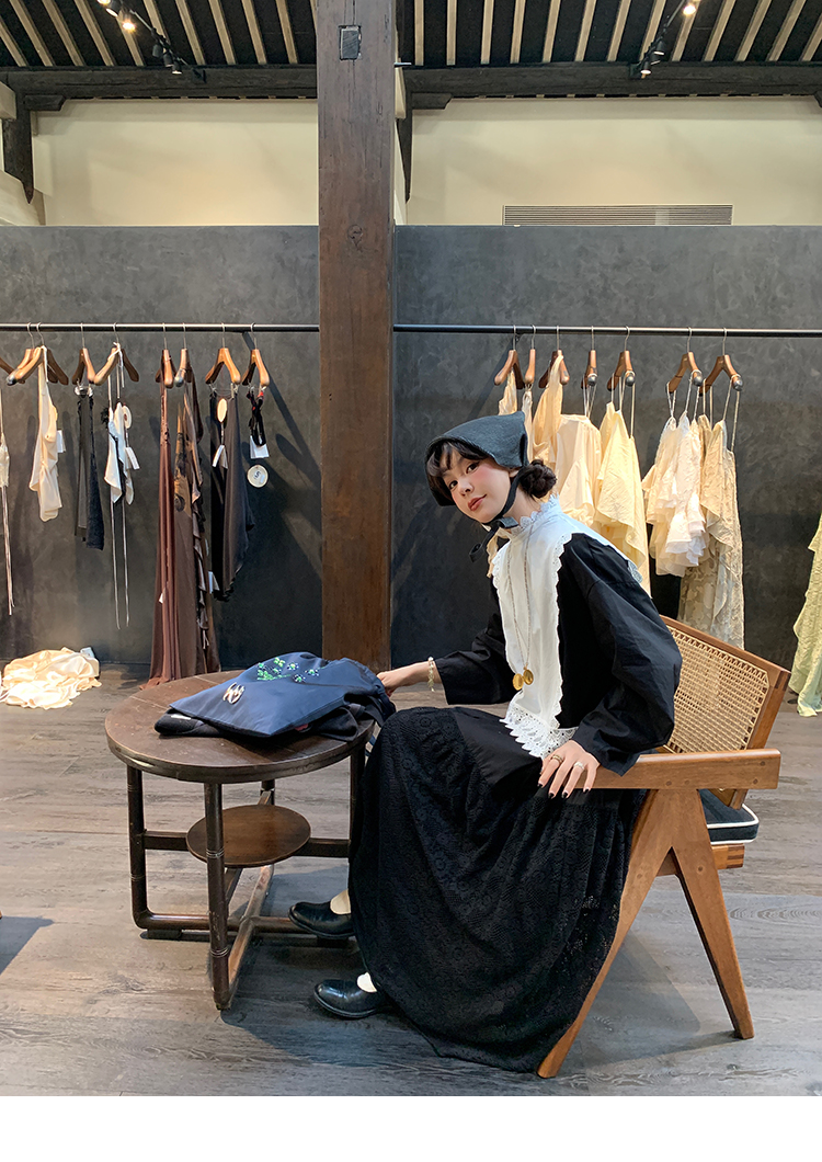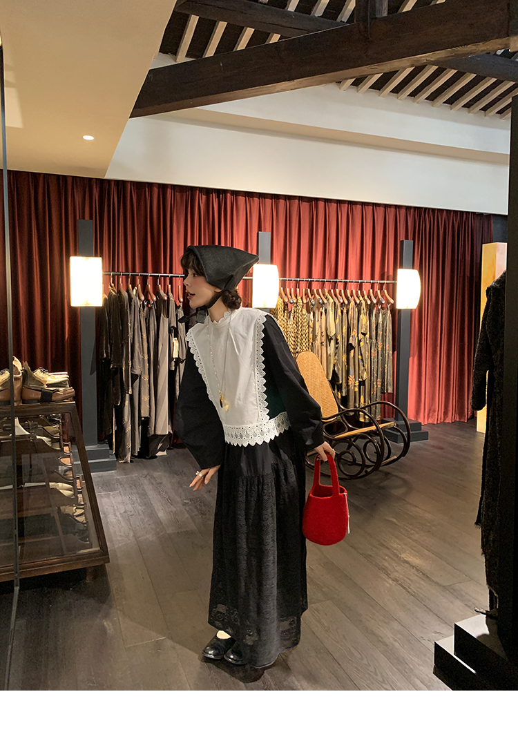LRIB Literary Dark Splicing Dress Stand Collar Lace Vest Set