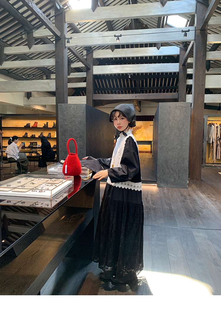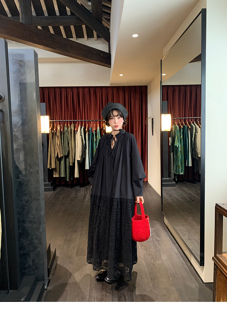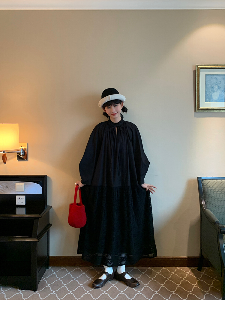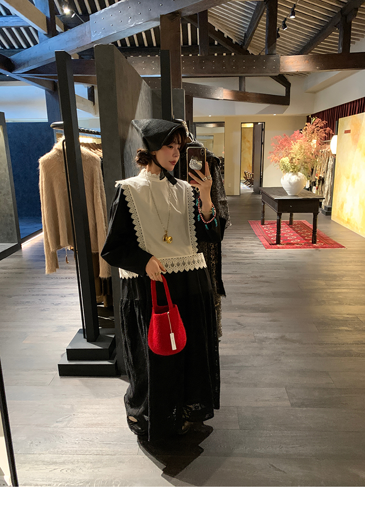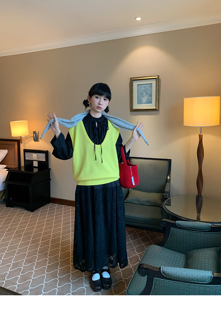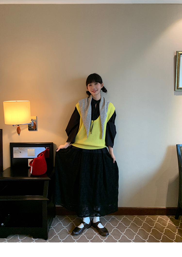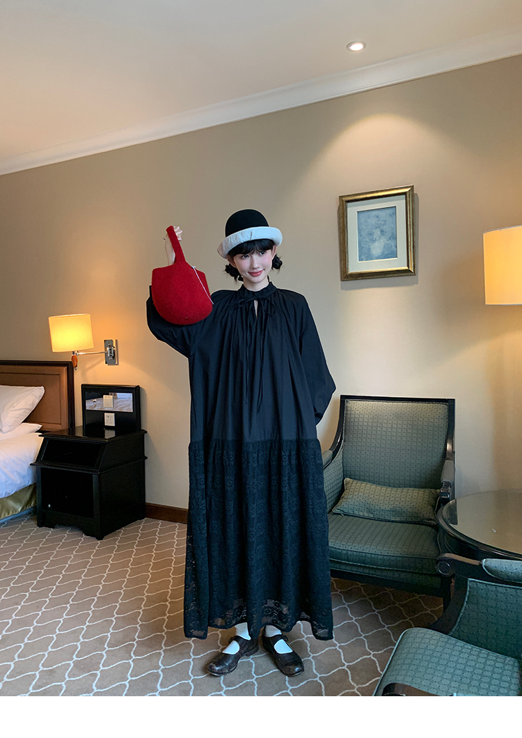 LRIB Literary Dark Splicing Dress Stand Collar Lace Vest Set