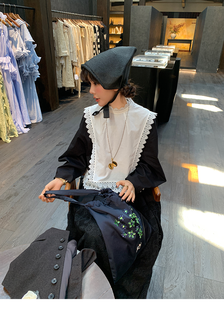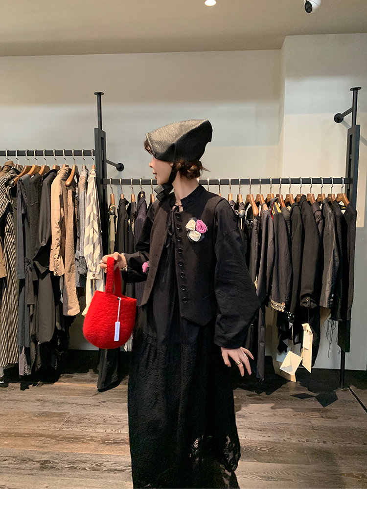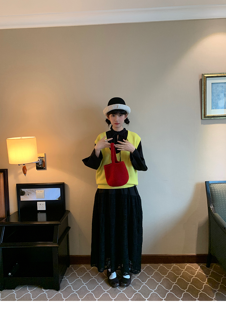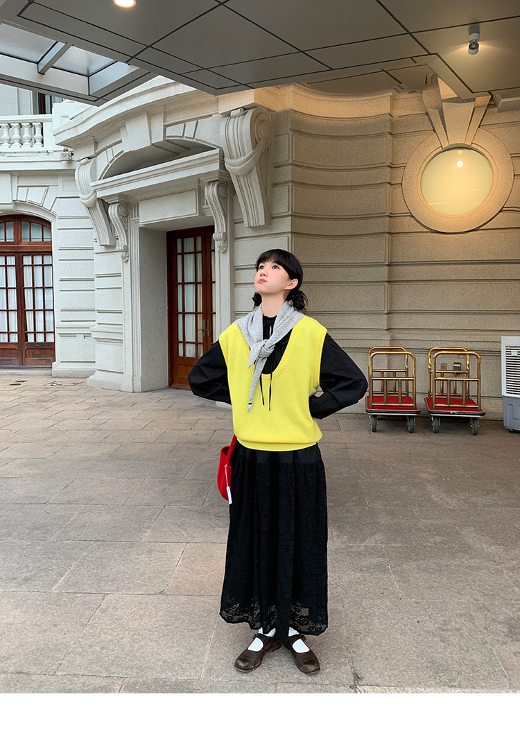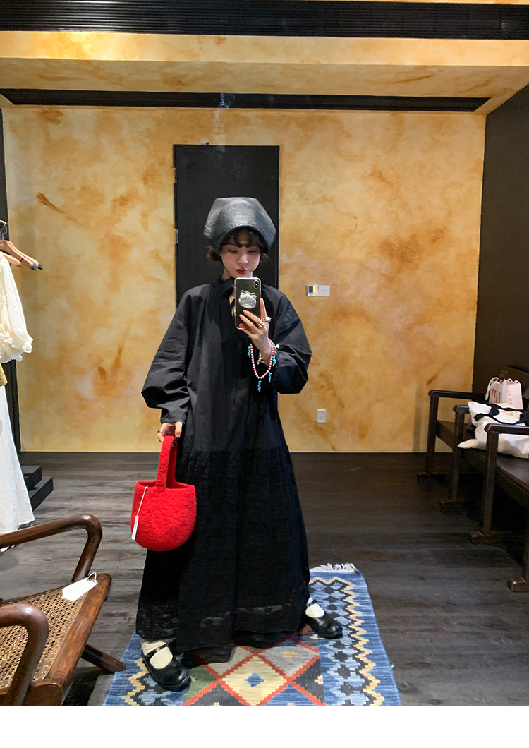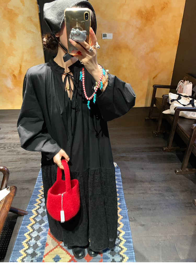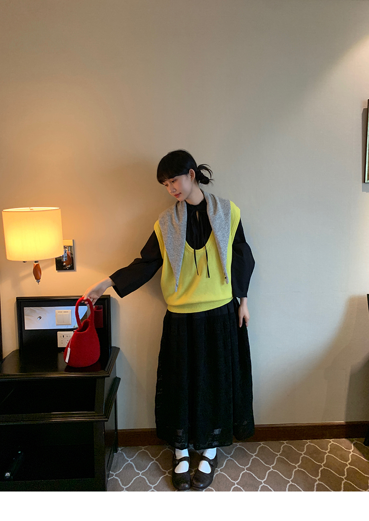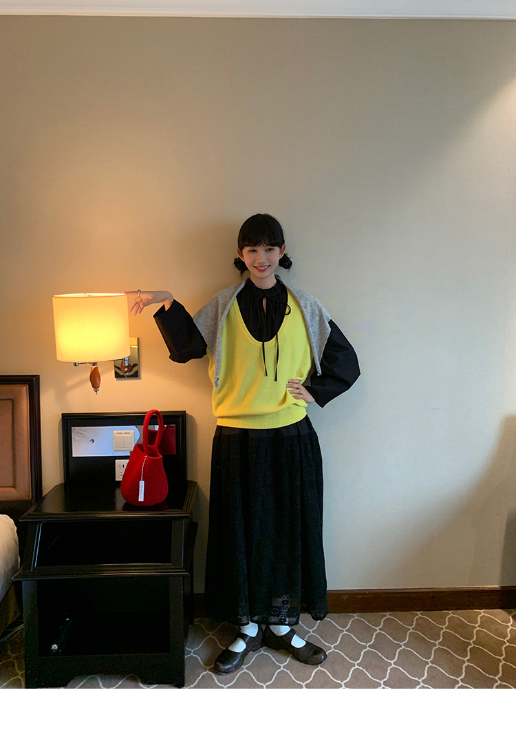LRIB Literary Dark Splicing Dress Stand Collar Lace Vest Set