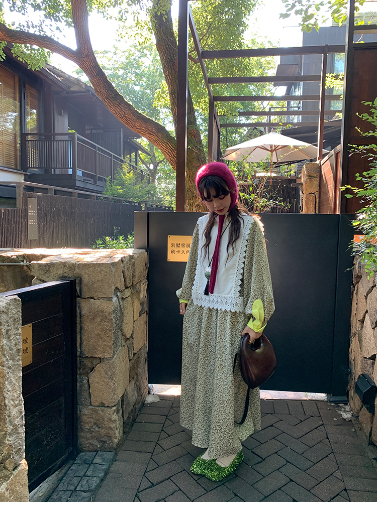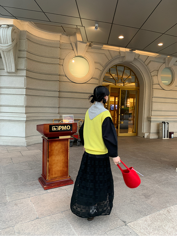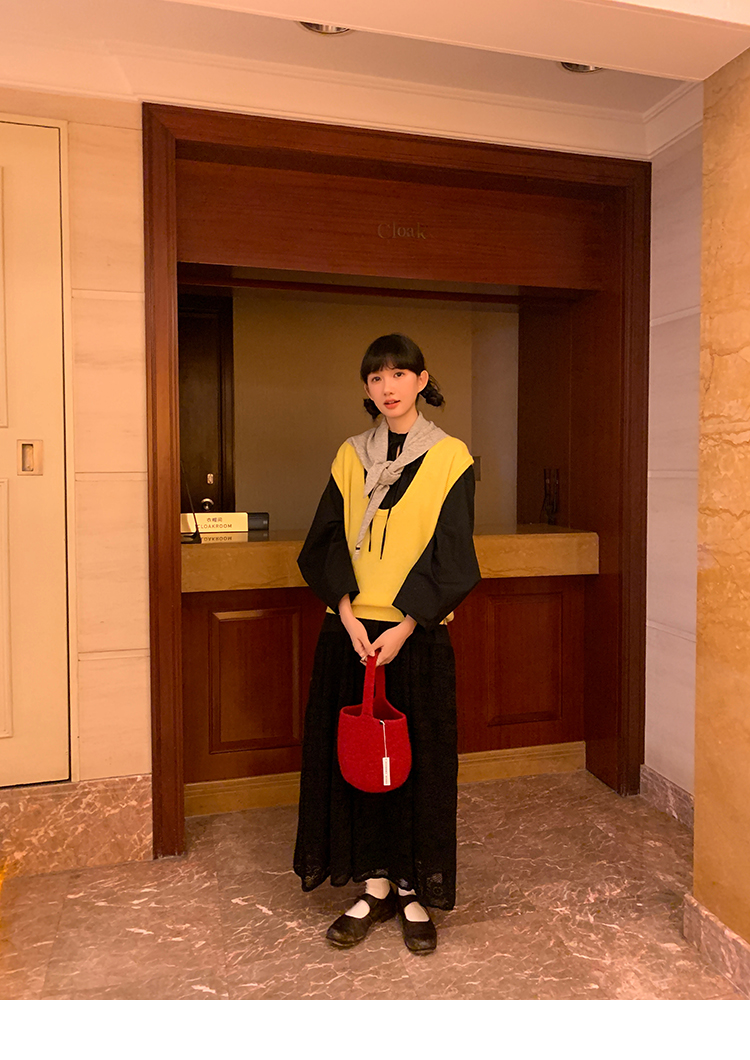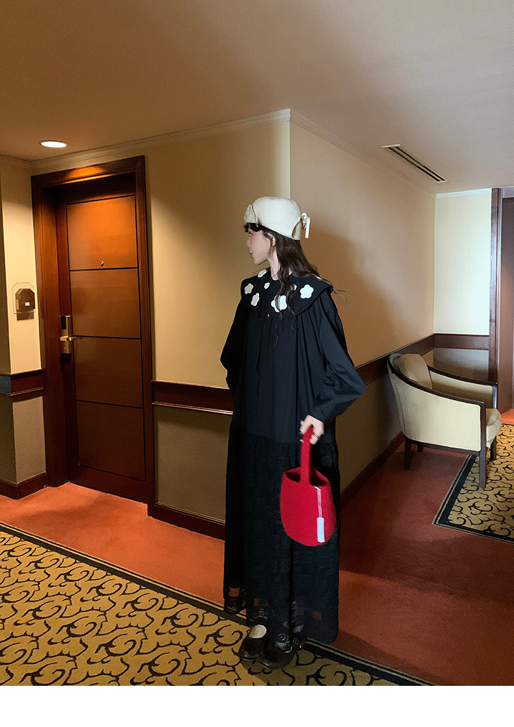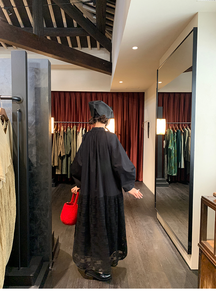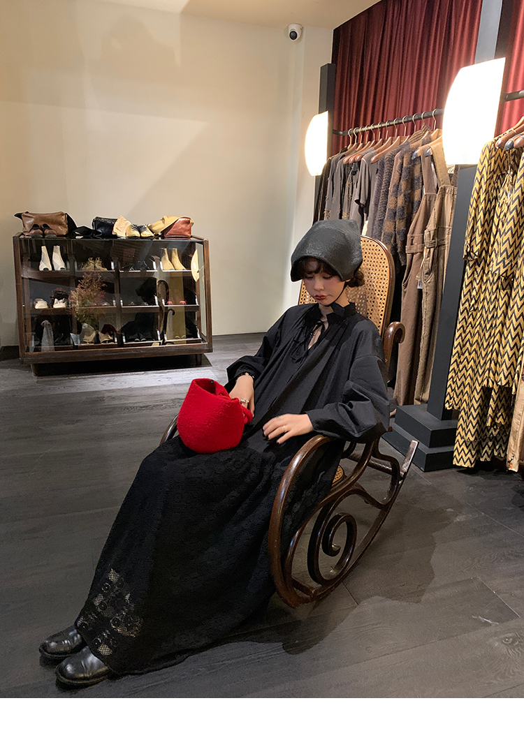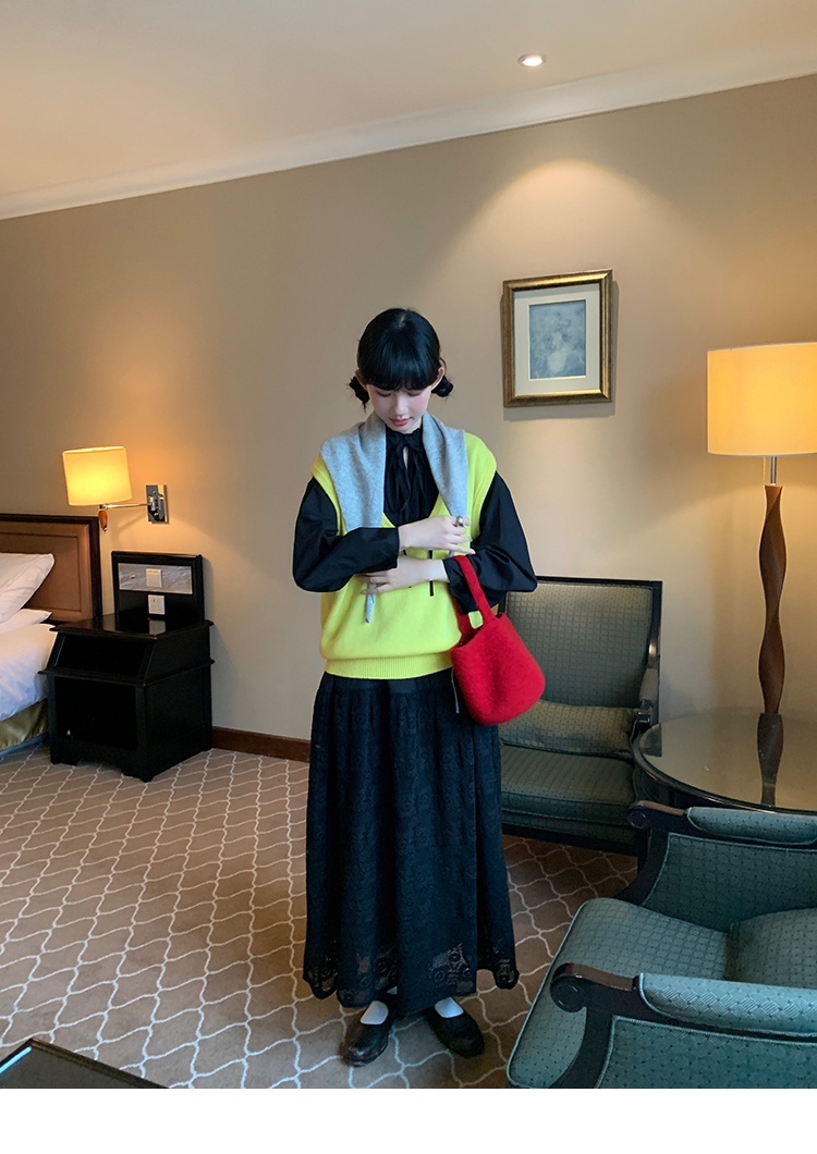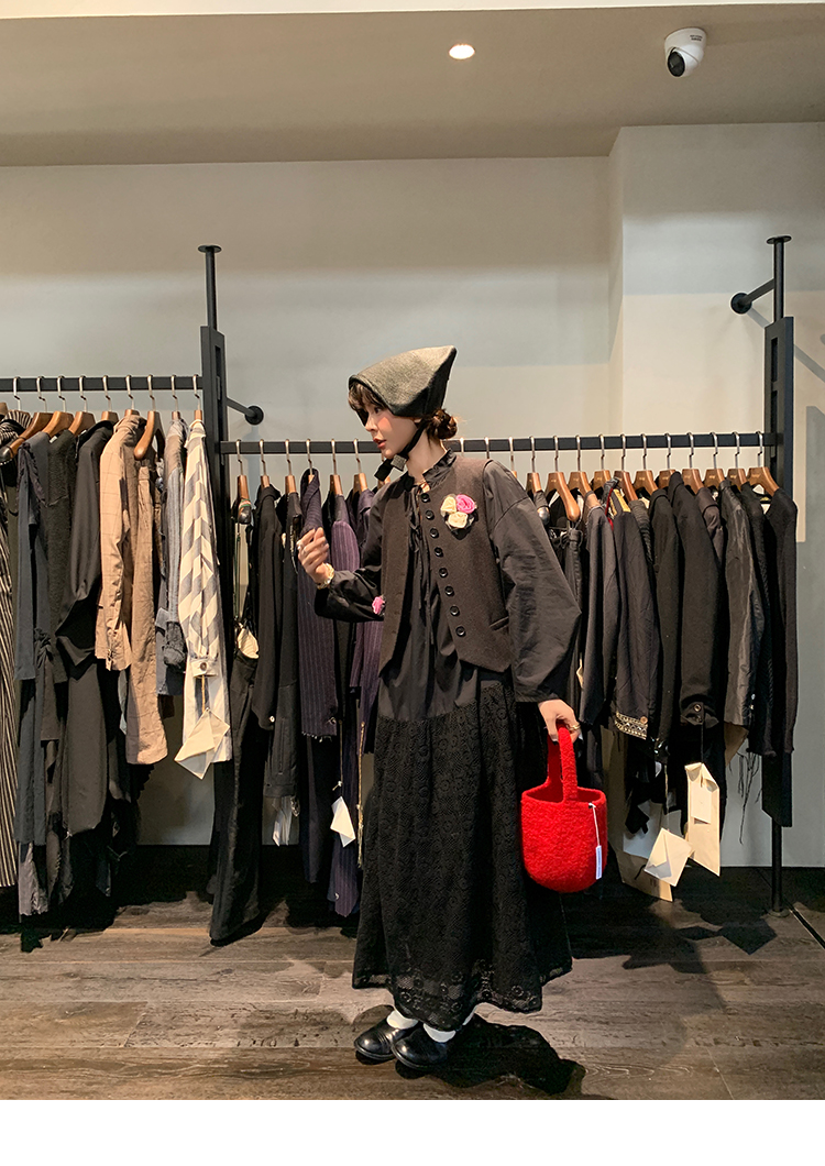 LRIB Literary Dark Splicing Dress Stand Collar Lace Vest Set