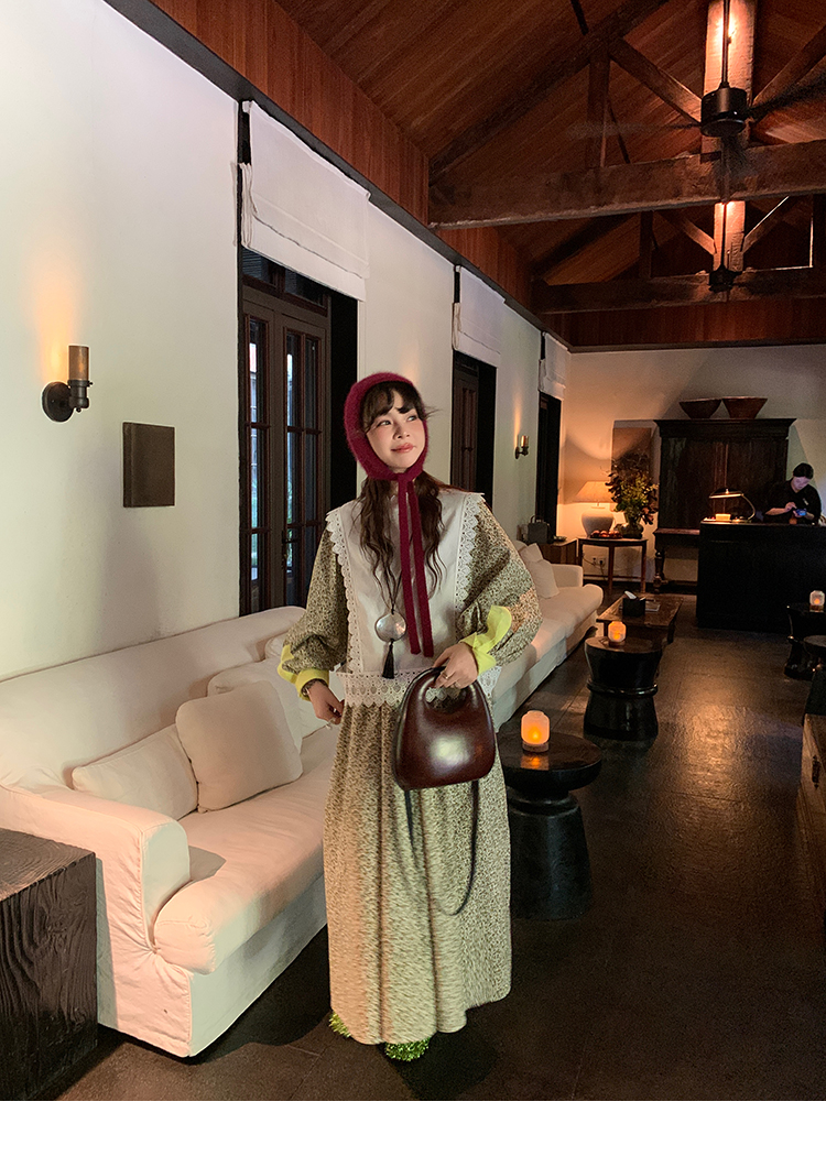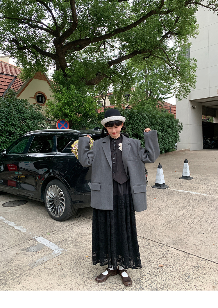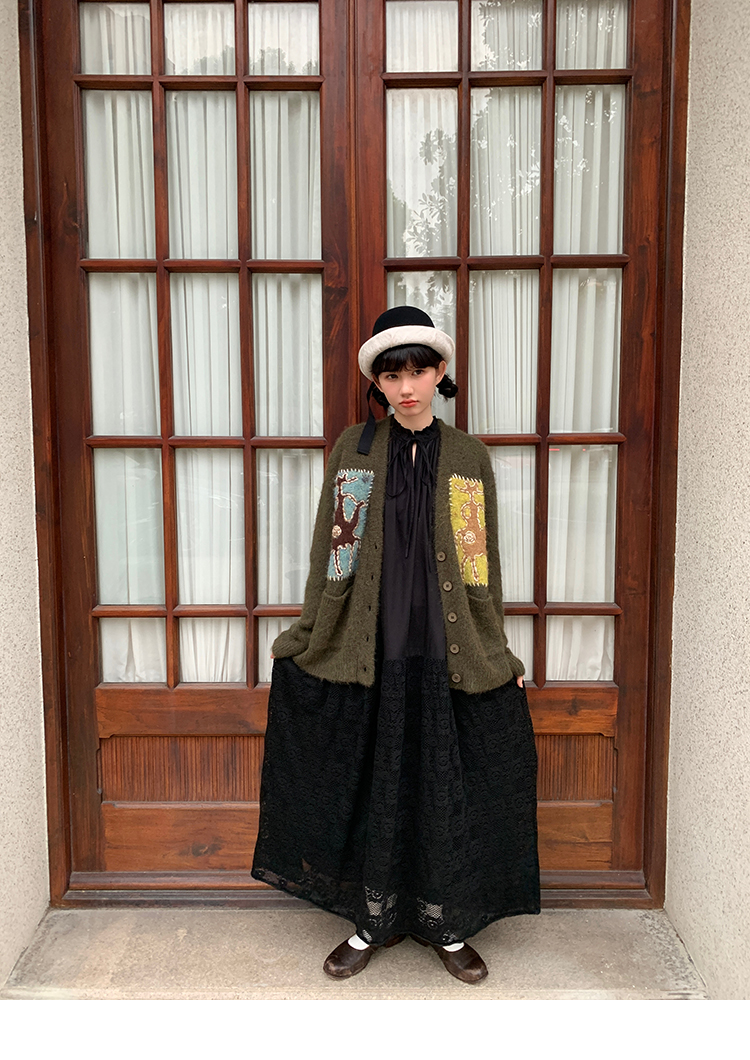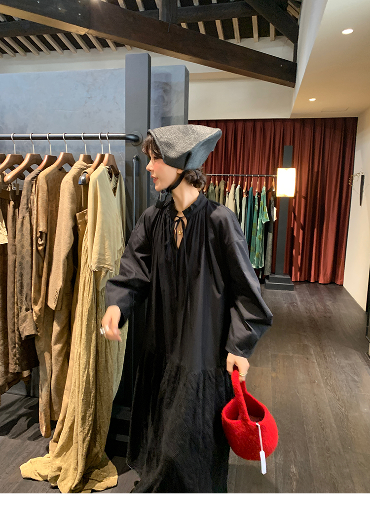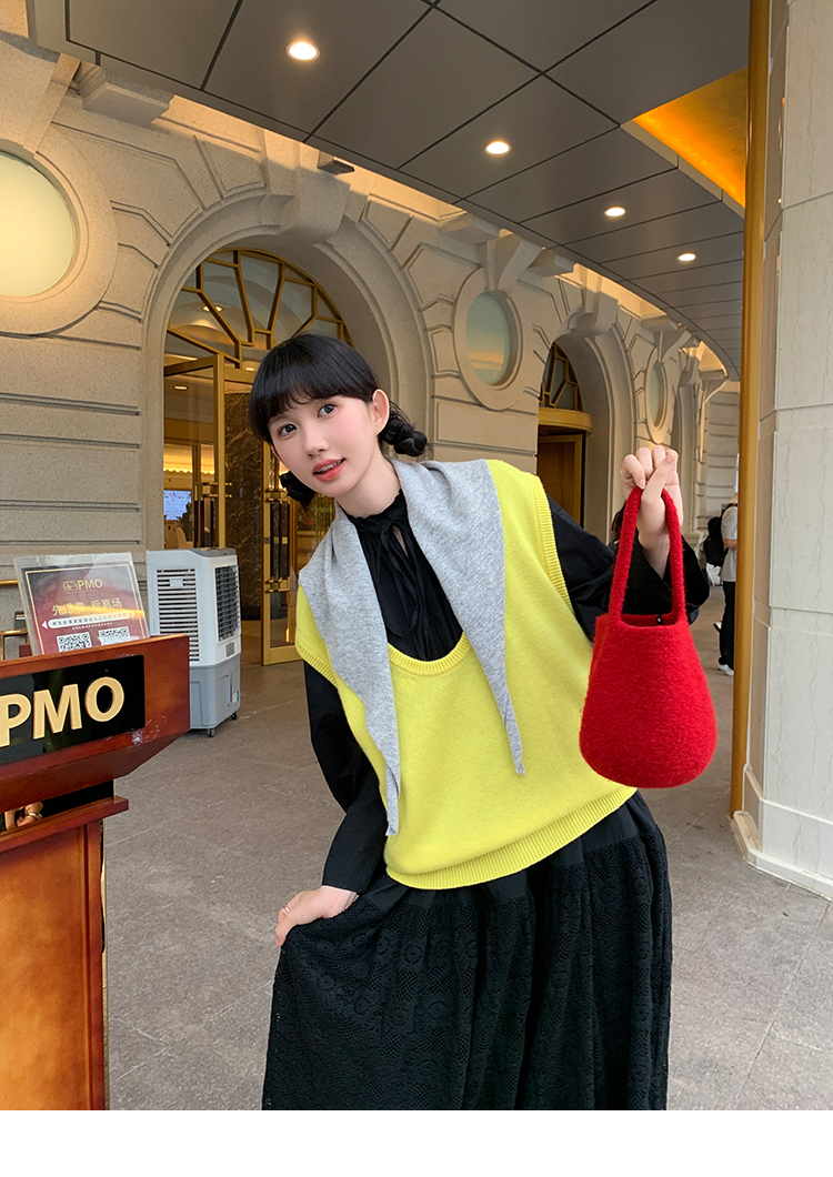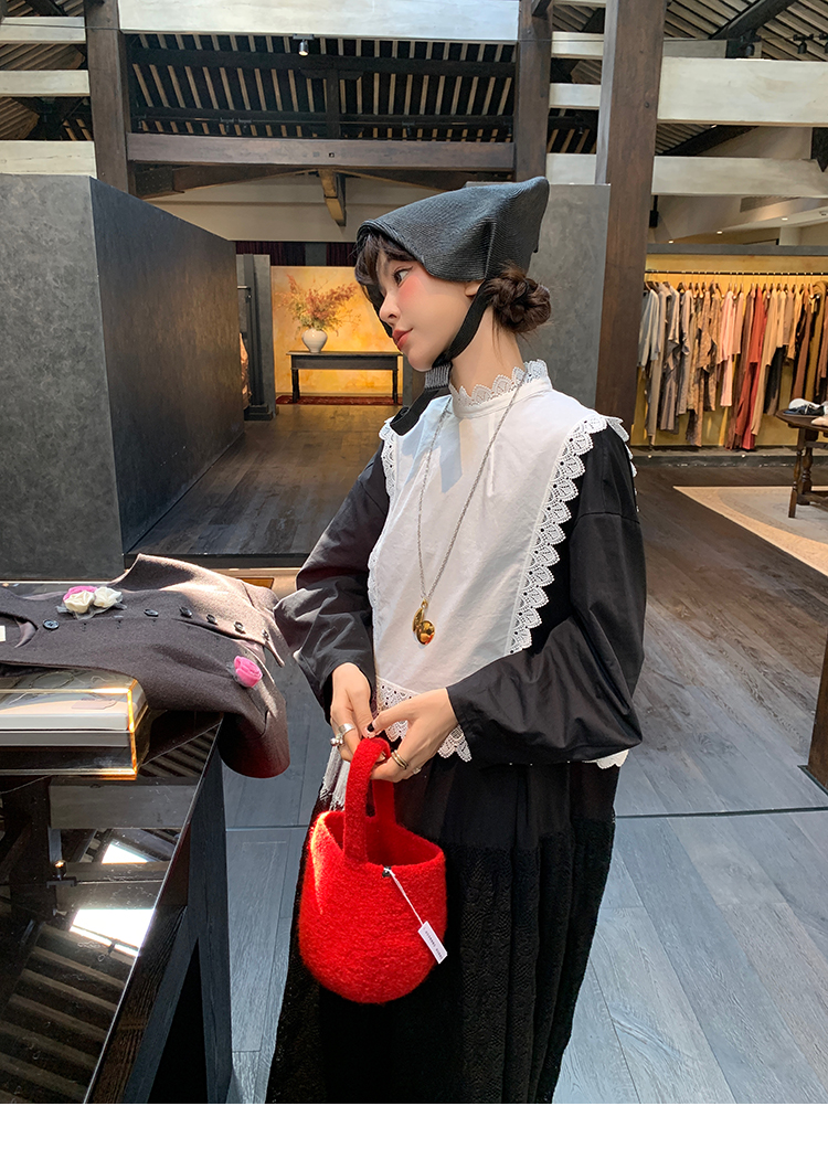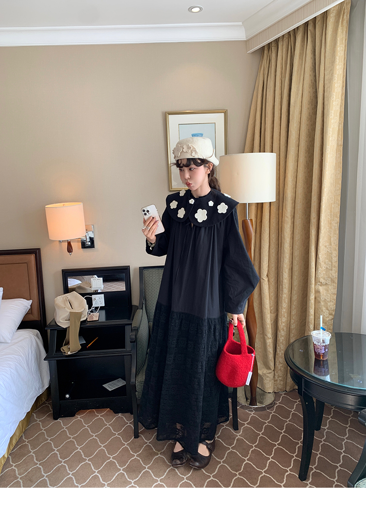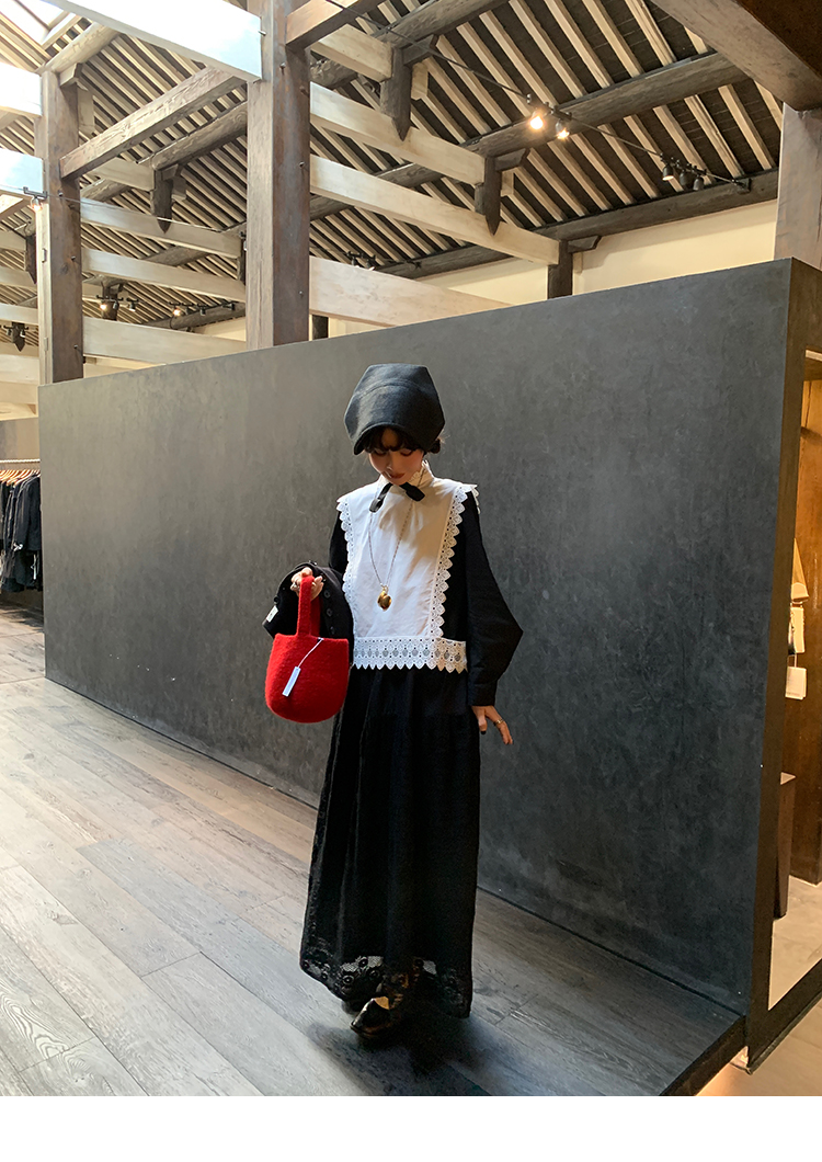 LRIB Literary Dark Splicing Dress Stand Collar Lace Vest Set