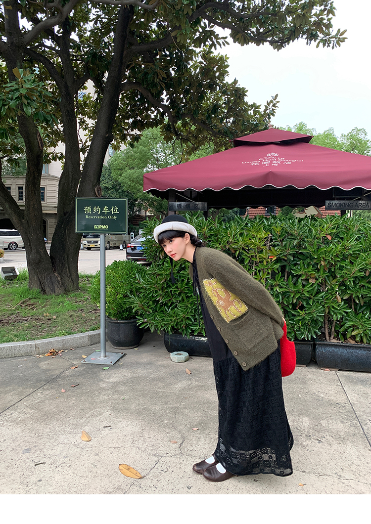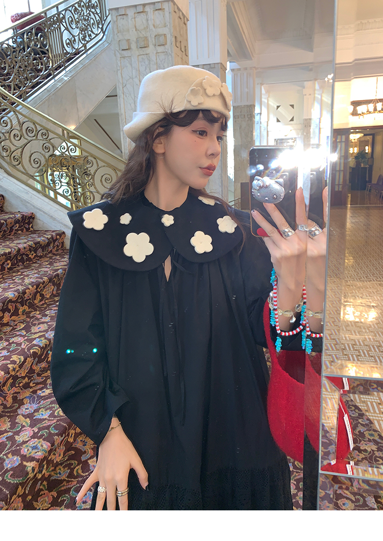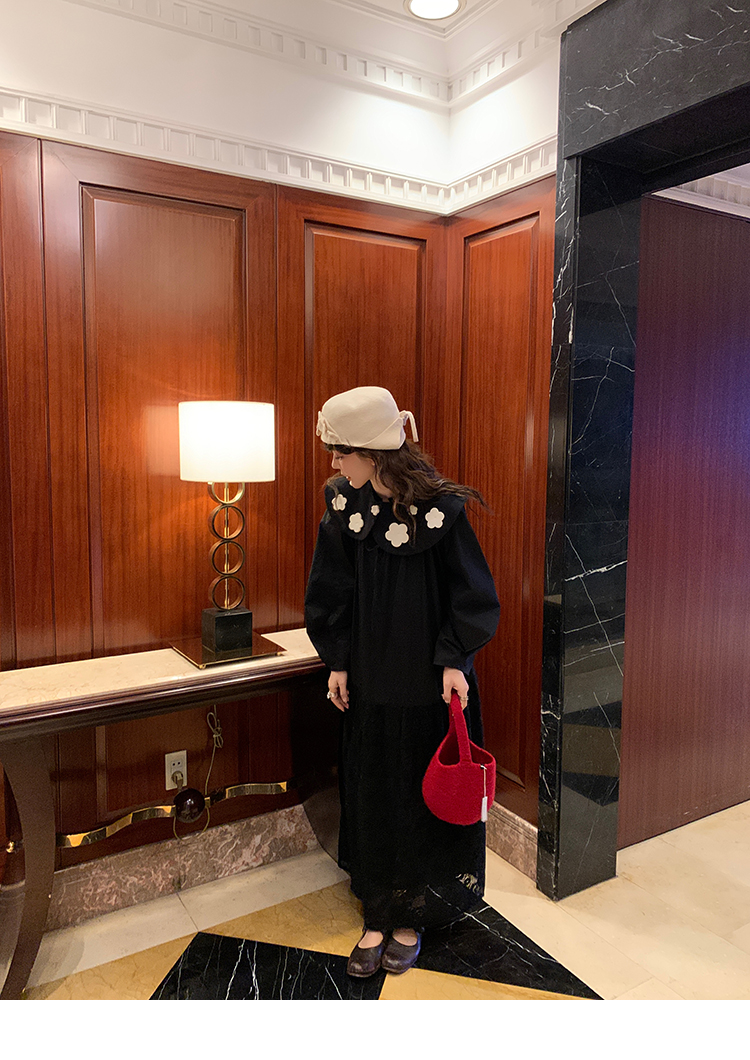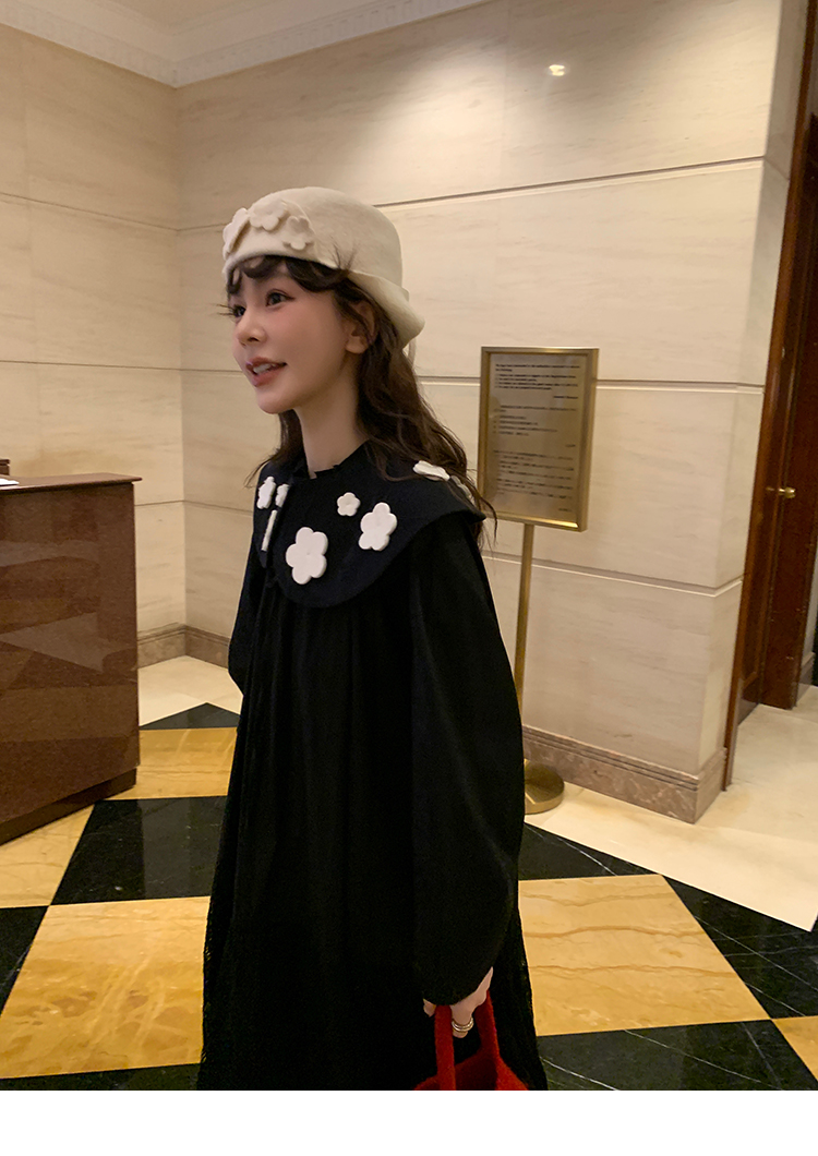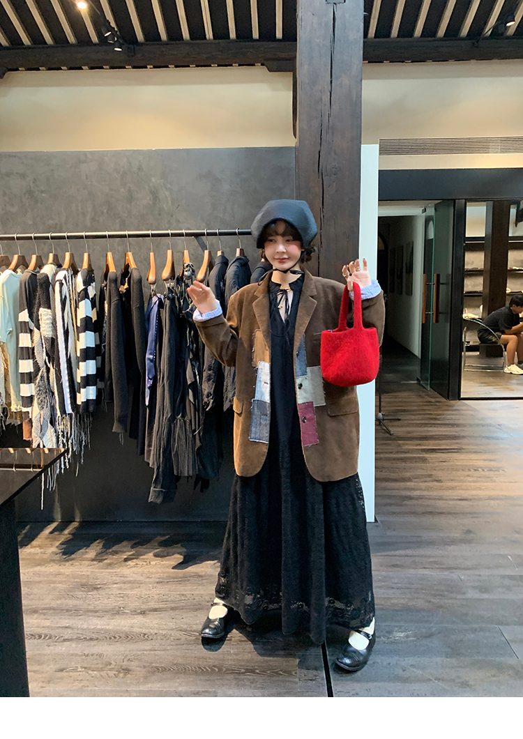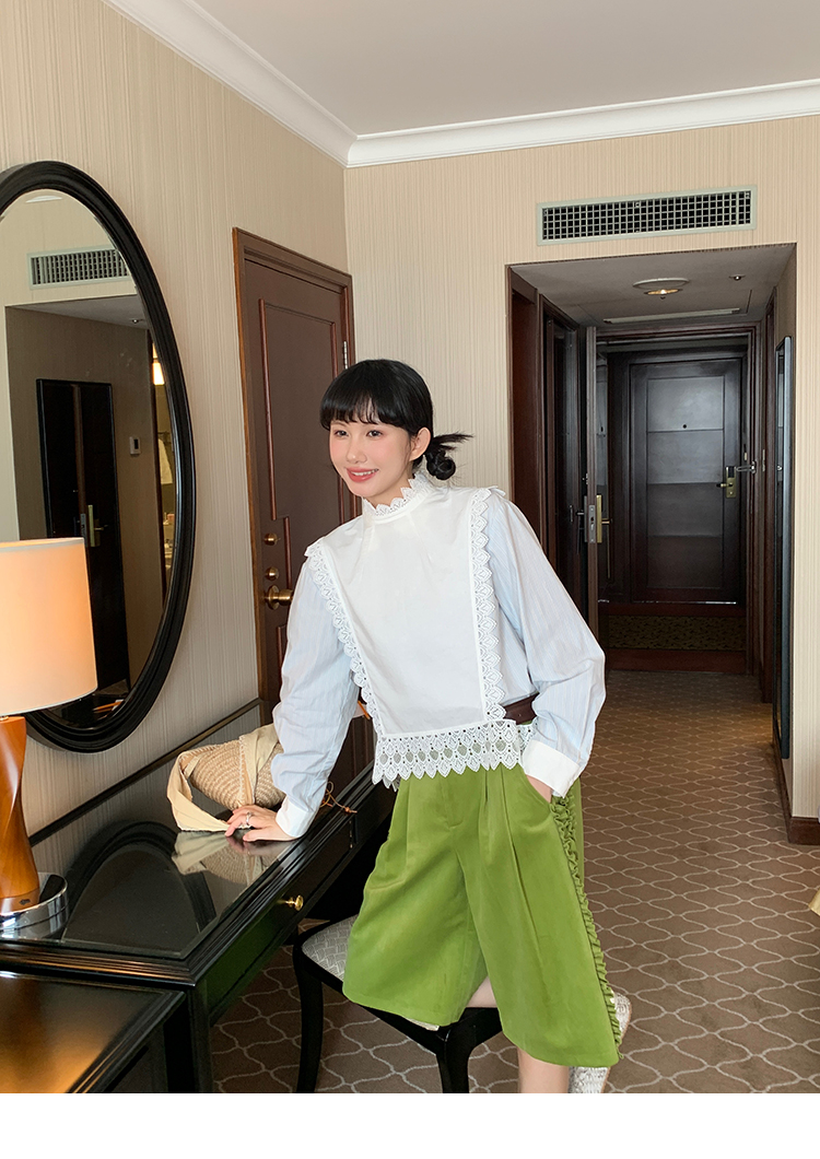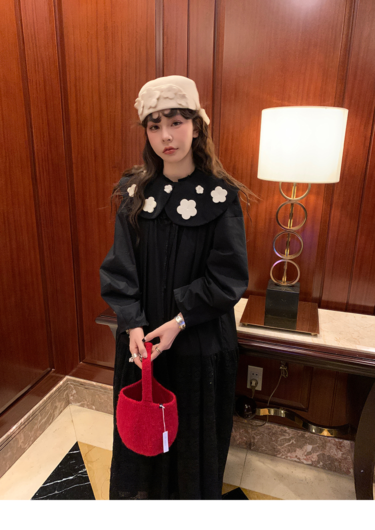 LRIB Literary Dark Splicing Dress Stand Collar Lace Vest Set