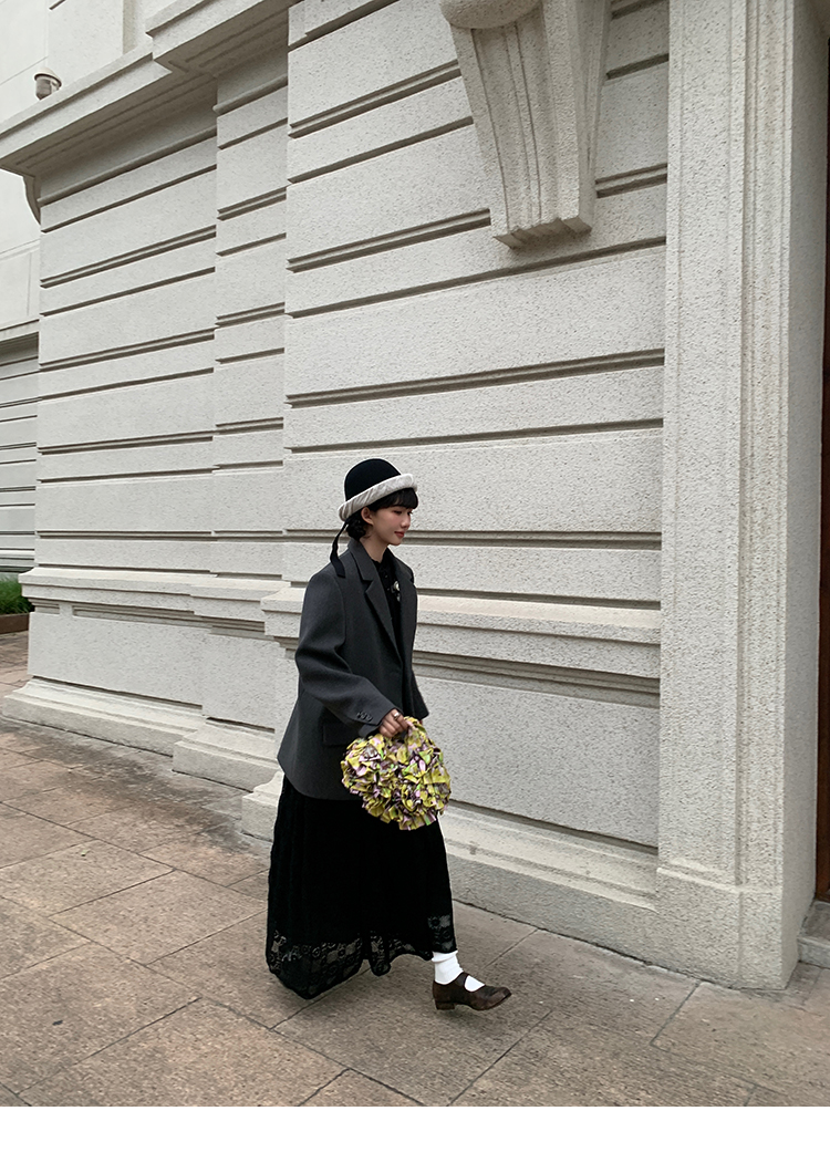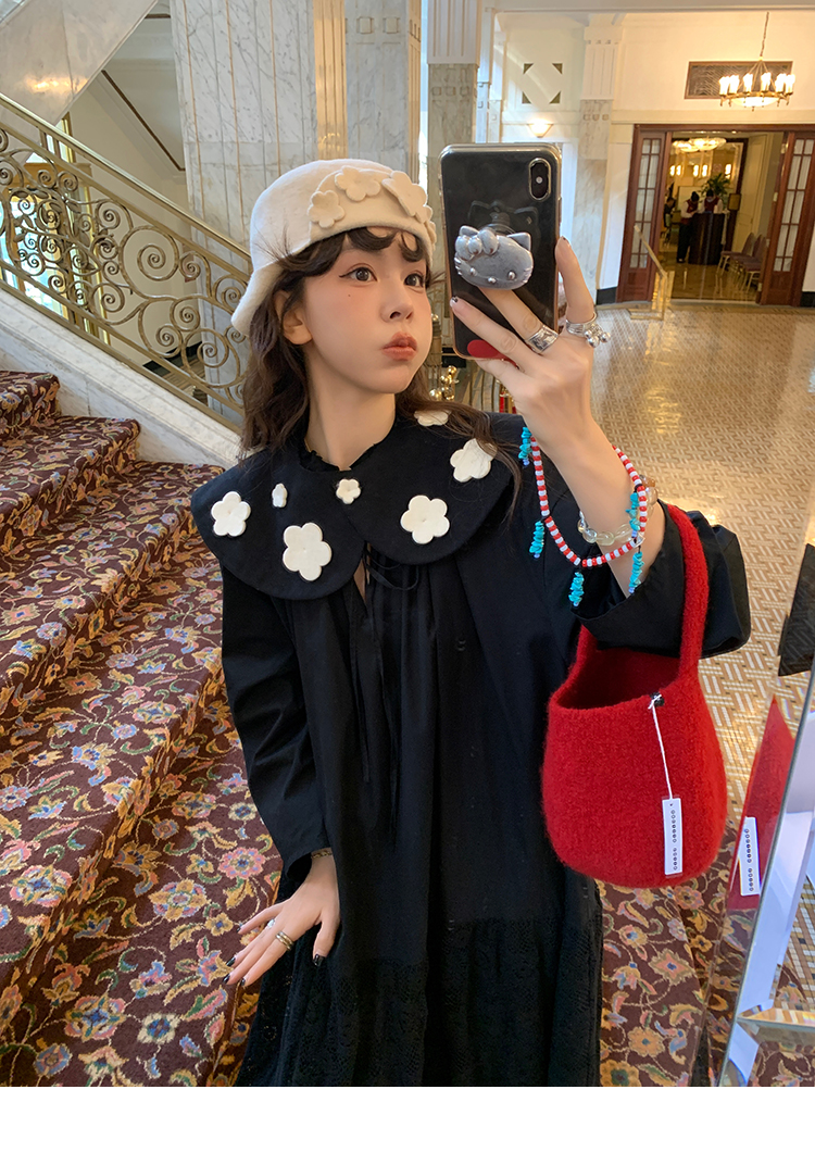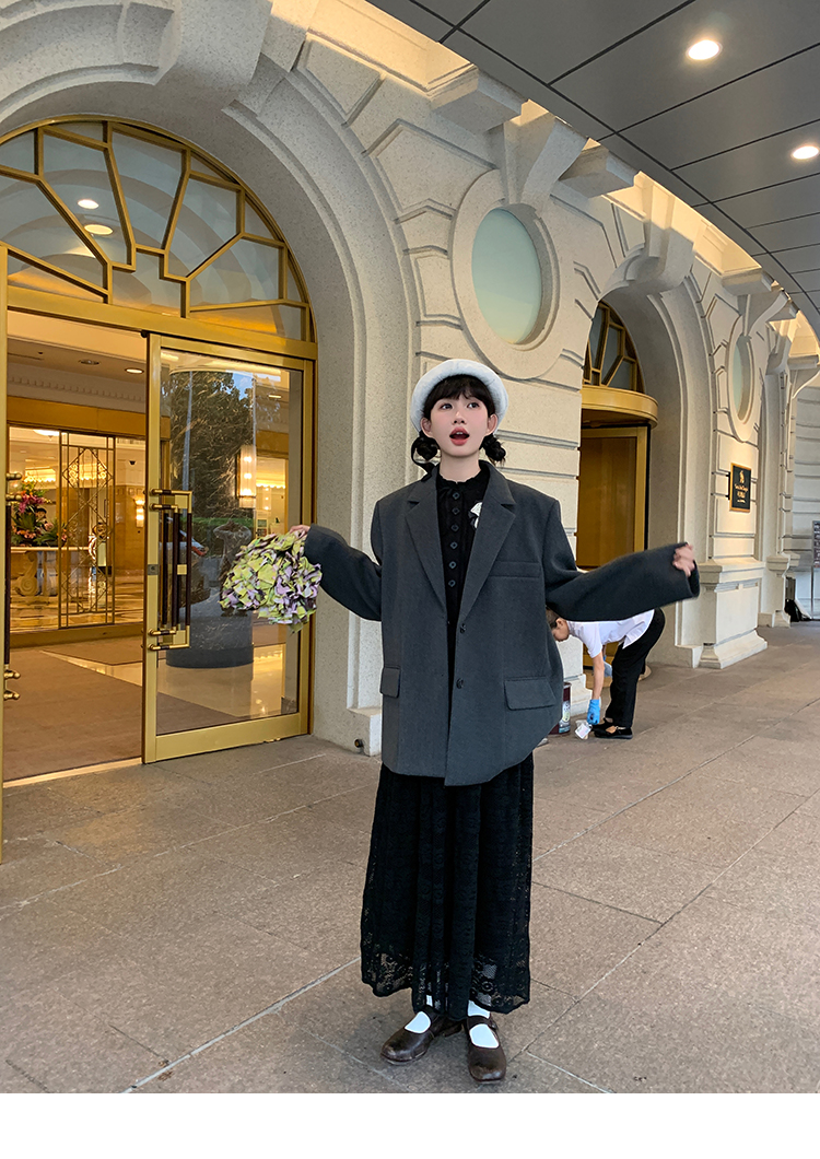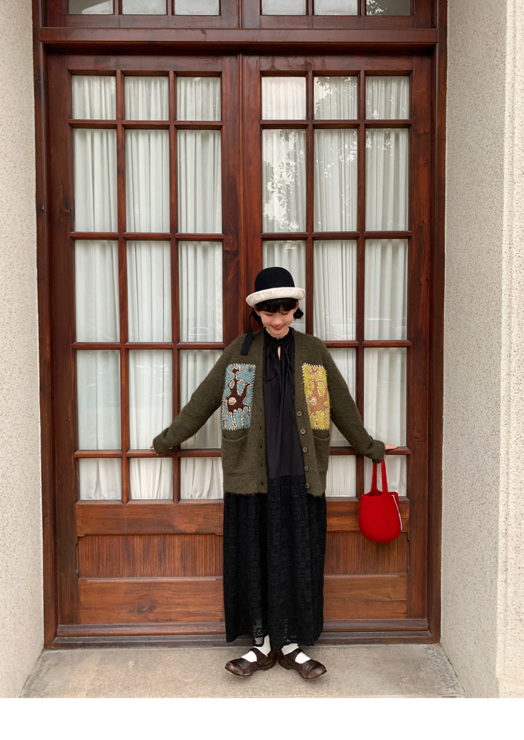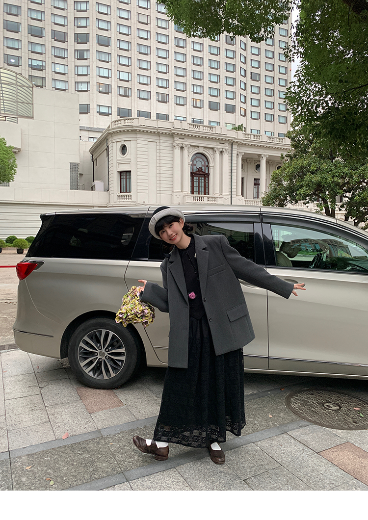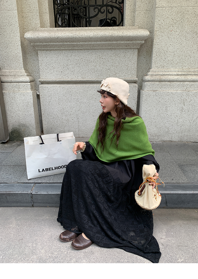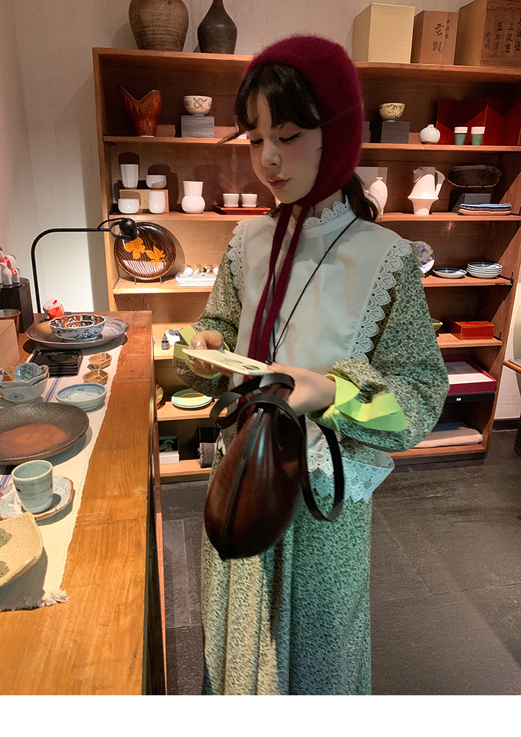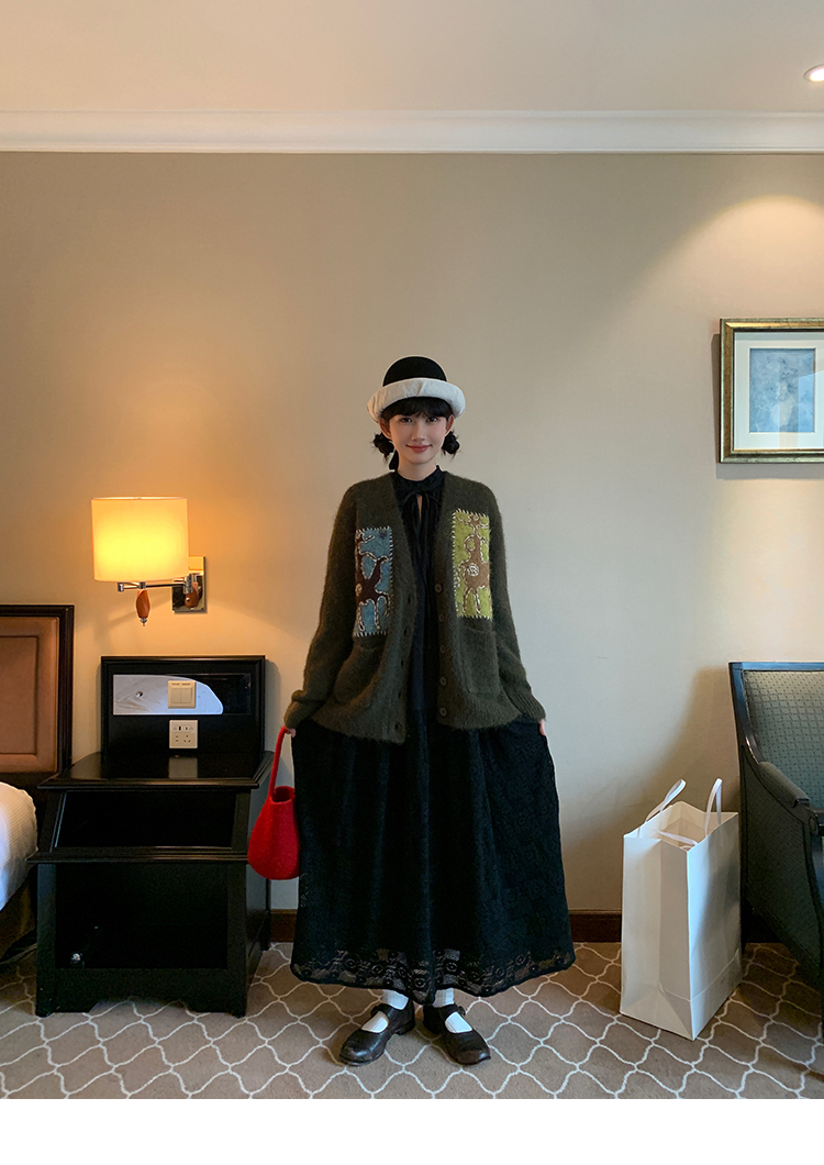 LRIB Literary Dark Splicing Dress Stand Collar Lace Vest Set