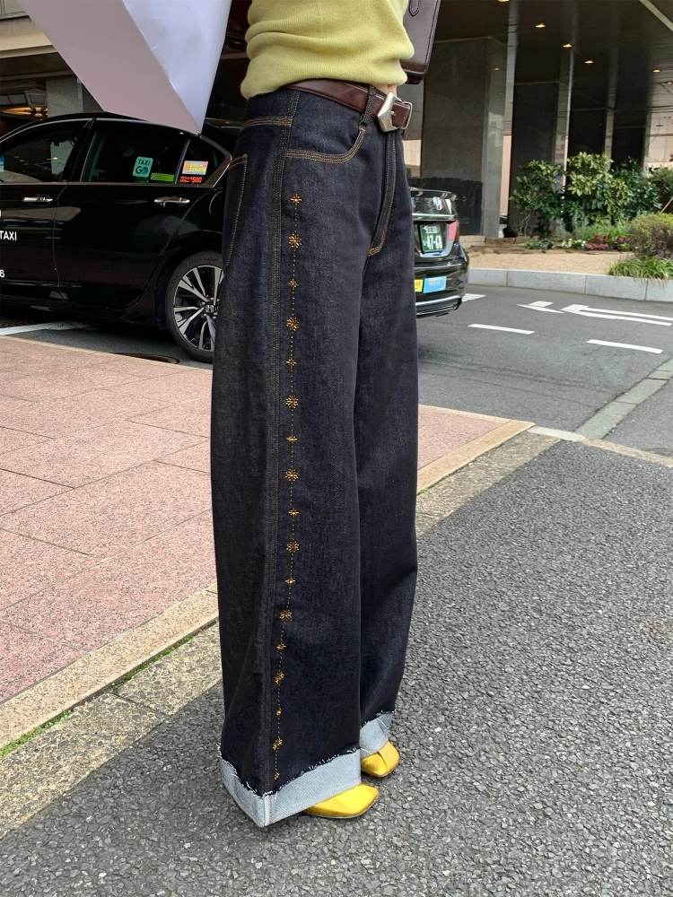 LRIB denim track retro raw gold beaded straight cuff jeans