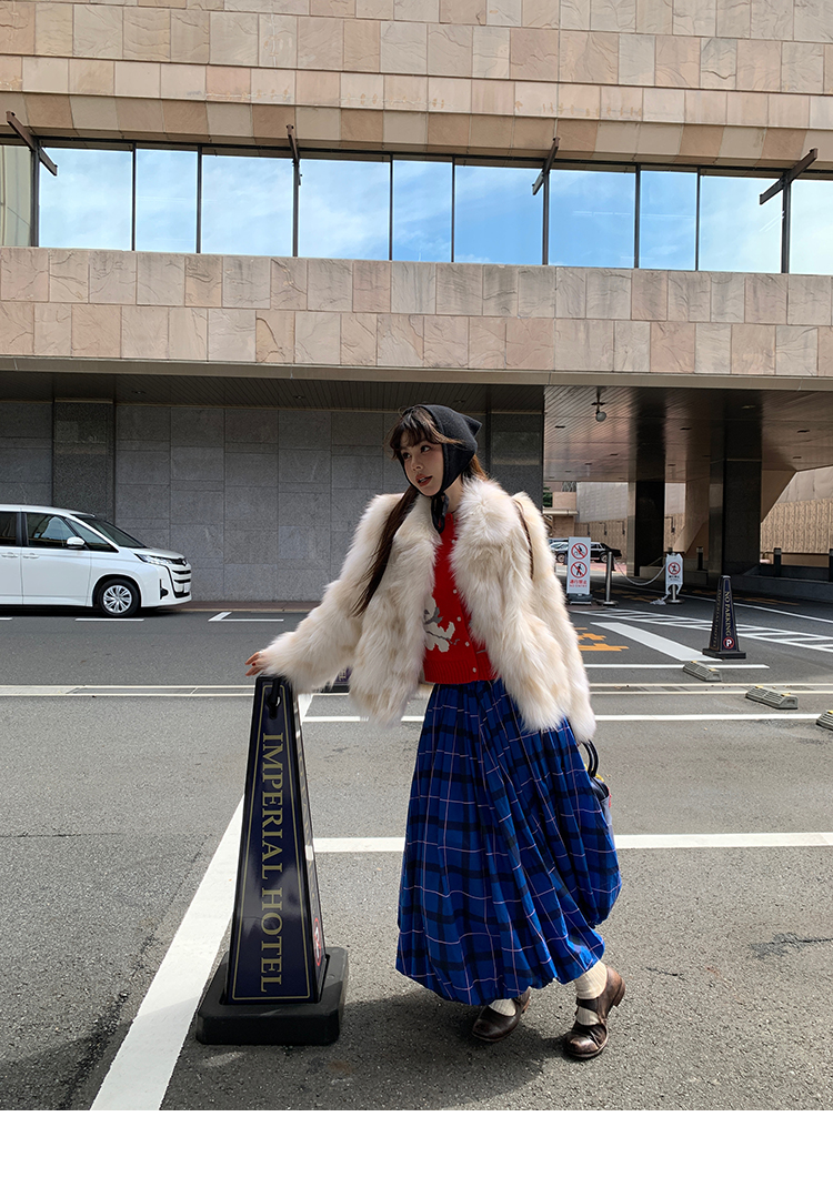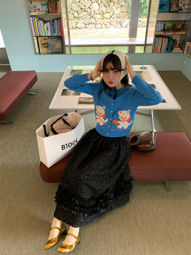 LRIB cat yarn ball contrast color jacquard round neck wool cardigan