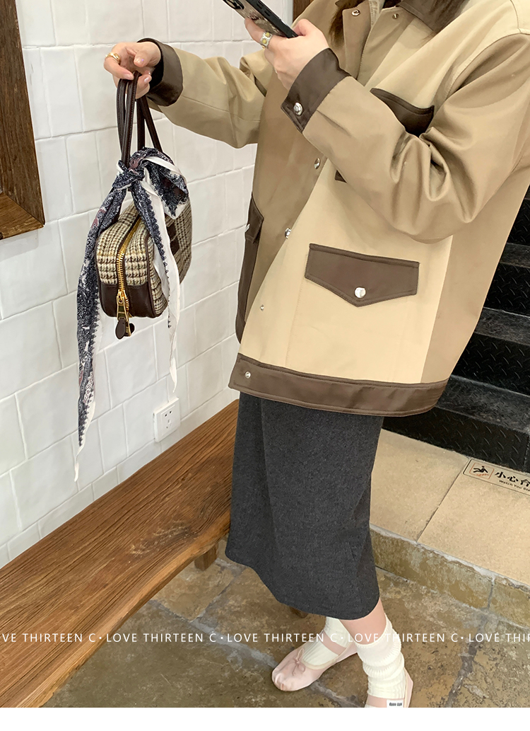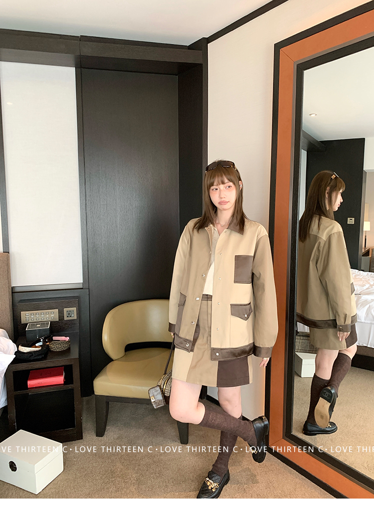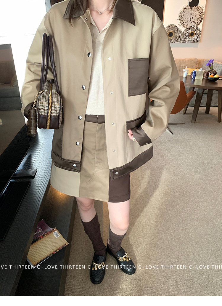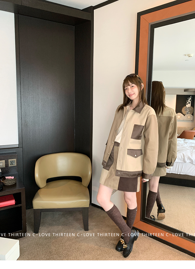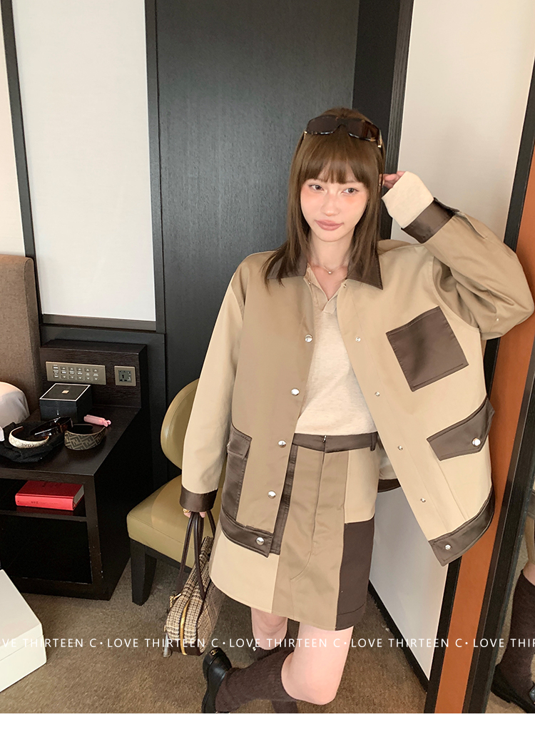 TC Autumn color contrast stitching trench coat + A-line skirt set