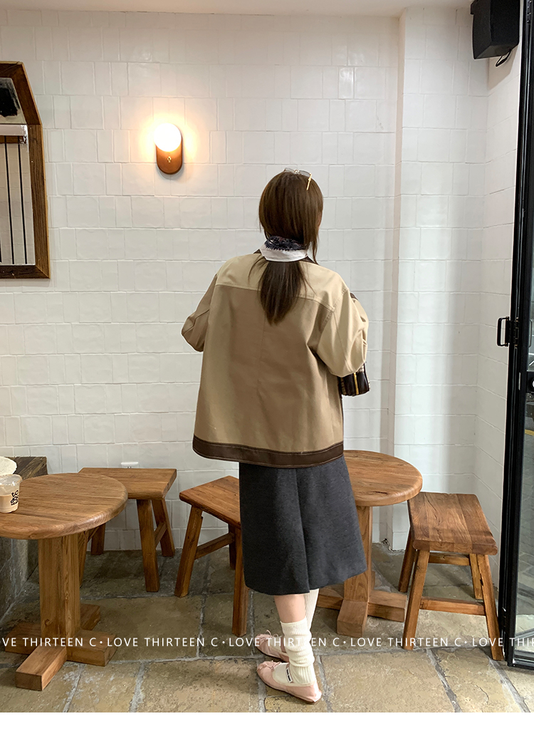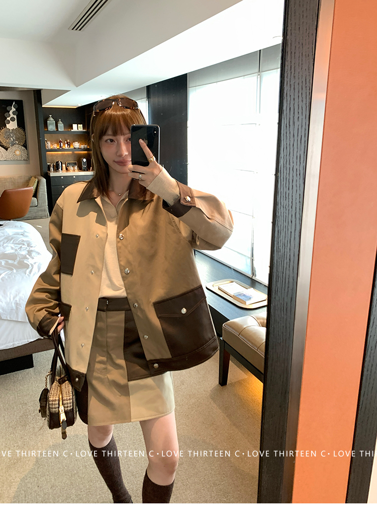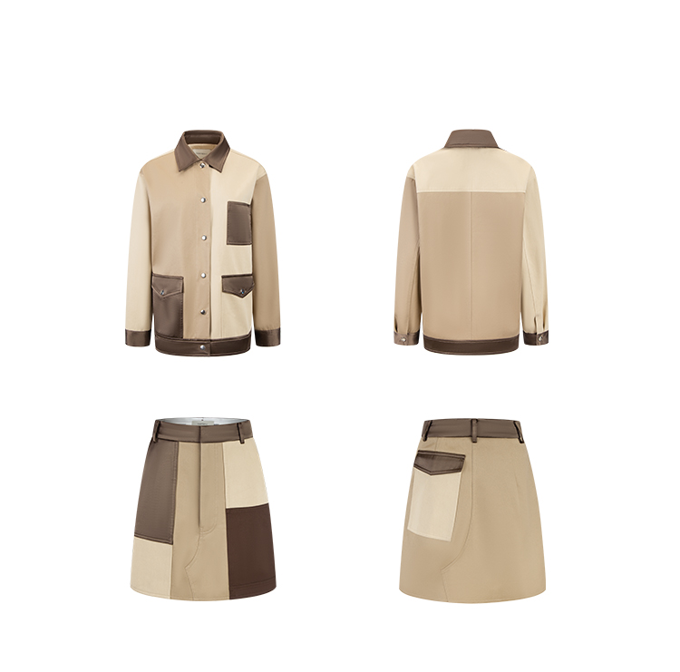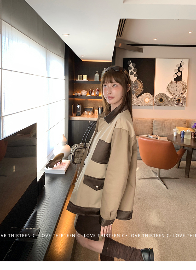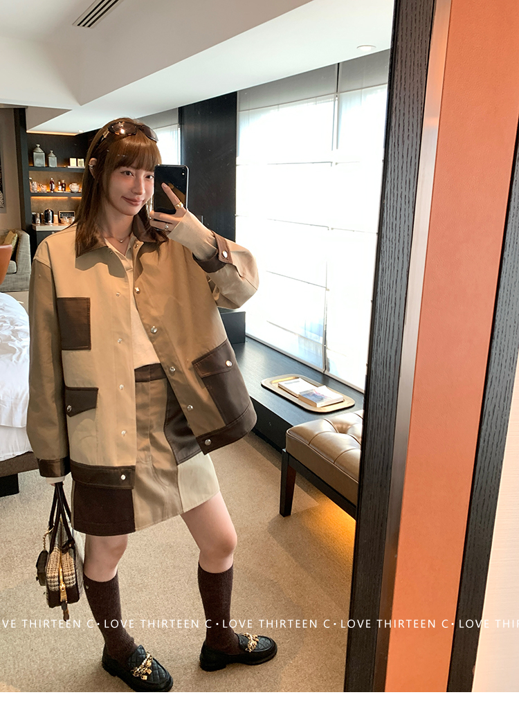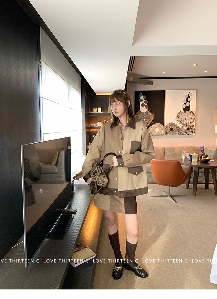 TC Autumn color contrast stitching trench coat + A-line skirt set