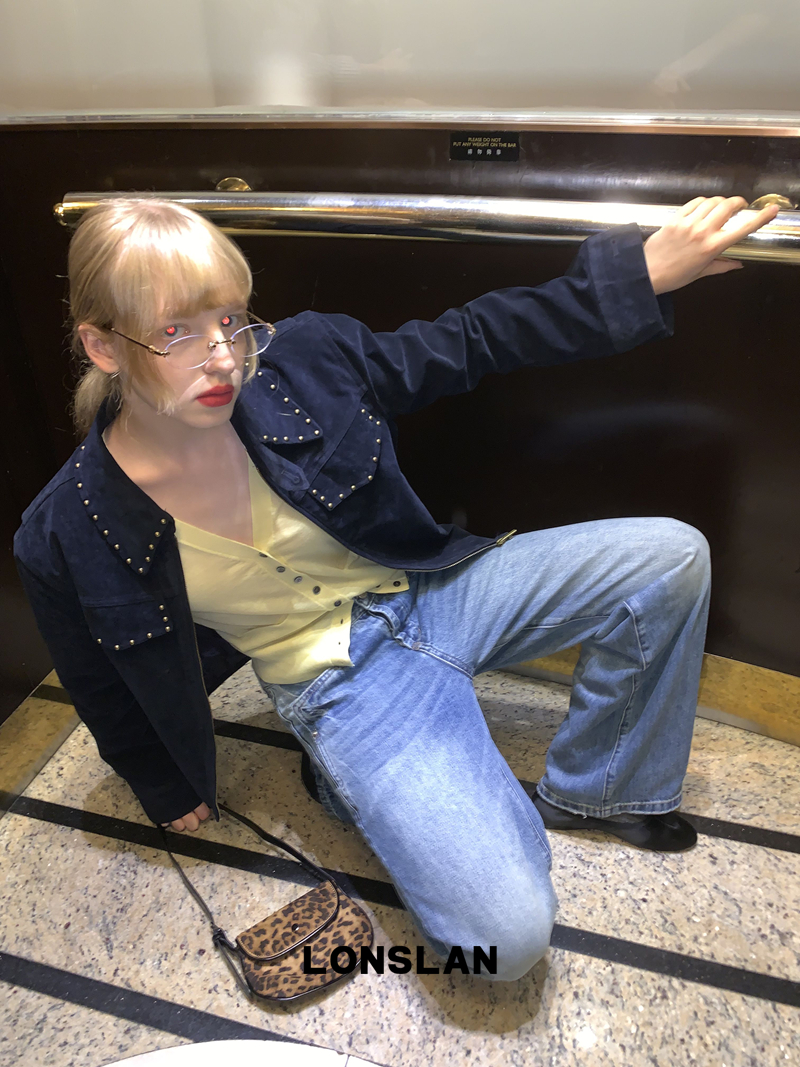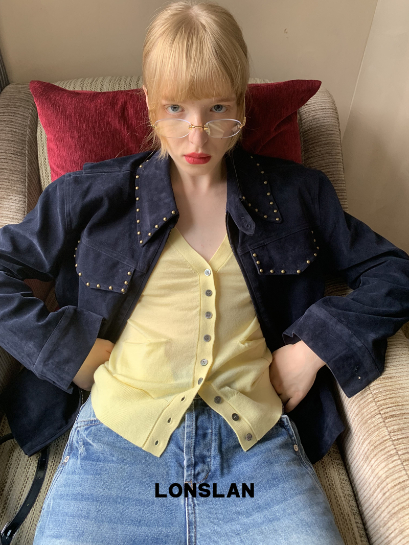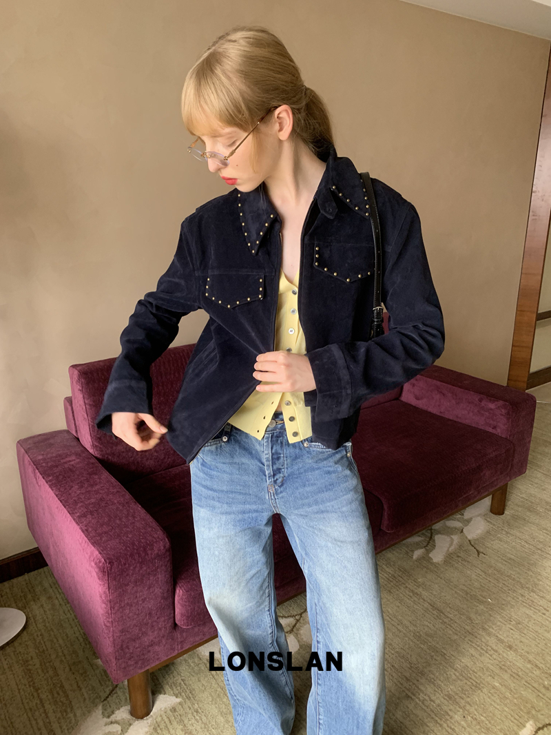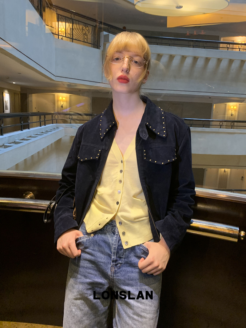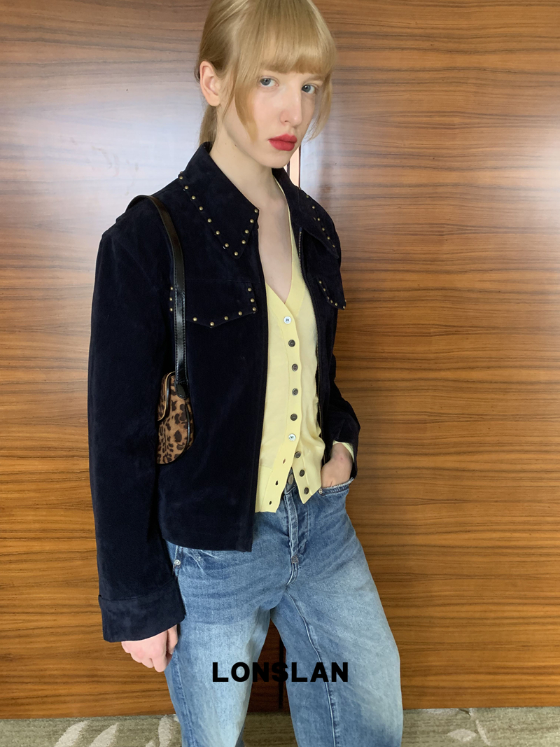 LONSLAN rivet design short suede motorcycle jacket