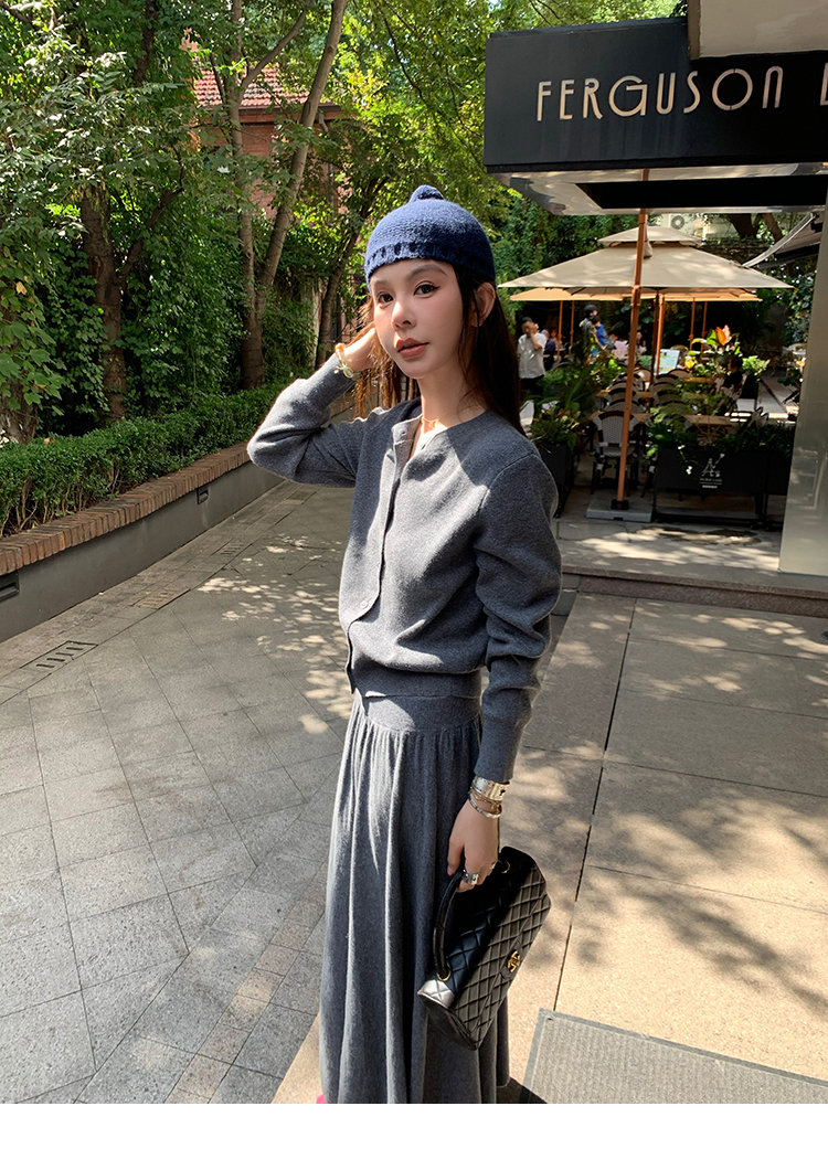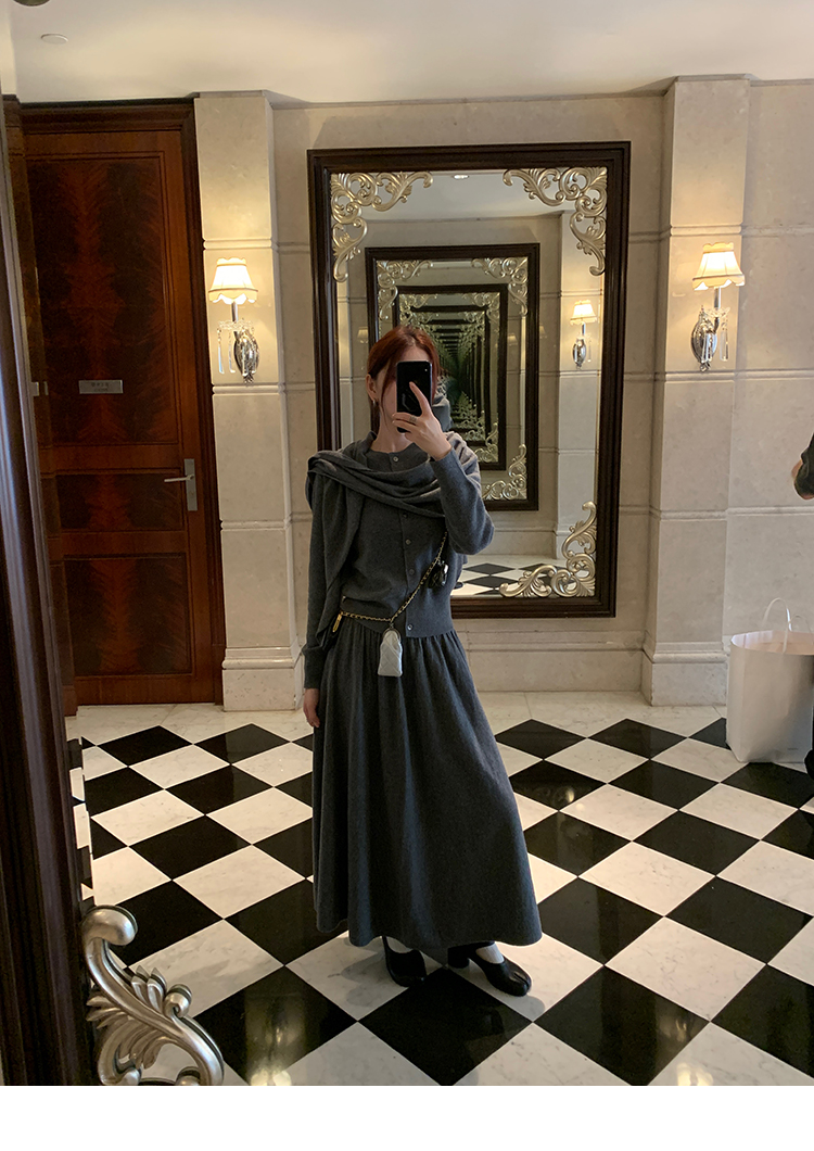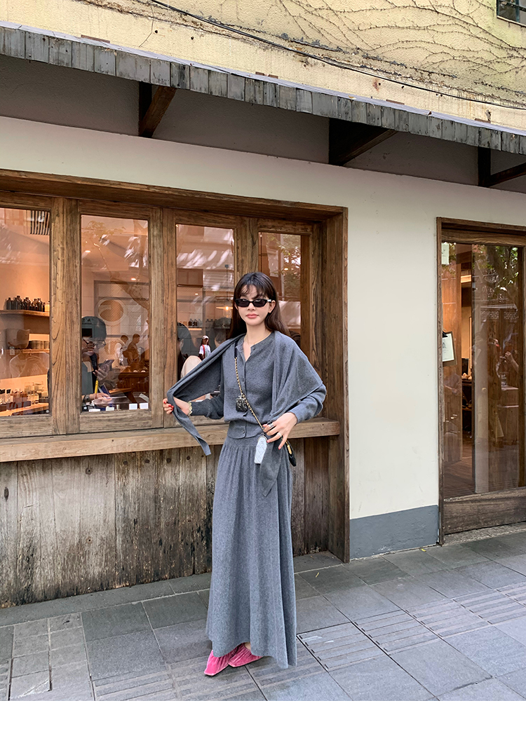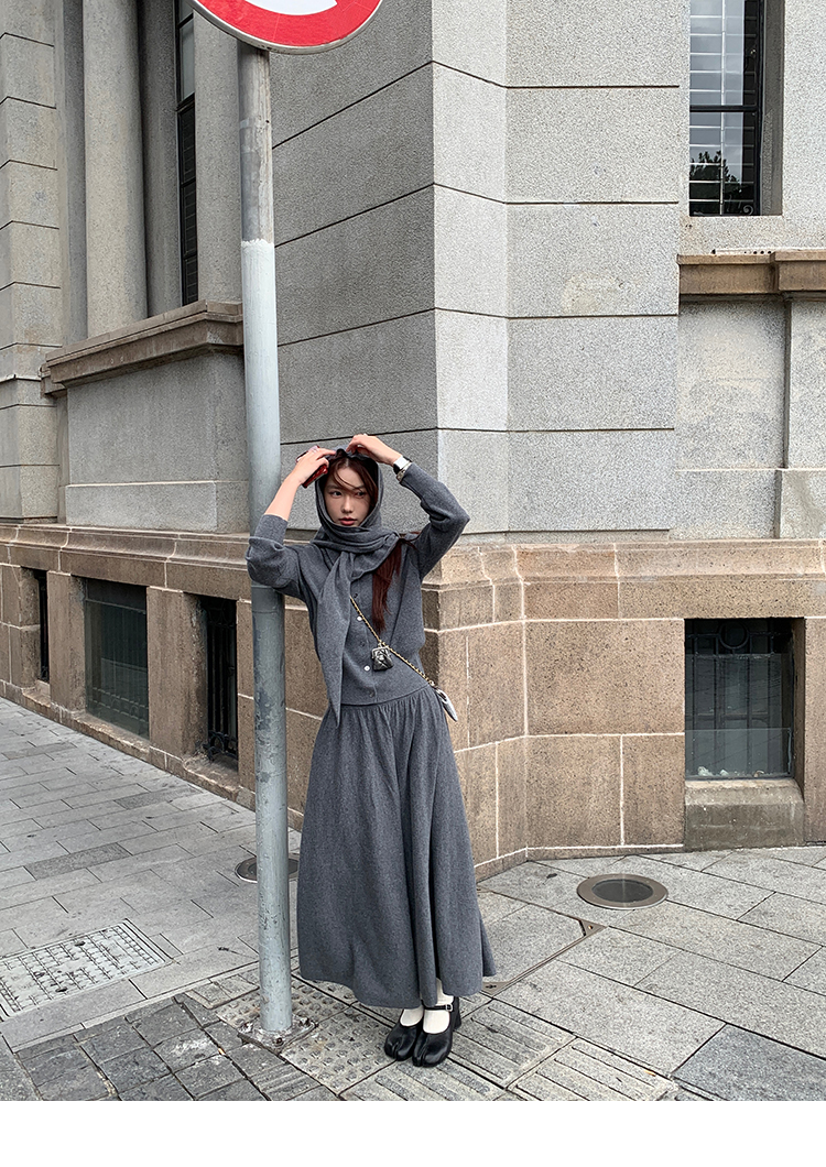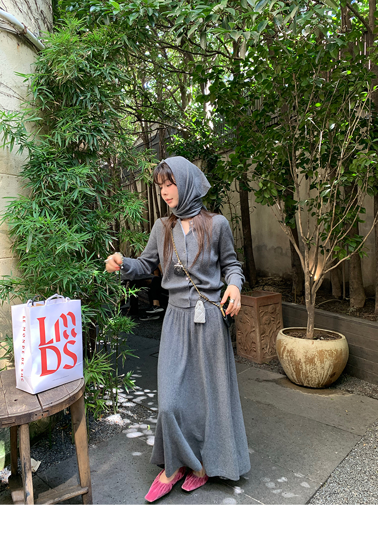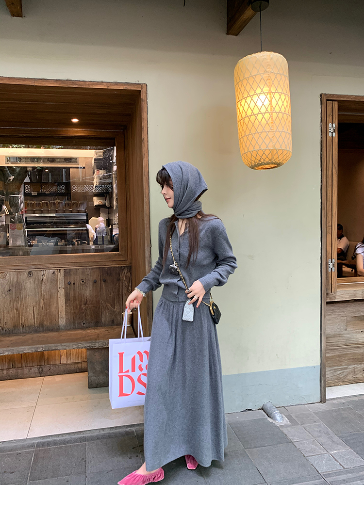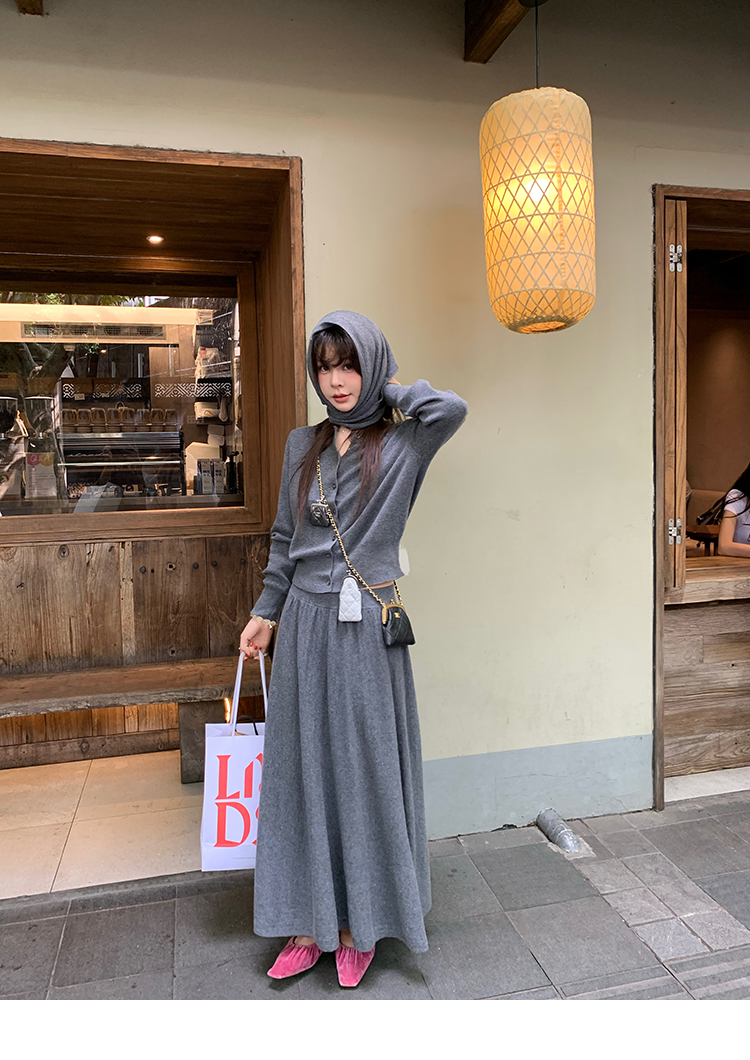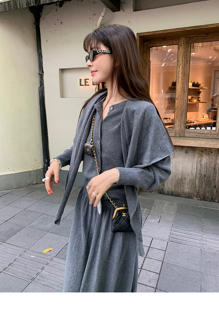 LRIB soft supply gray wool knitted cardigan skirt scarf three-piece set