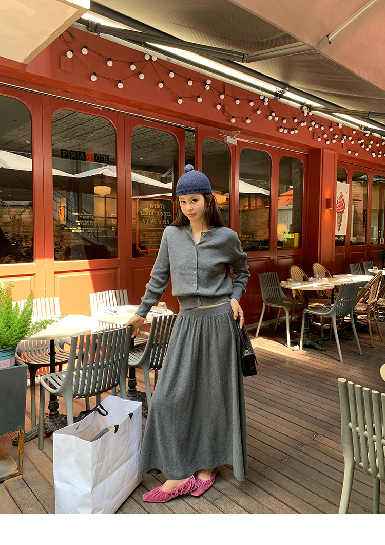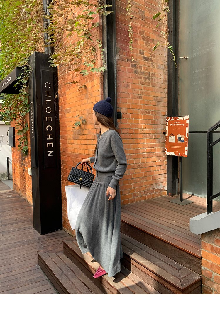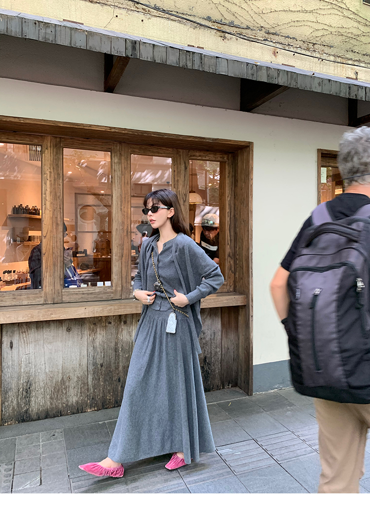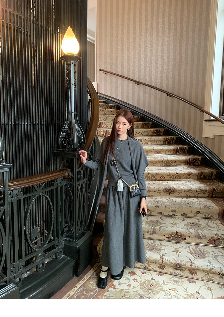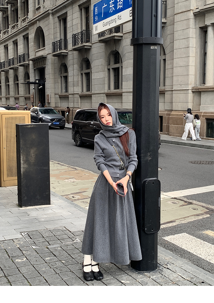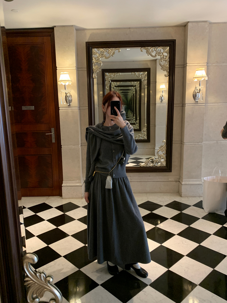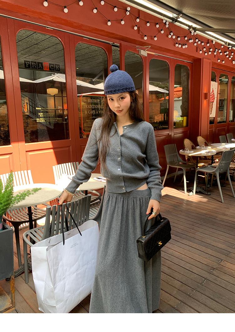 LRIB soft supply gray wool knitted cardigan skirt scarf three-piece set