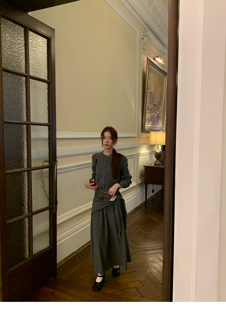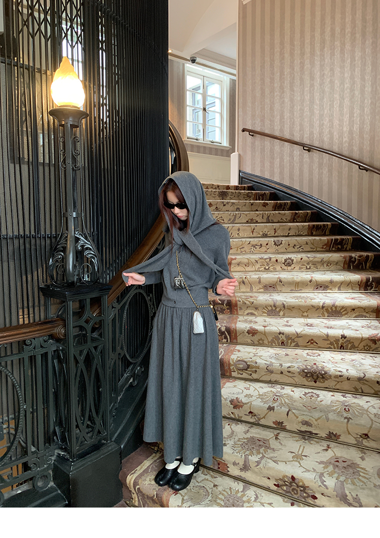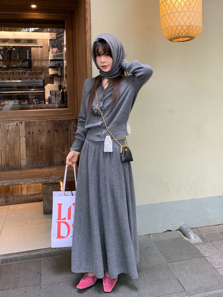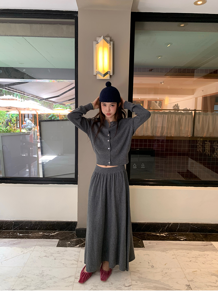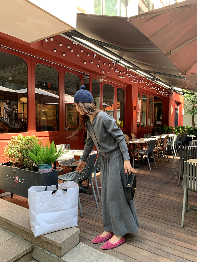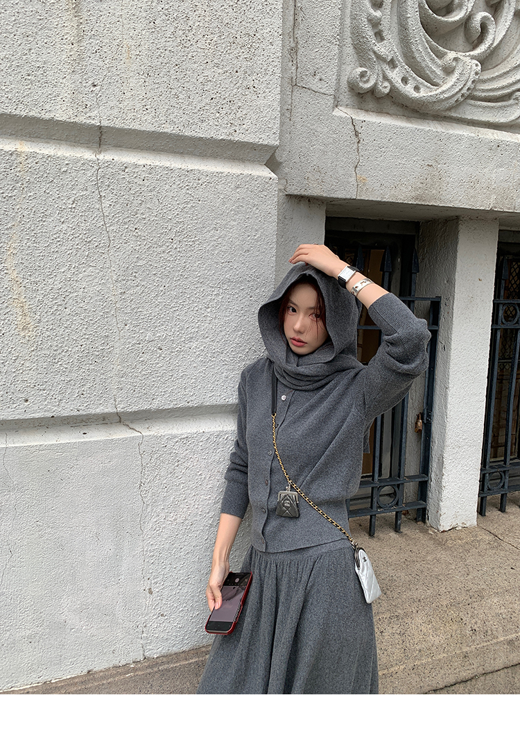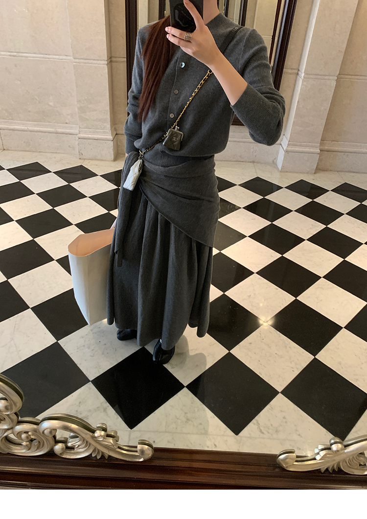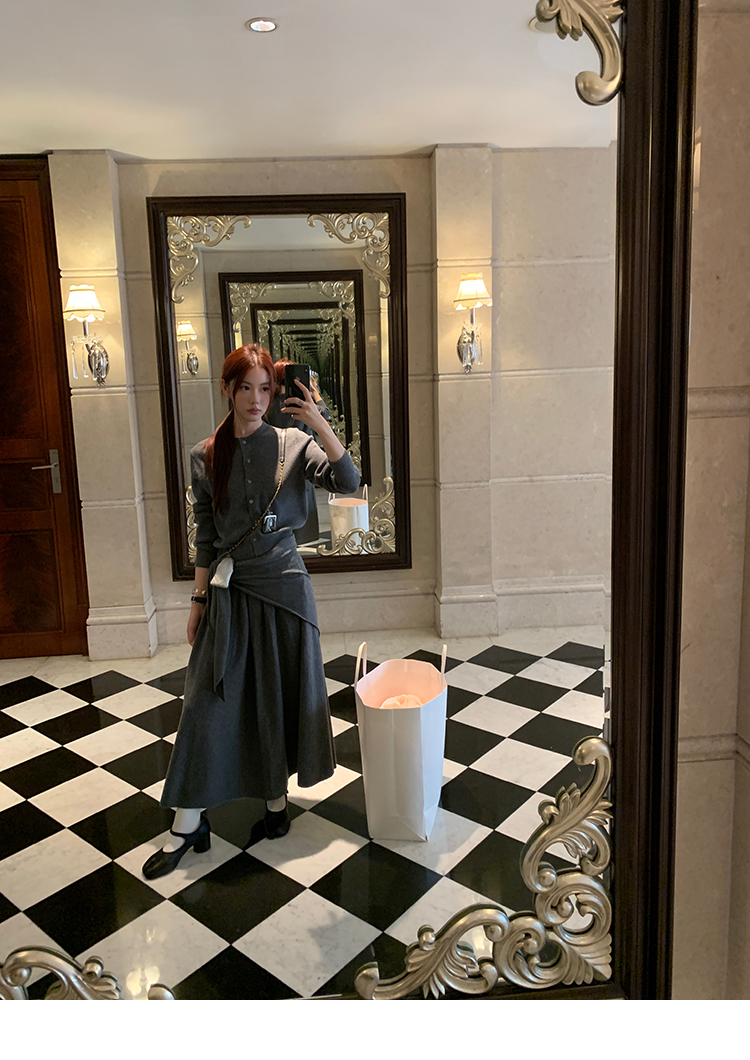 LRIB soft supply gray wool knitted cardigan skirt scarf three-piece set