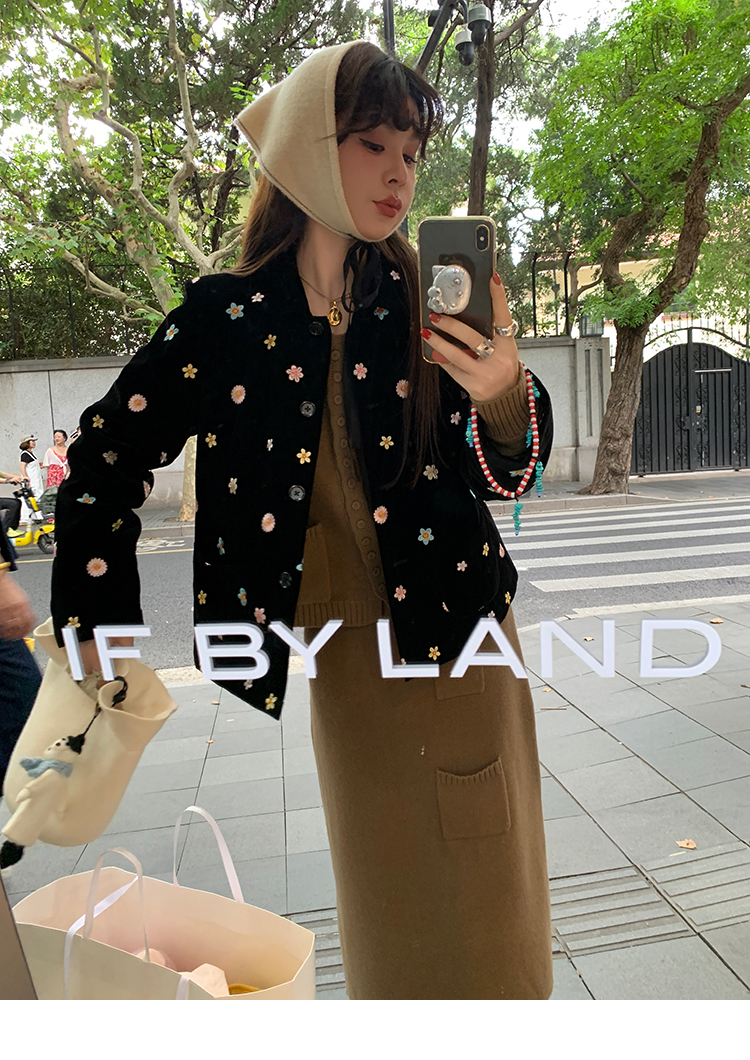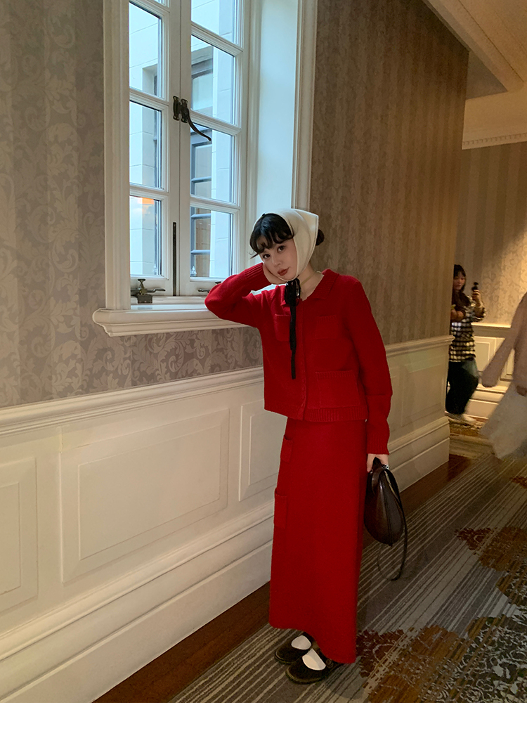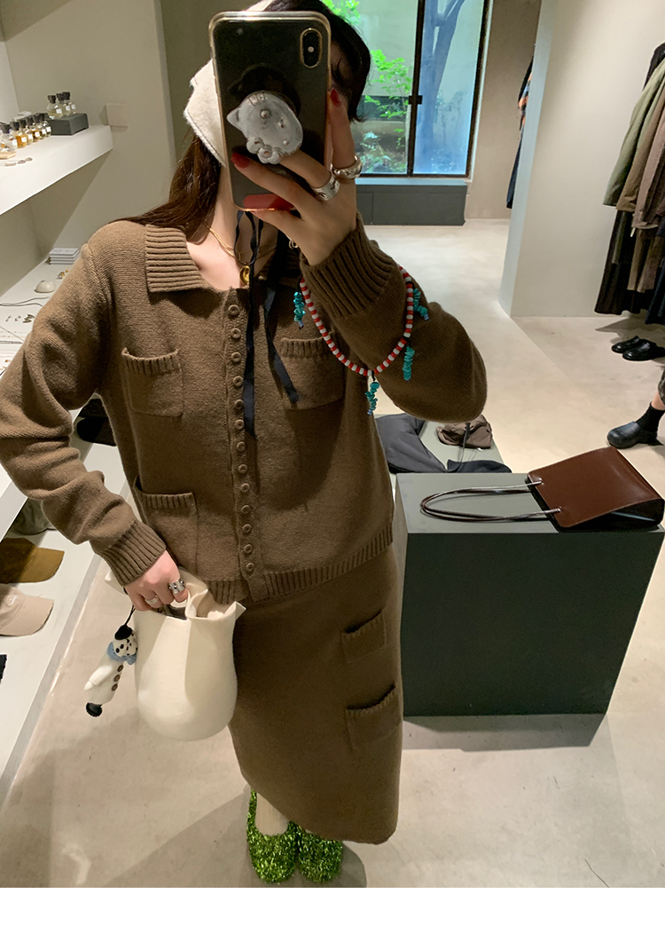 LRIB flexible poem retro multi-pocket wool sweater straight skirt set