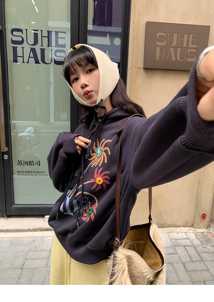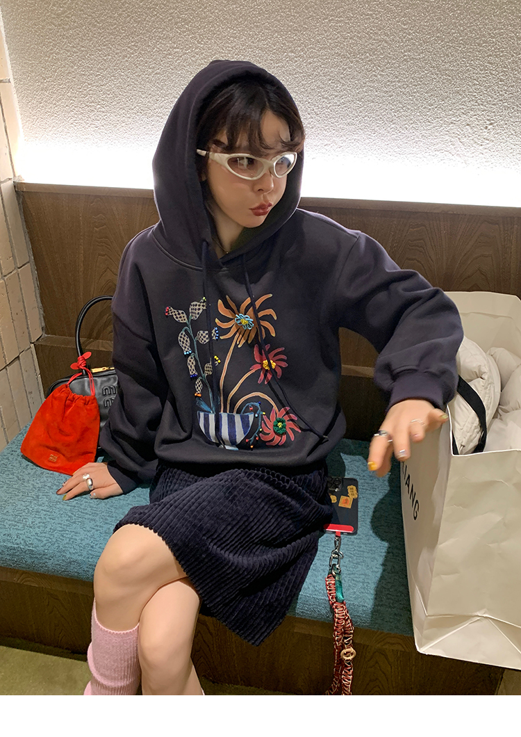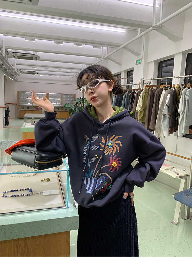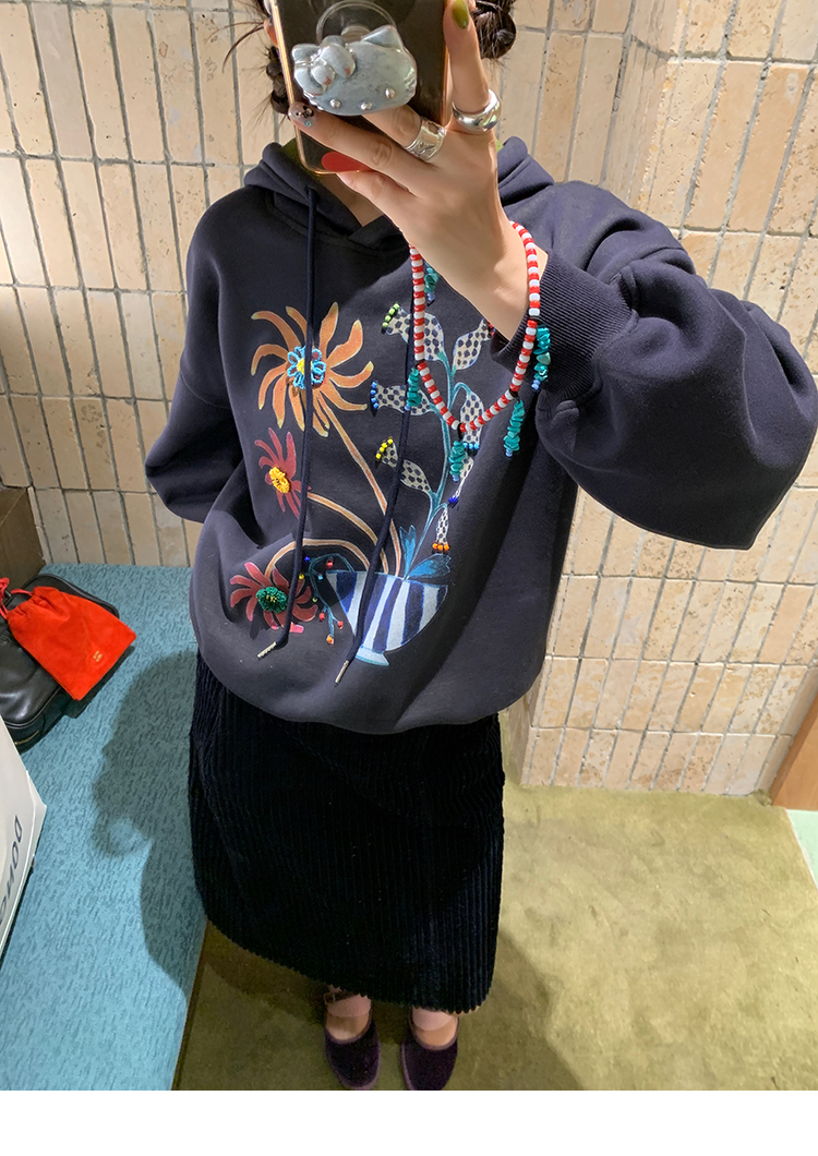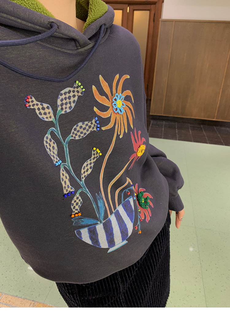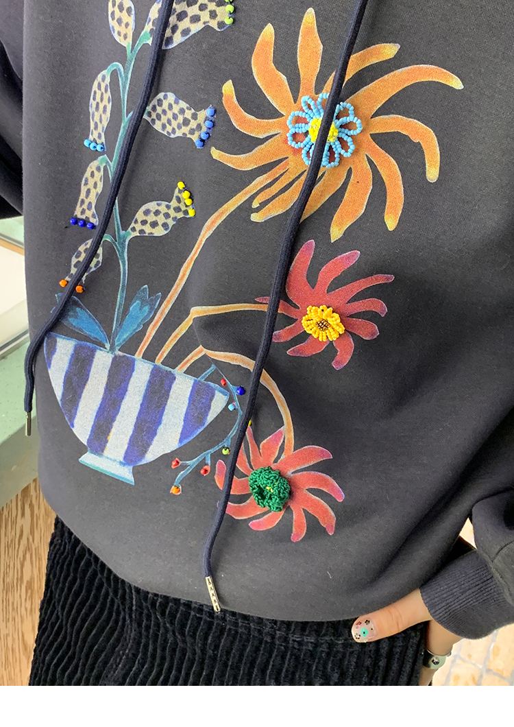 LRIB Handcrafted Bead Potted Printed Fleece Hooded Sweatshirt