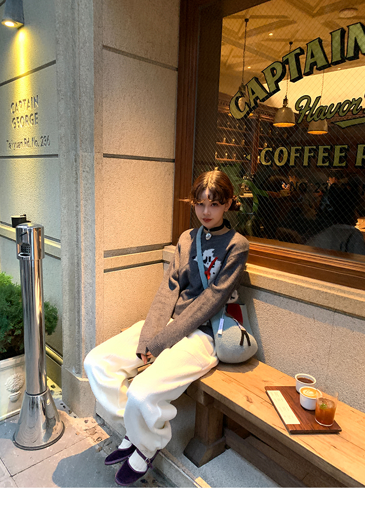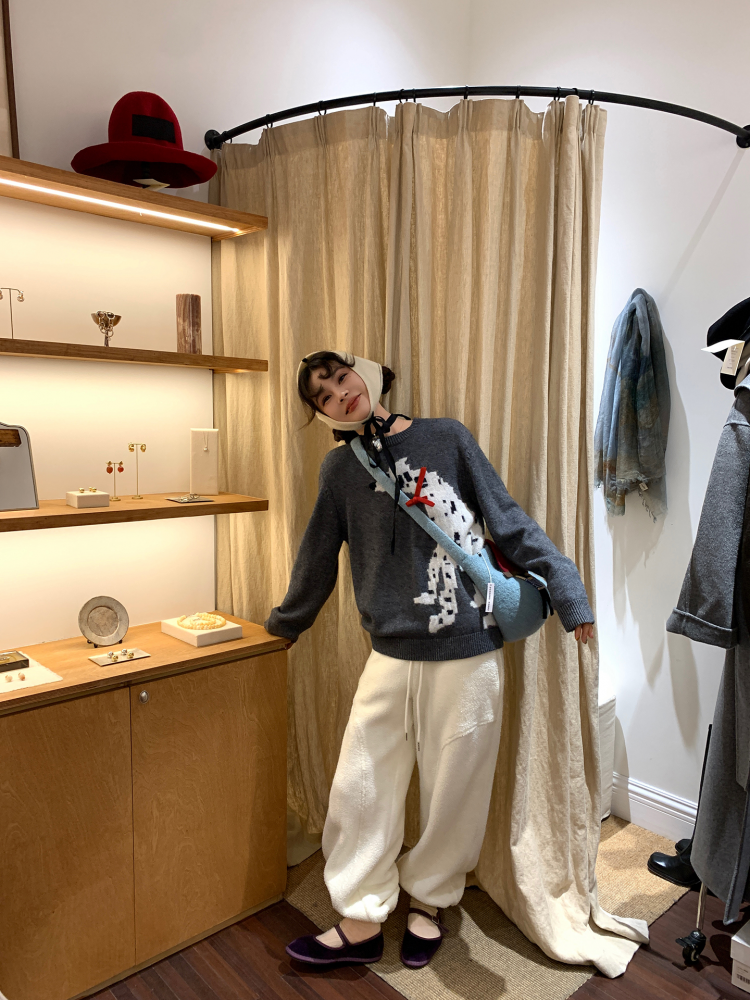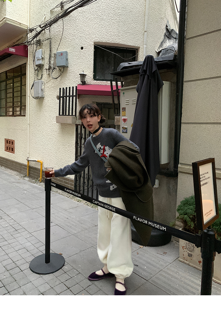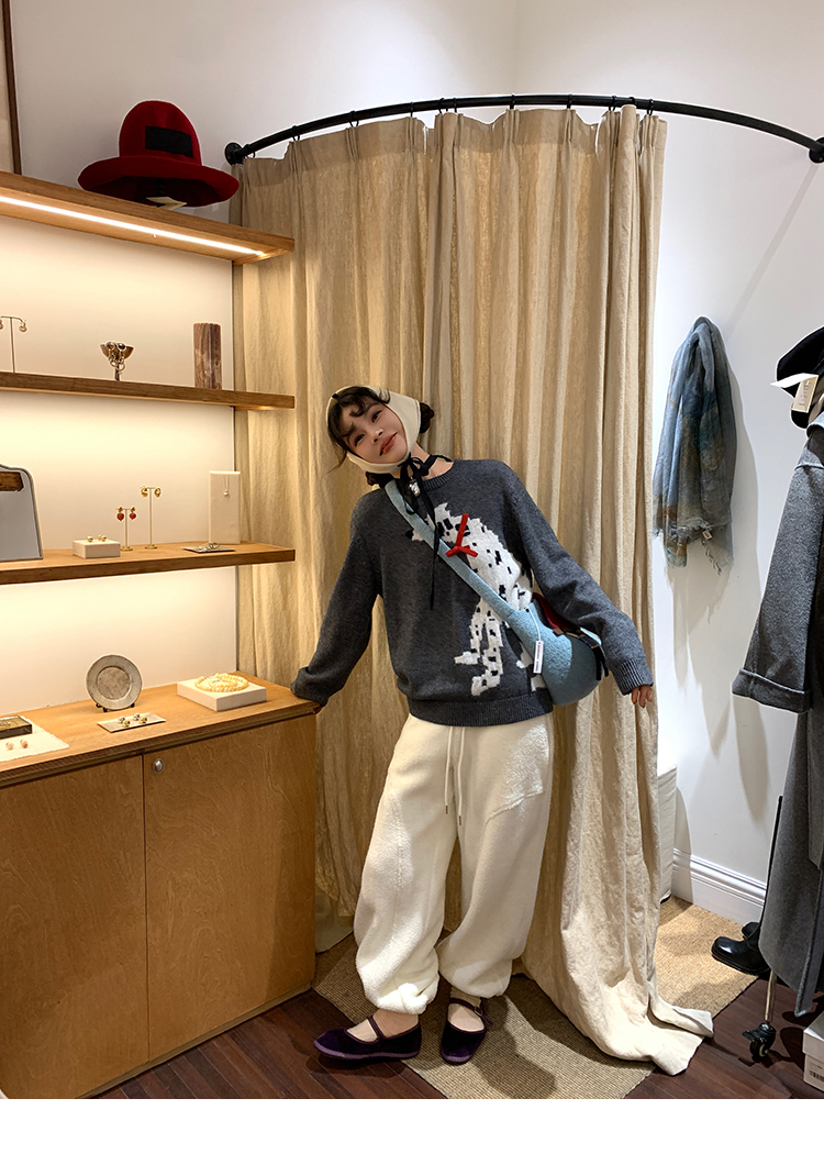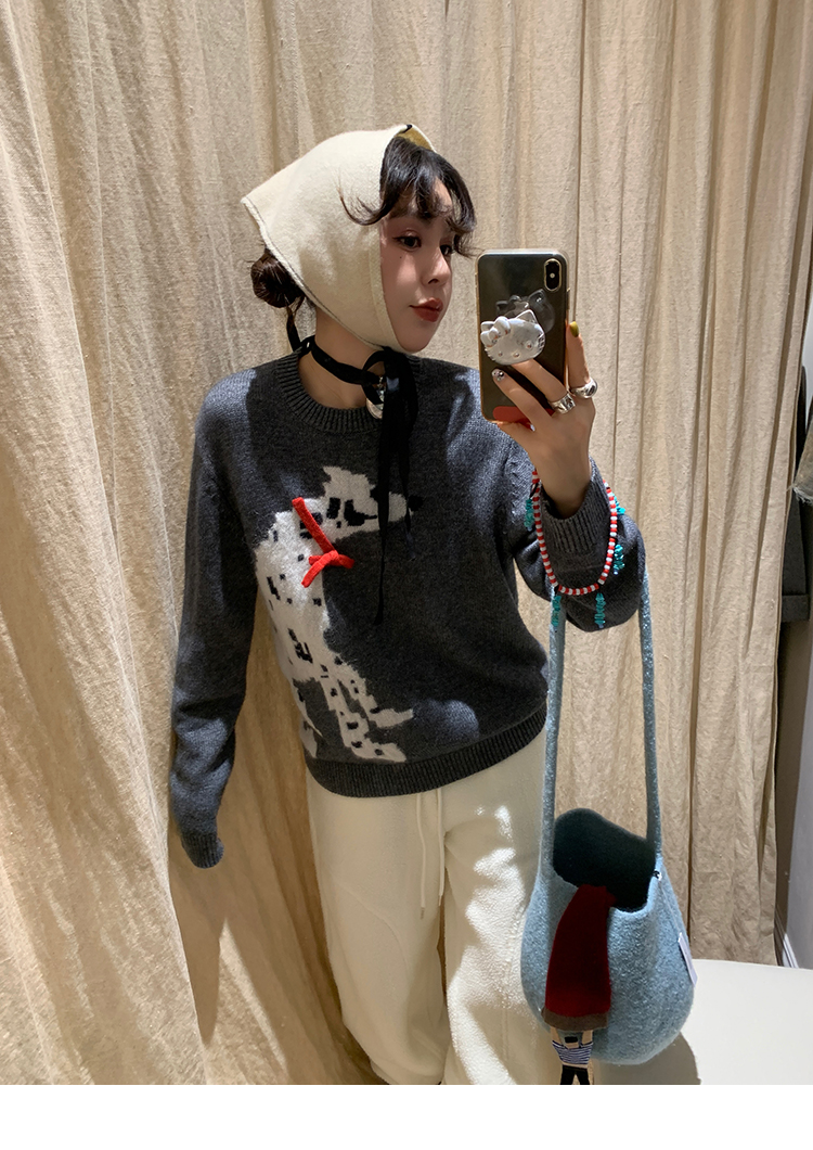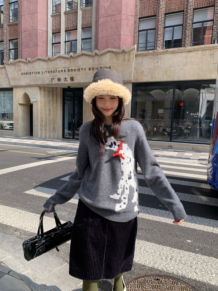 LRIB Cute Round Neck Scarf Polar Bear Embroidered Gray Wool Sweater
