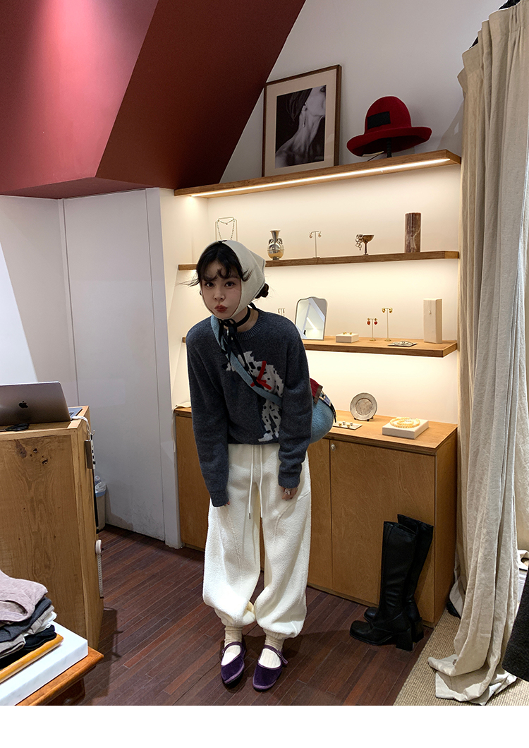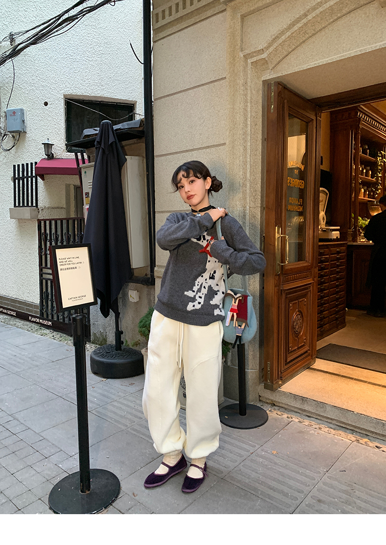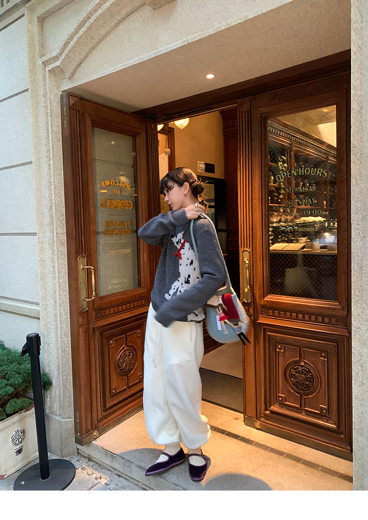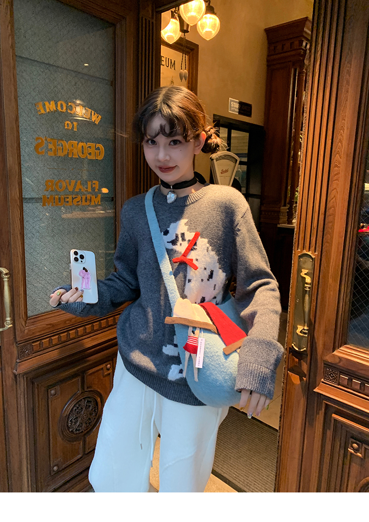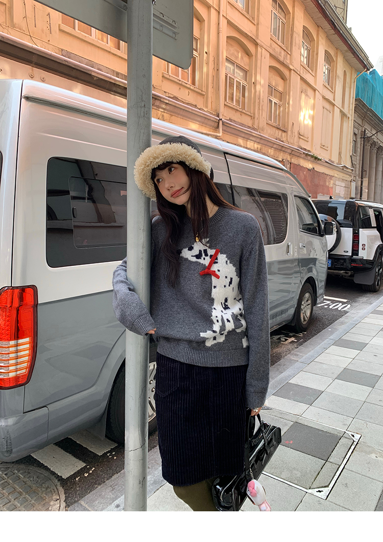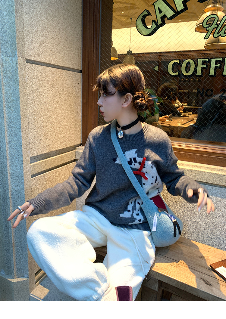 LRIB Cute Round Neck Scarf Polar Bear Embroidered Gray Wool Sweater