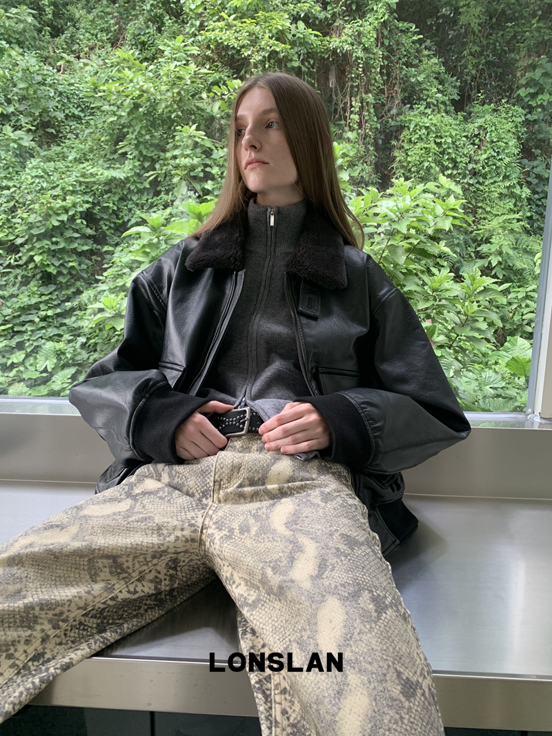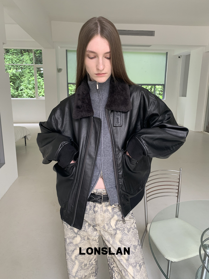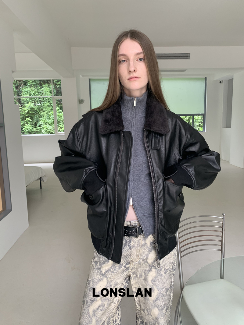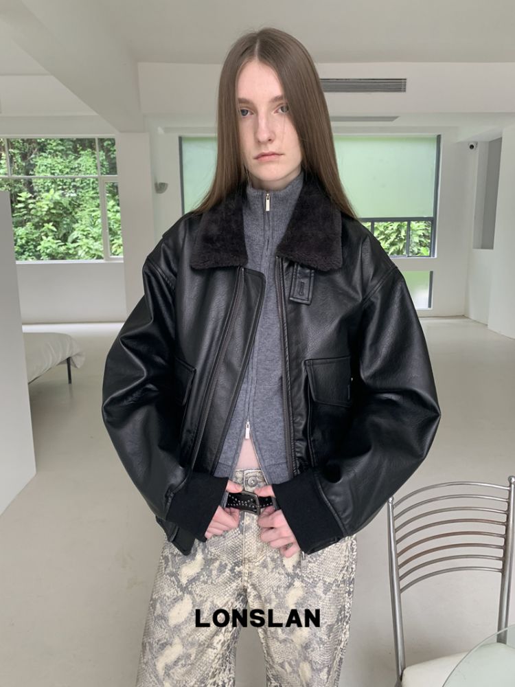 LONSLAN Retro Brown-Black Fur-Collar Motorcycle Leather Jacket