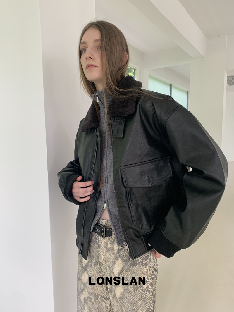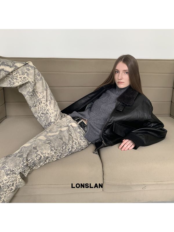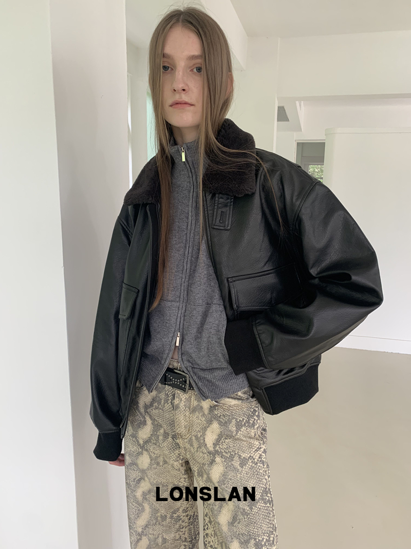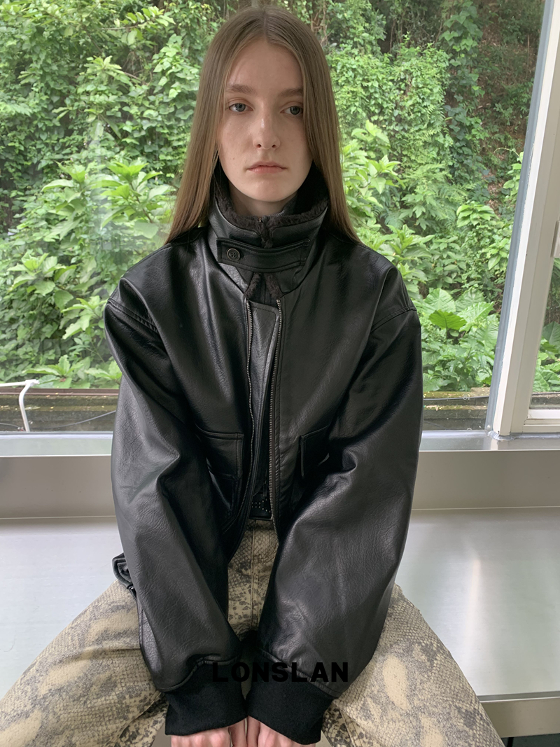 LONSLAN Retro Brown-Black Fur-Collar Motorcycle Leather Jacket