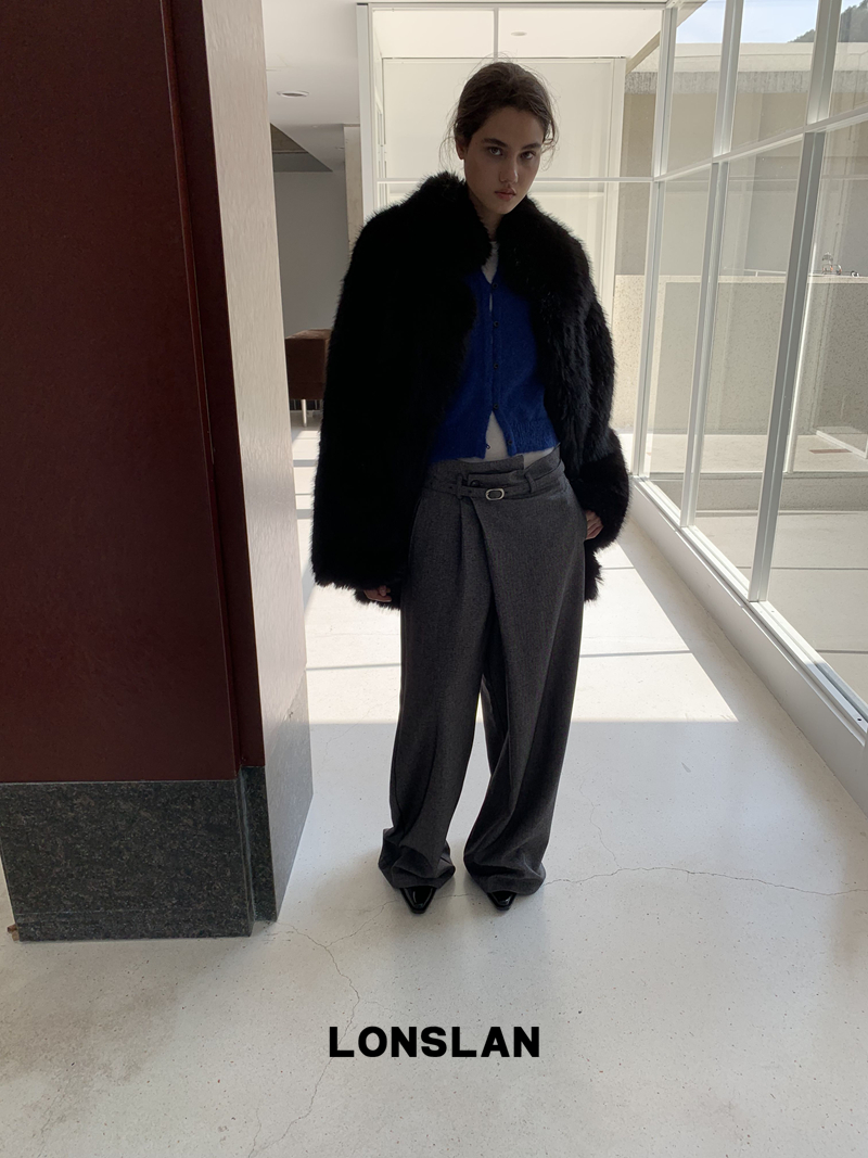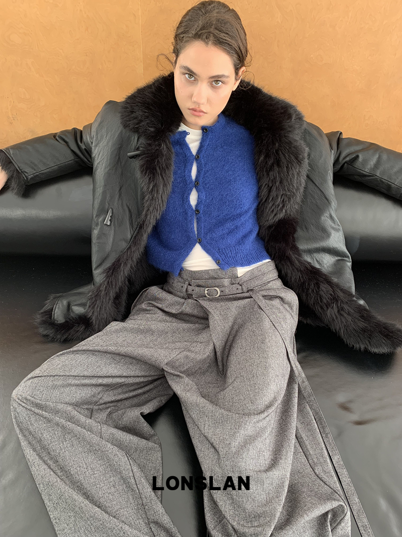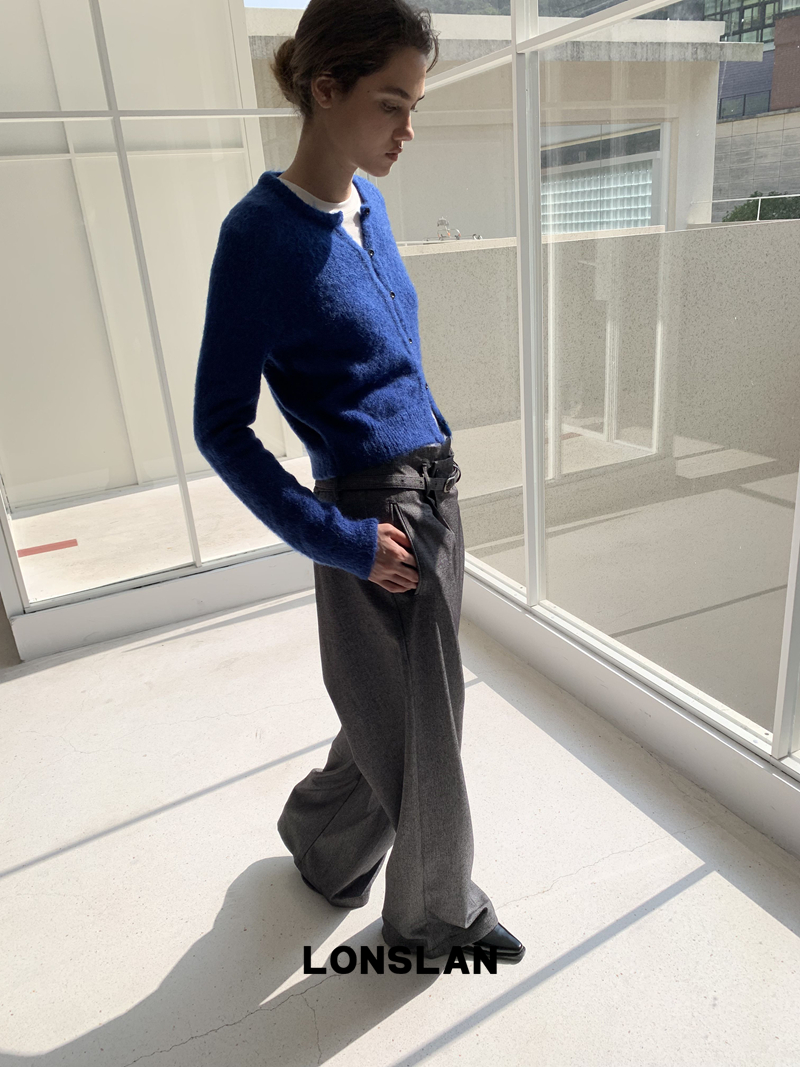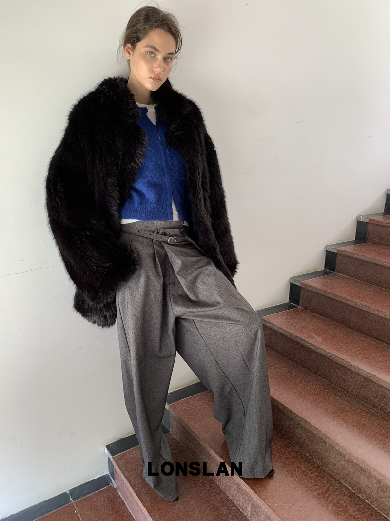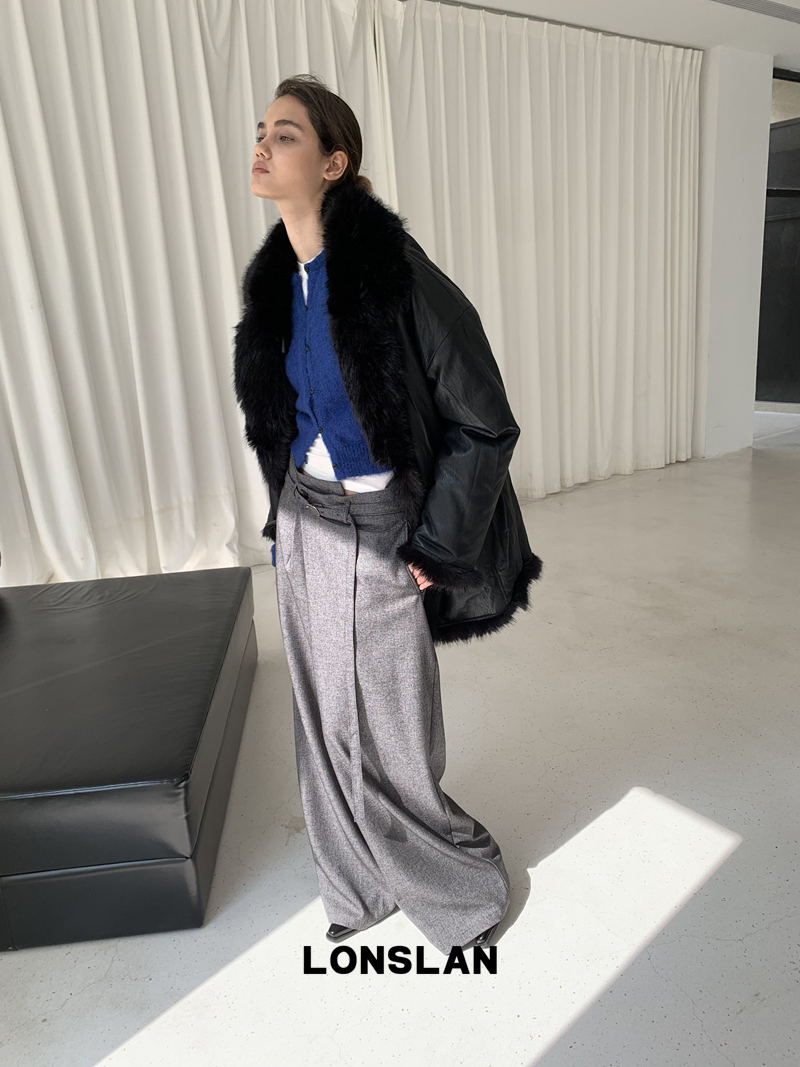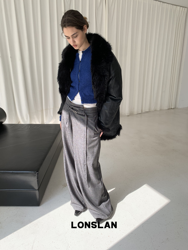 LONSLAN Irregular Diagonal Hem Belt Wool Suit Wide-Leg Trousers