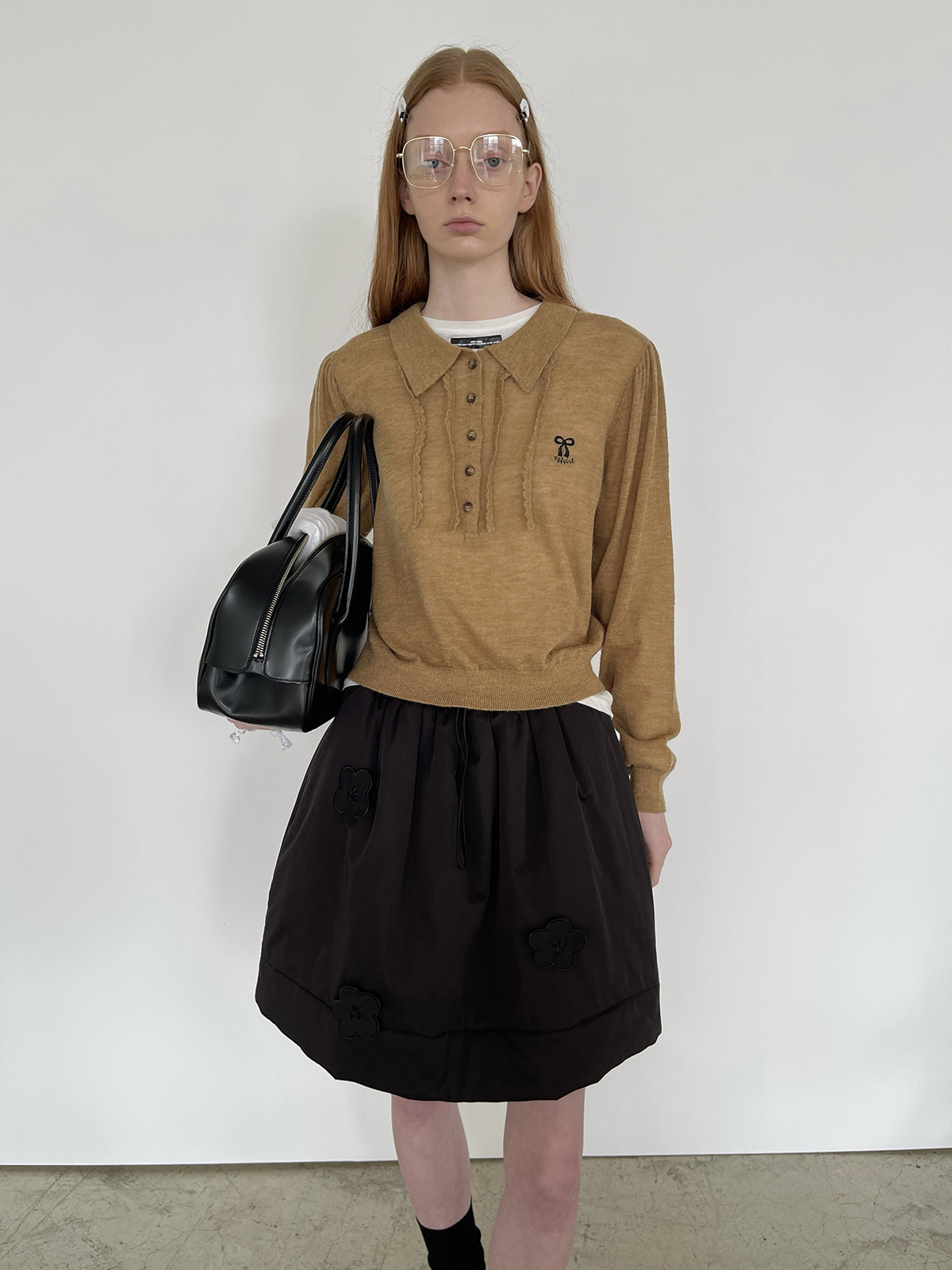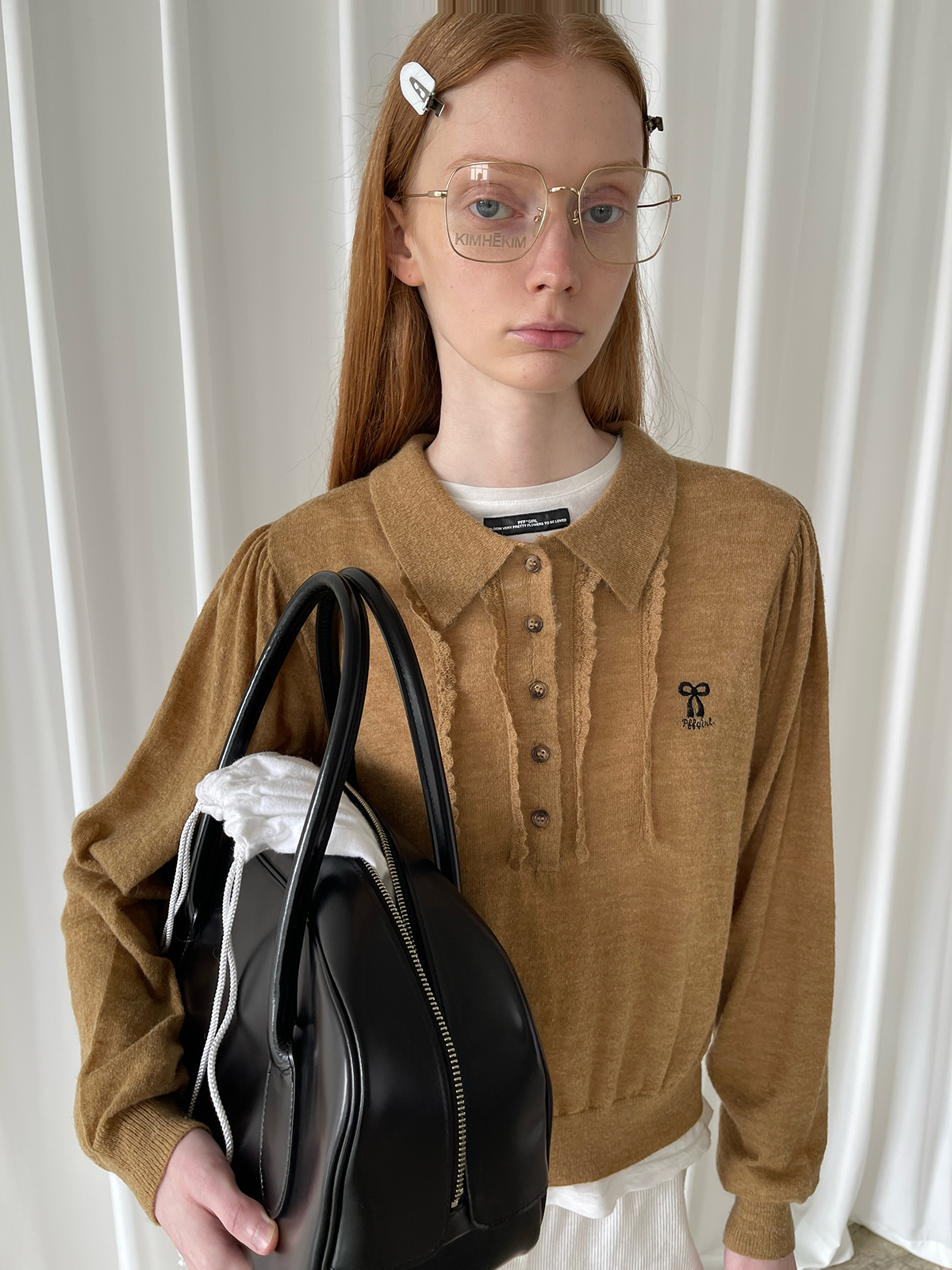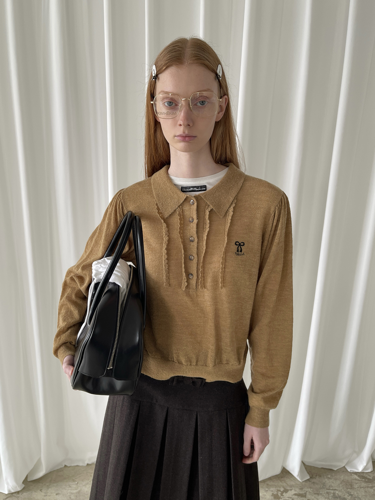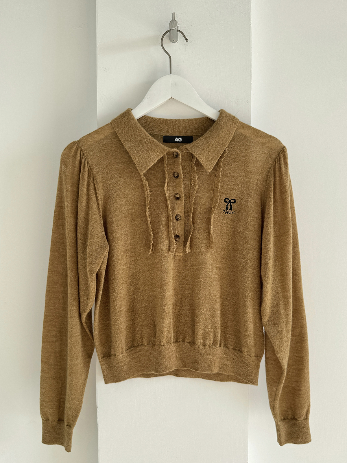 PFF GIRL Brown Puff Sleeve Knit Polo Shirt