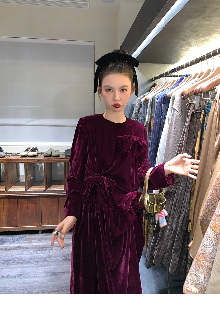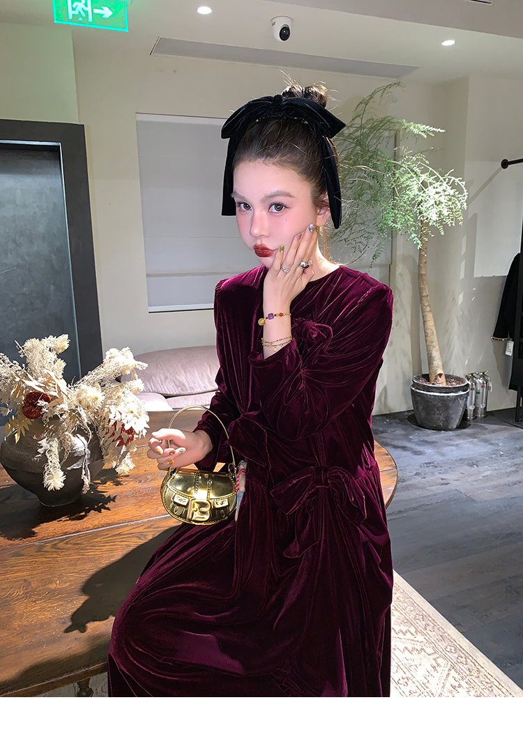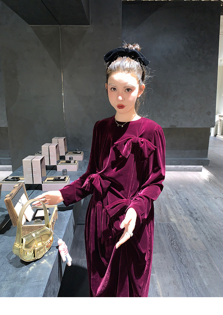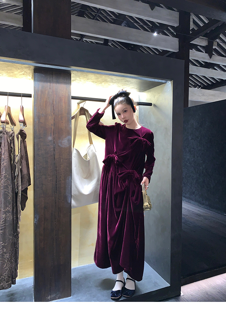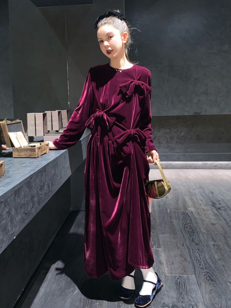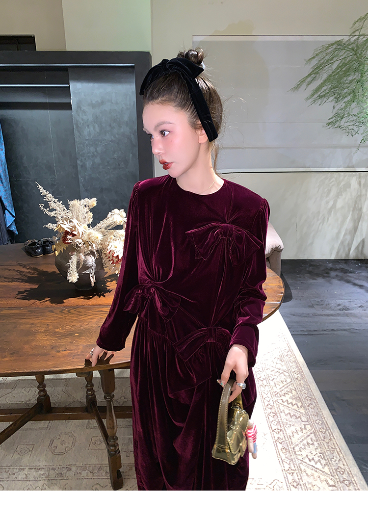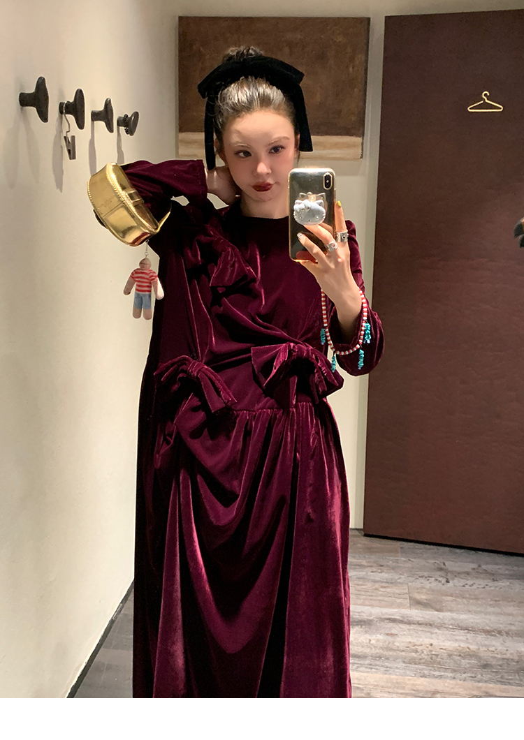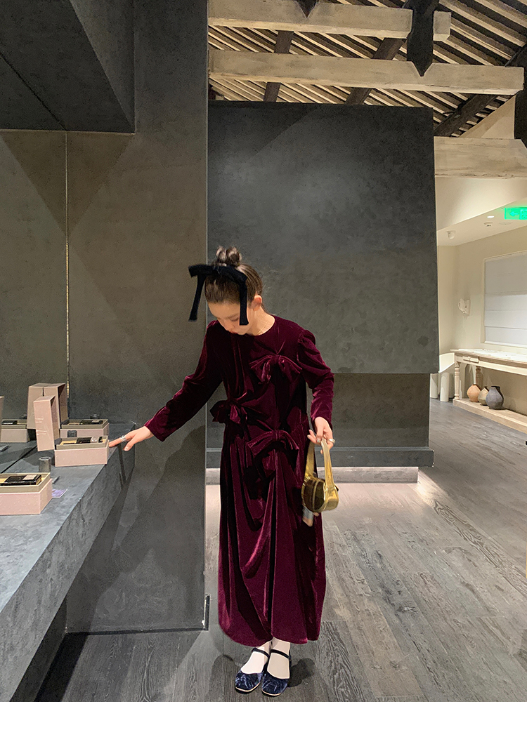 LRIB Handcrafted Bow Long-Sleeve Velvet Dress