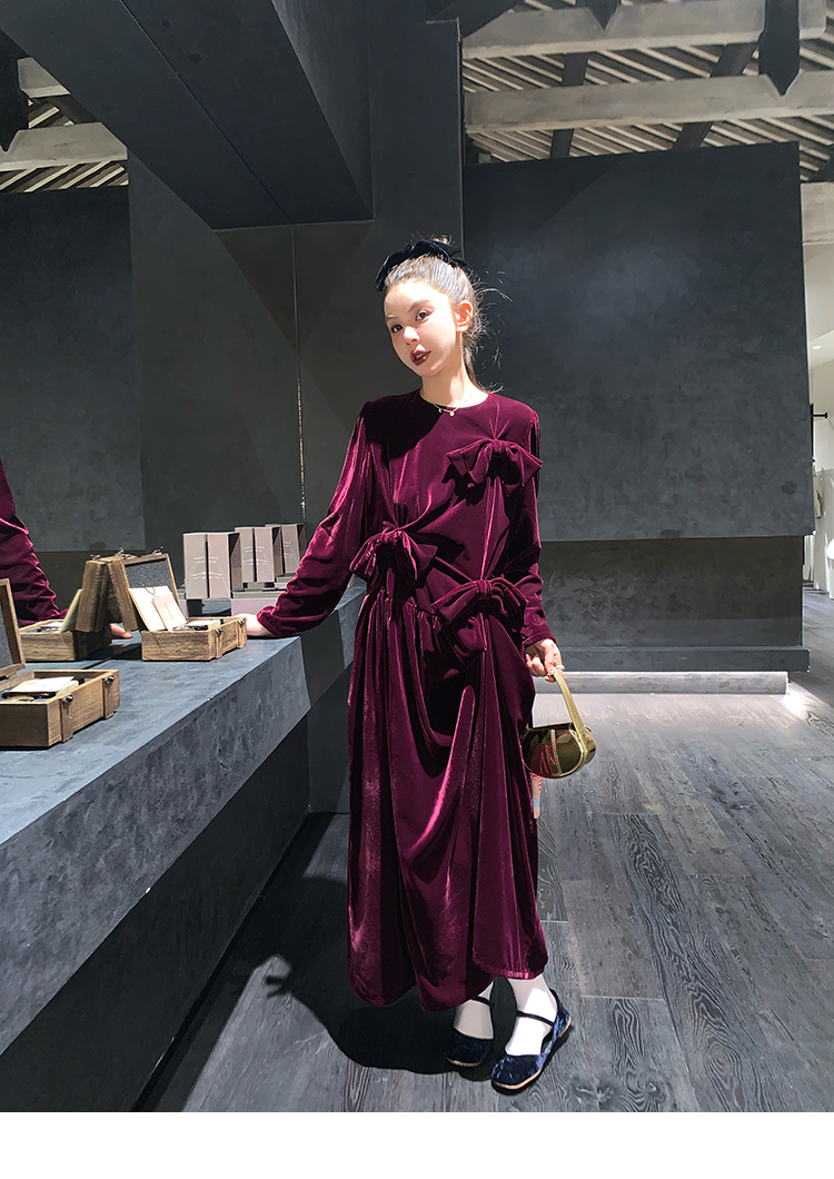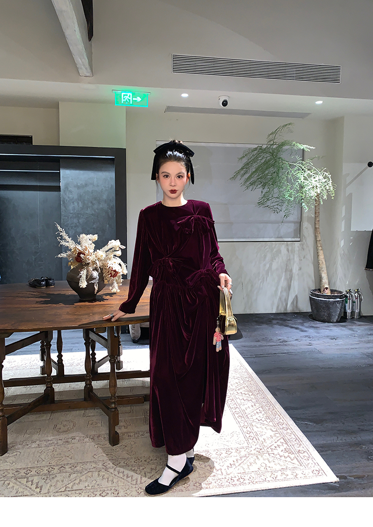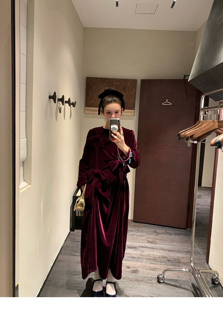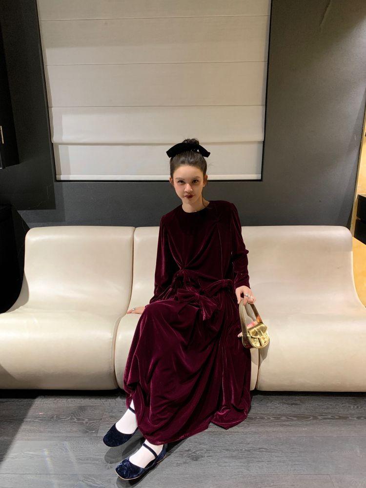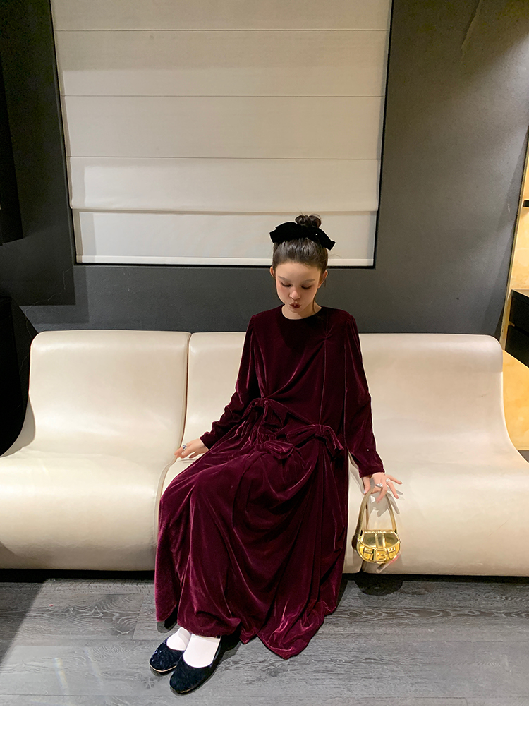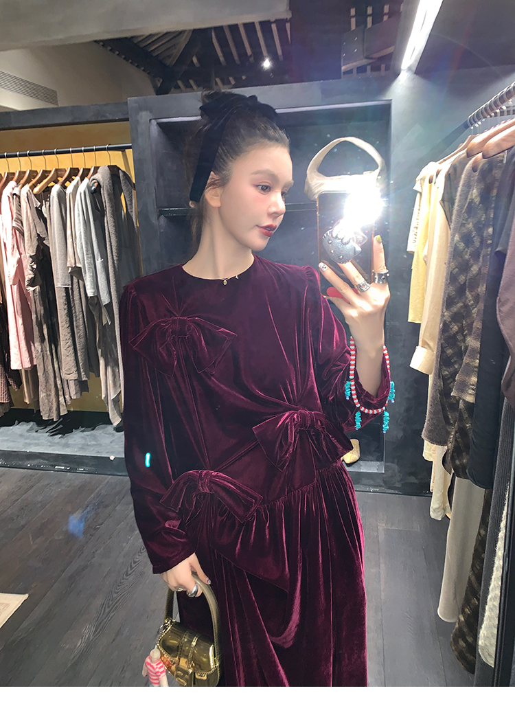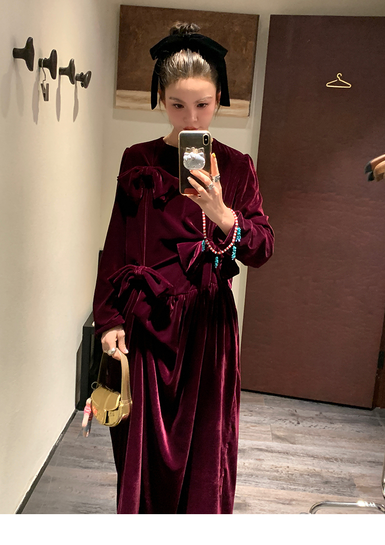 LRIB Handcrafted Bow Long-Sleeve Velvet Dress