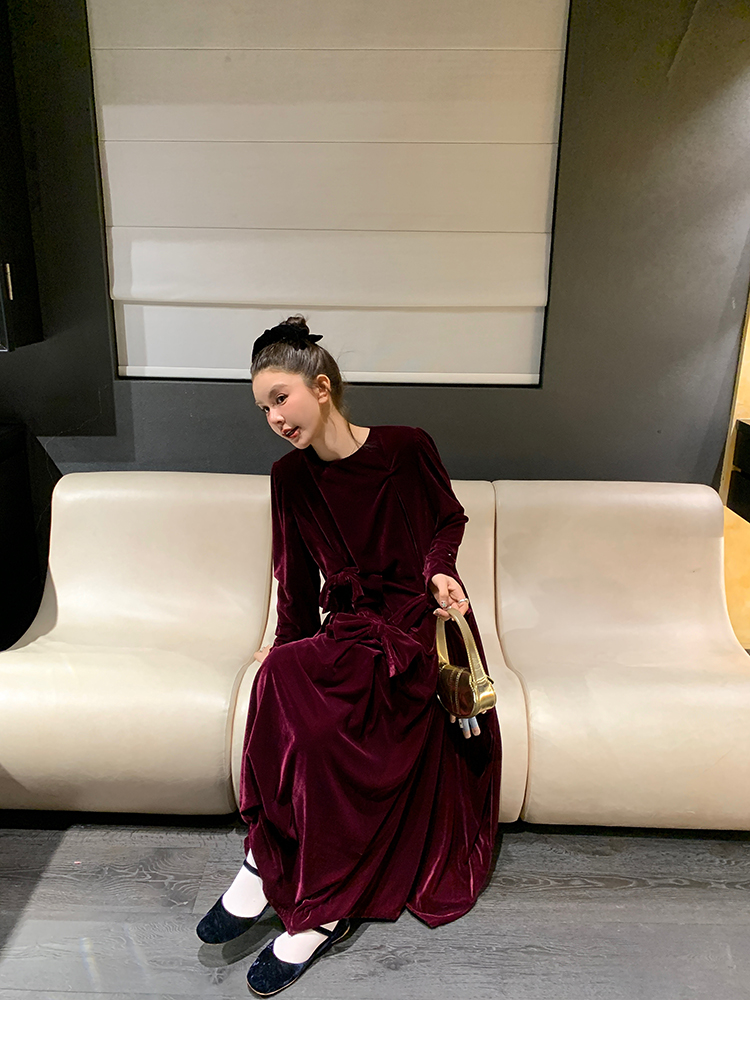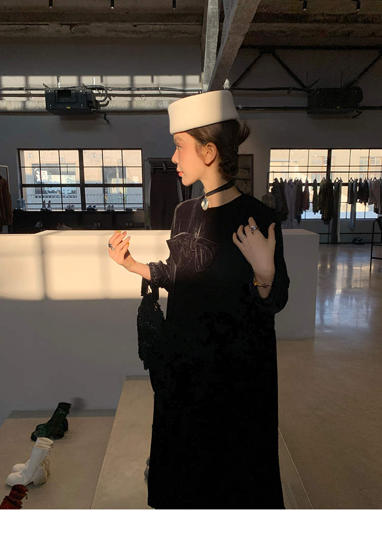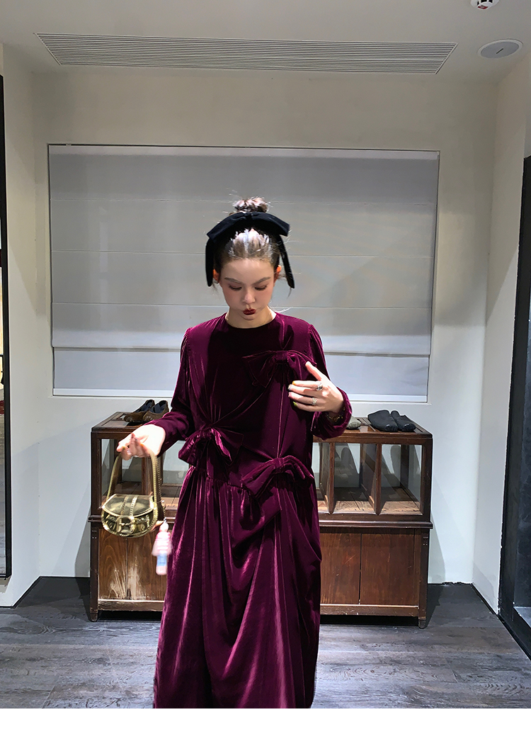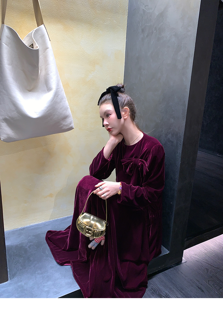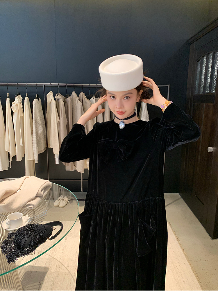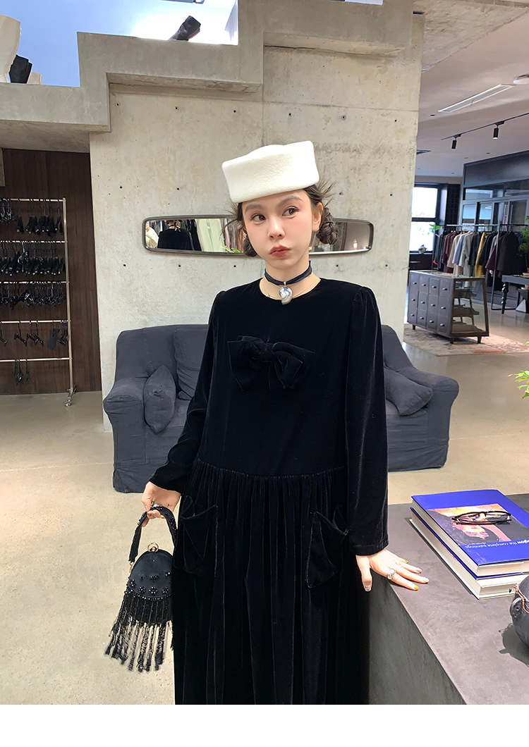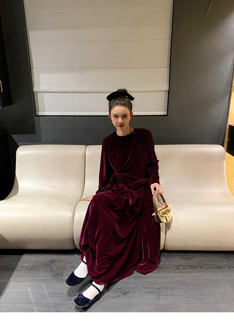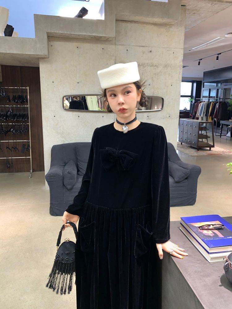 LRIB Handcrafted Bow Long-Sleeve Velvet Dress