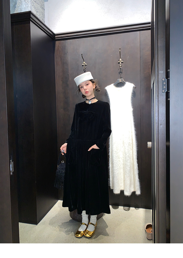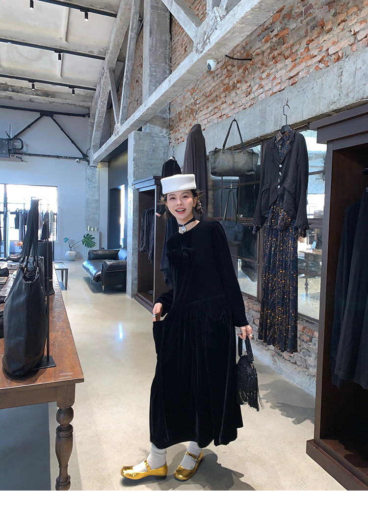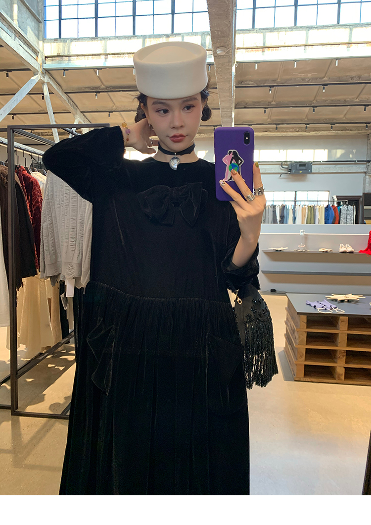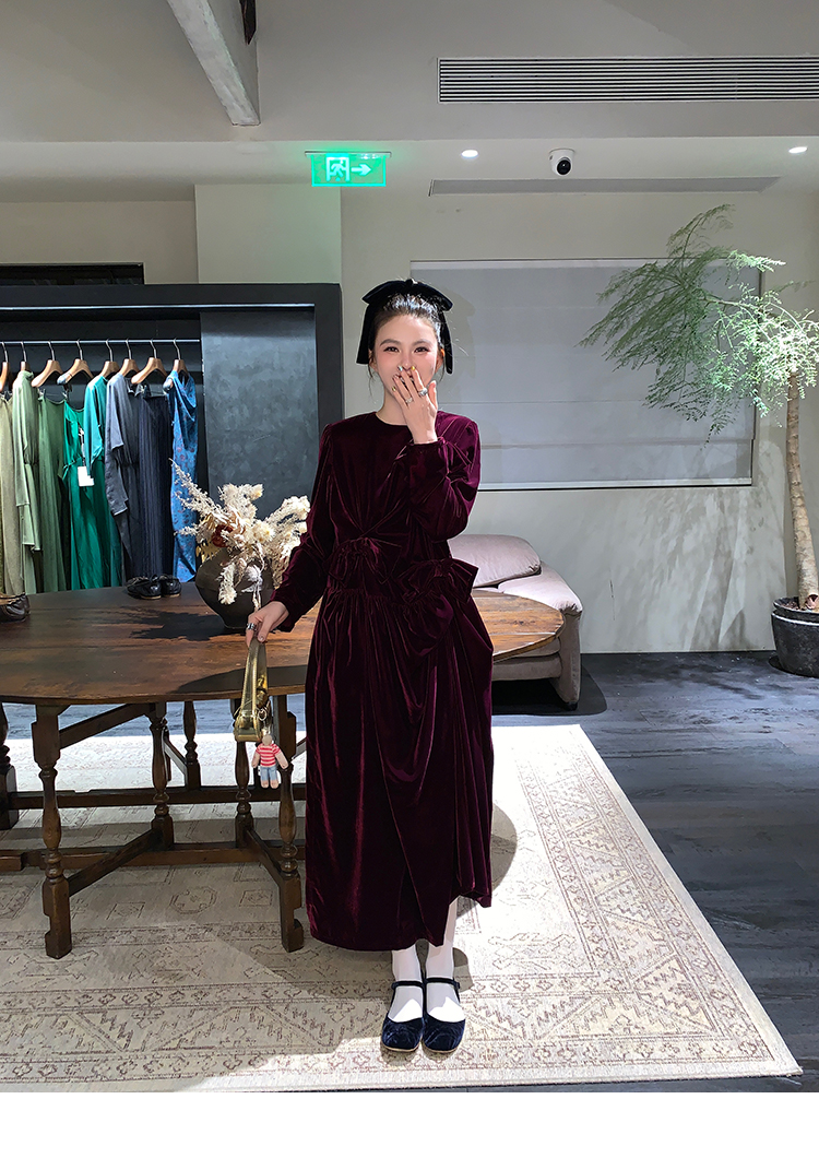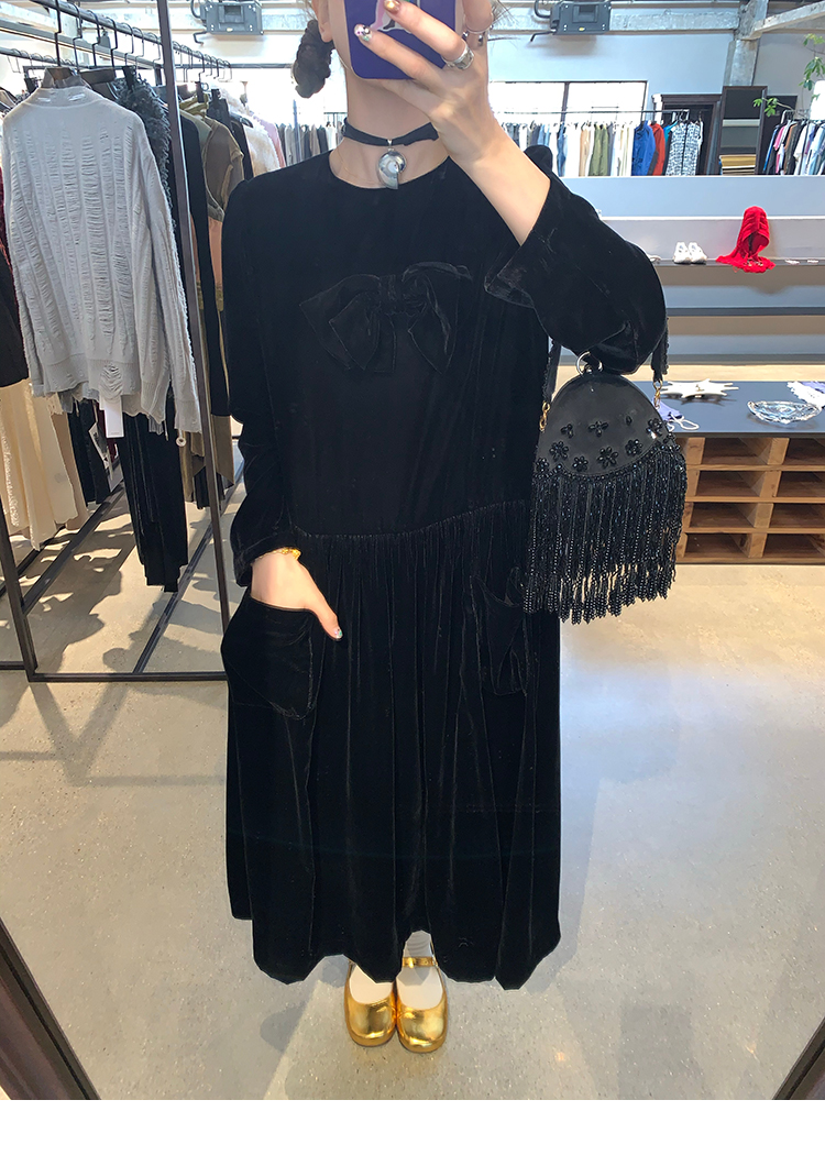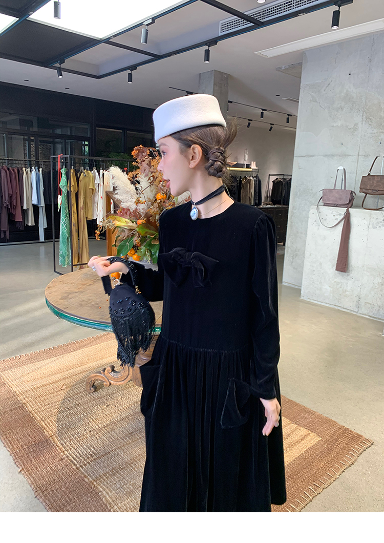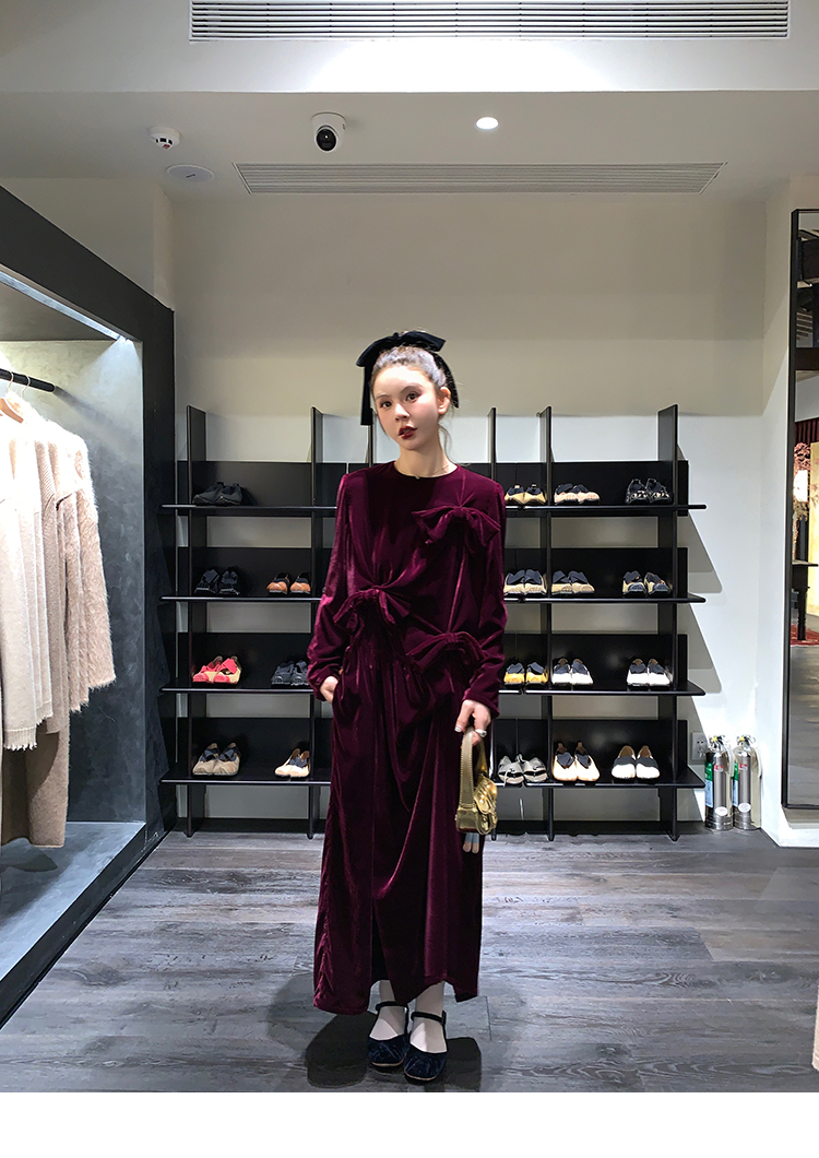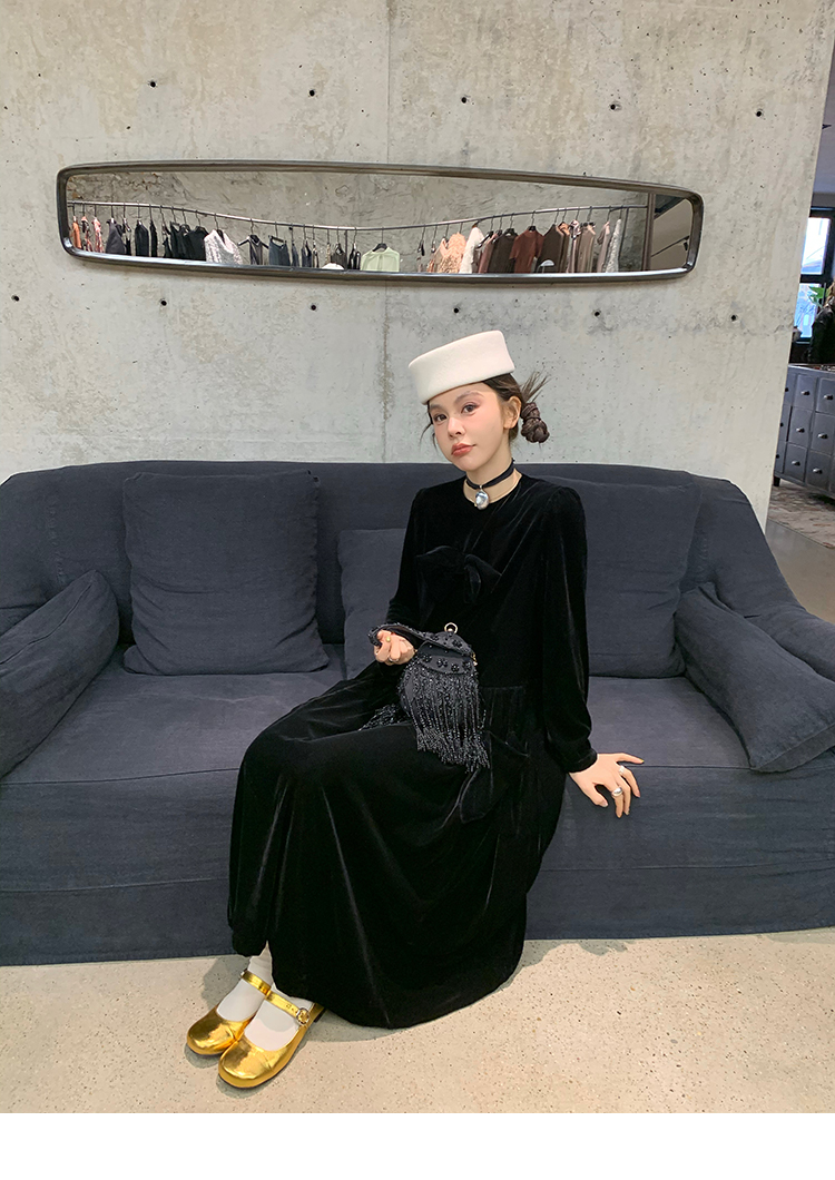 LRIB Handcrafted Bow Long-Sleeve Velvet Dress