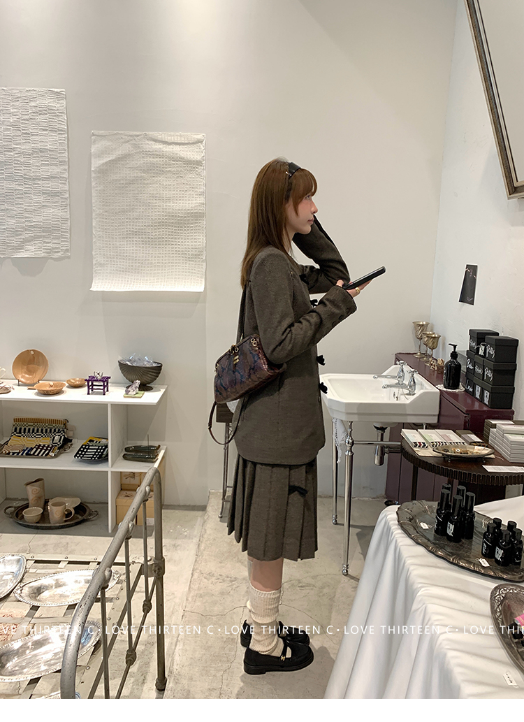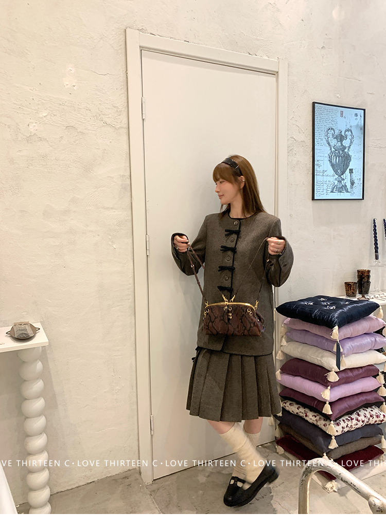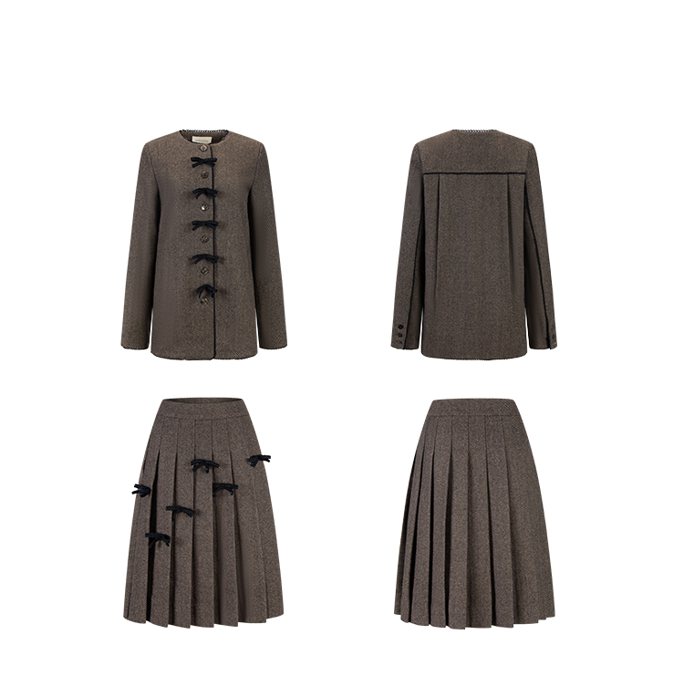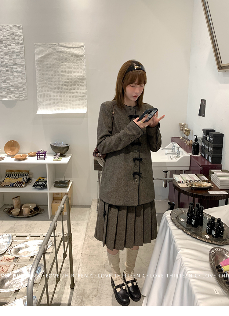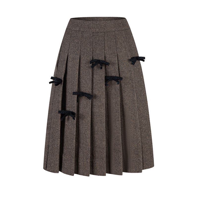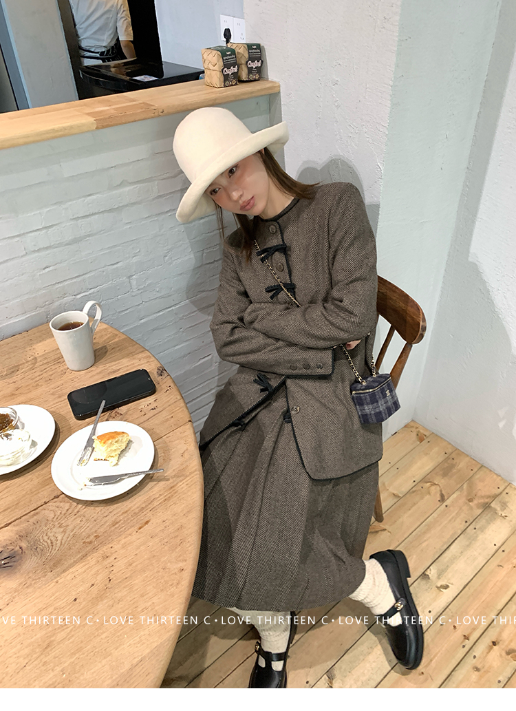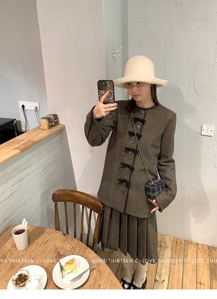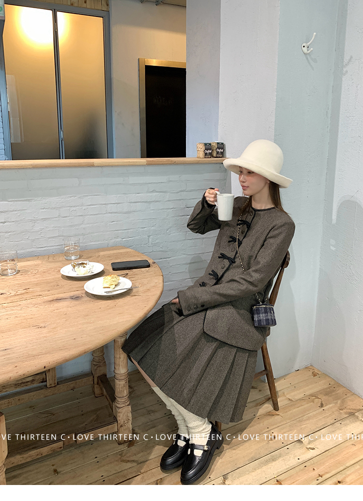 TC Handmade bow tie vintage wool coat and pleated half skirt