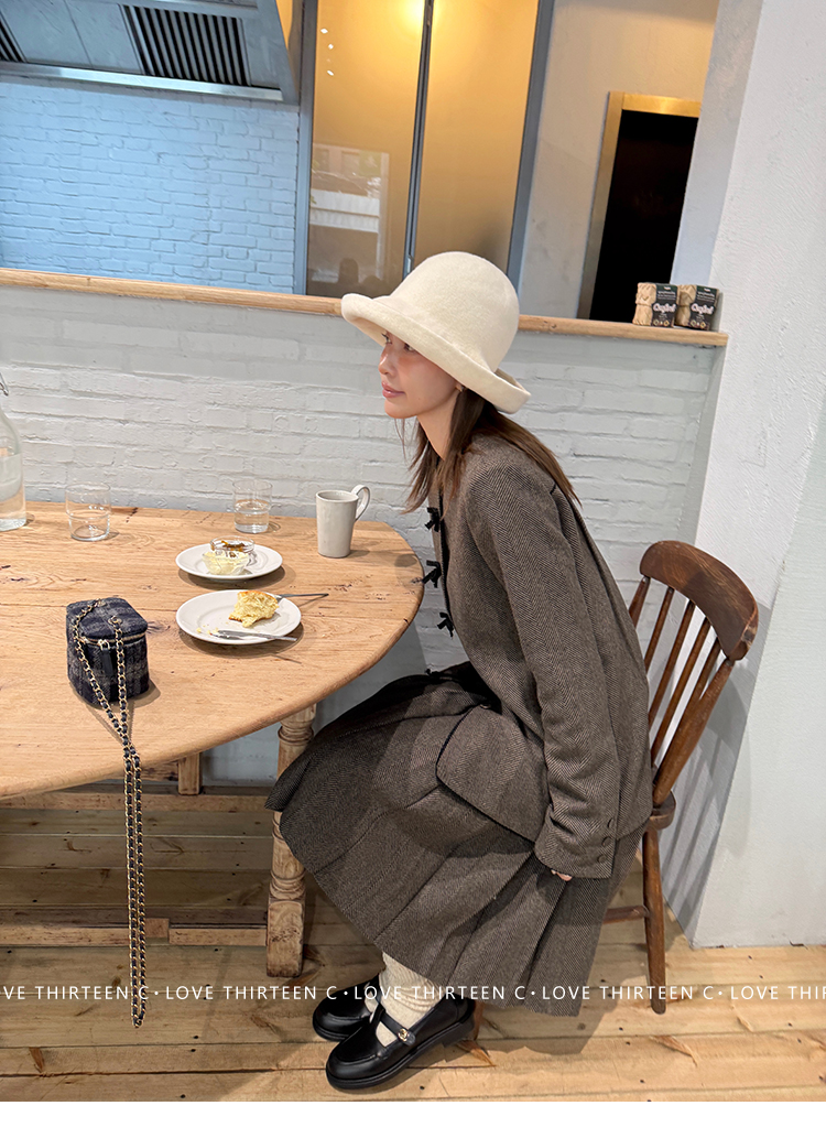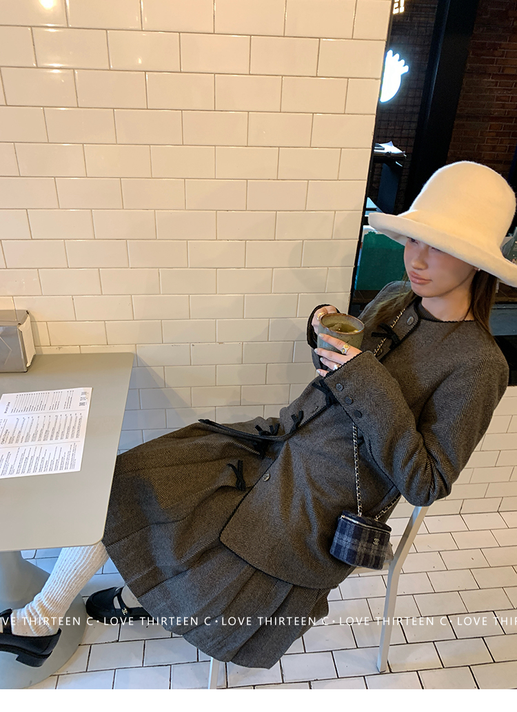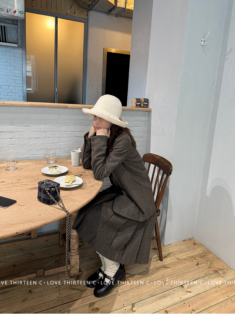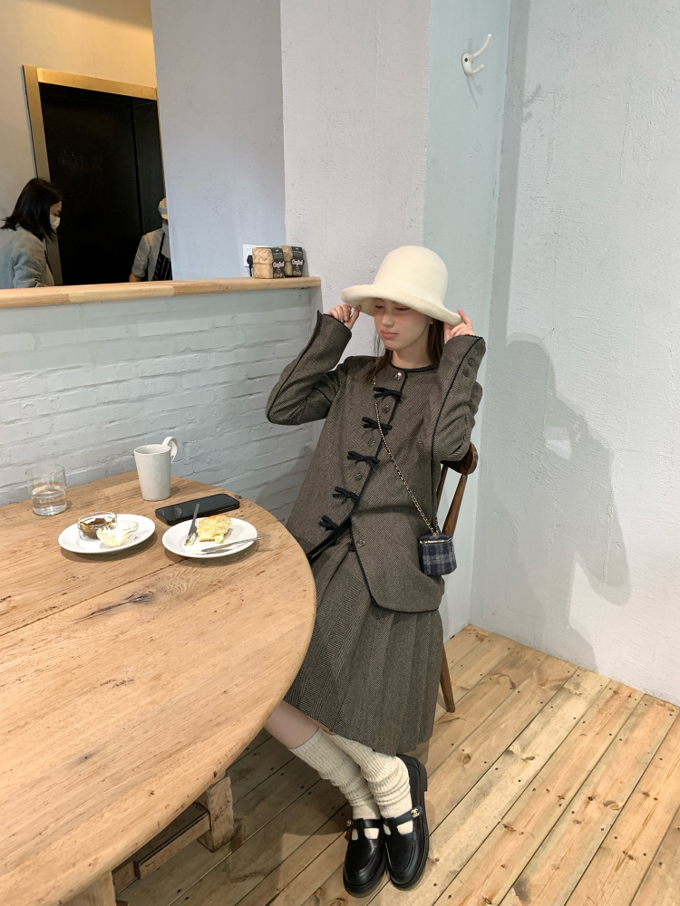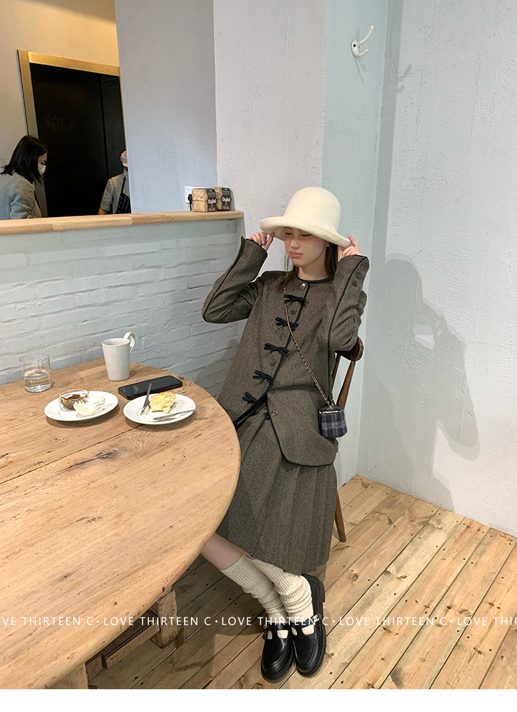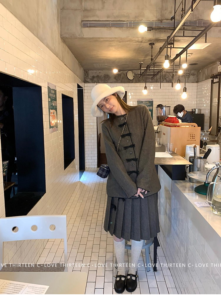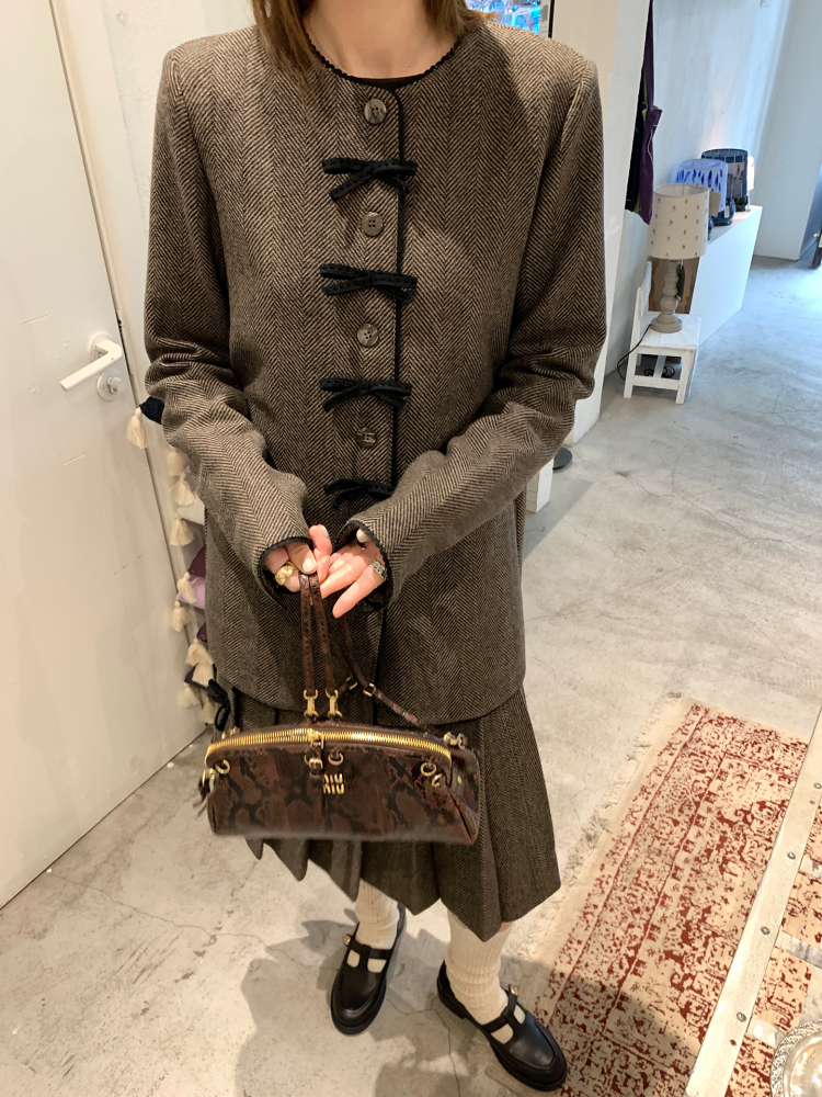 TC Handmade bow tie vintage wool coat and pleated half skirt