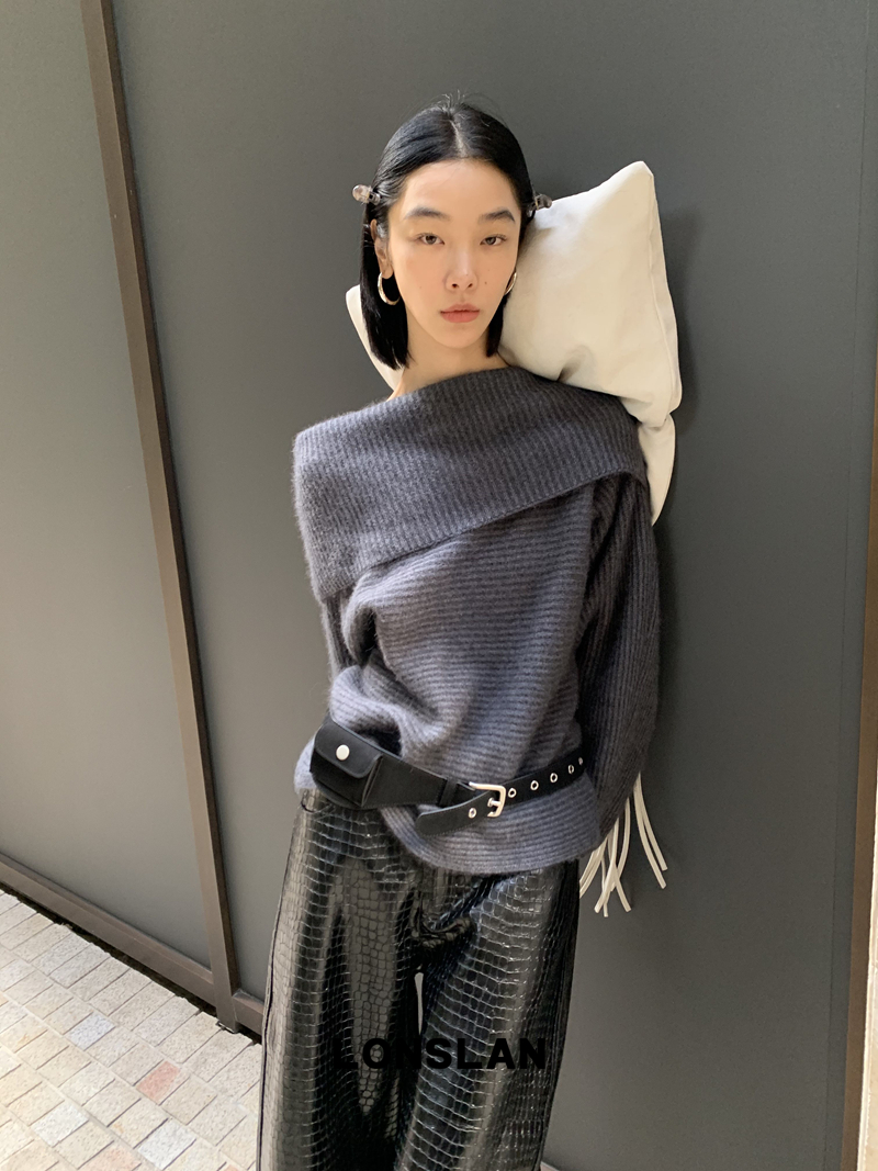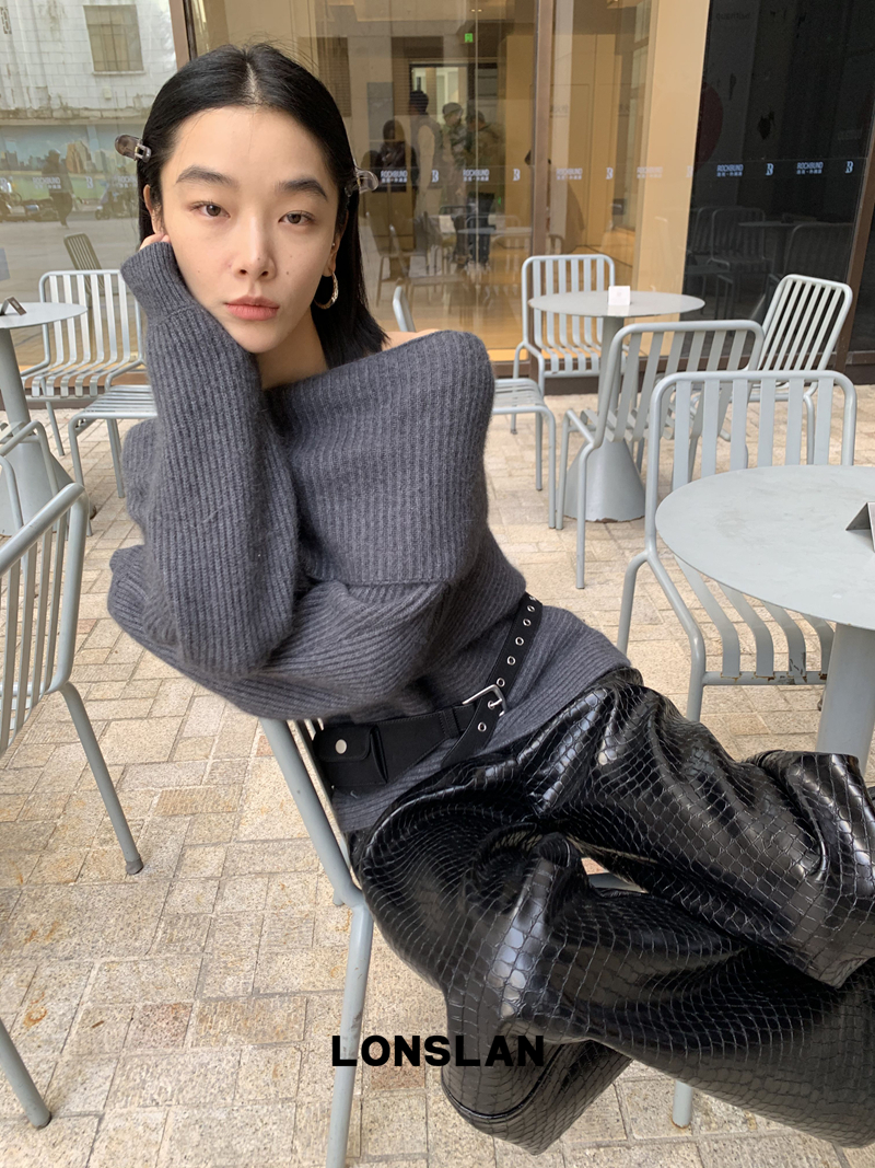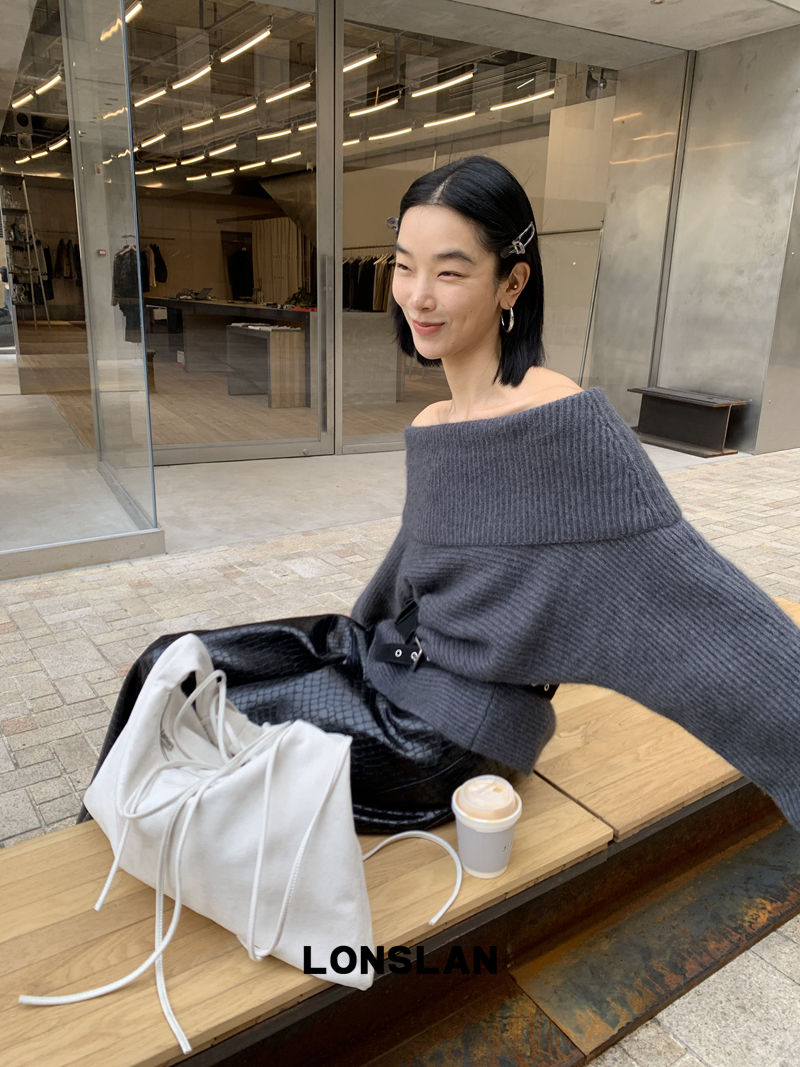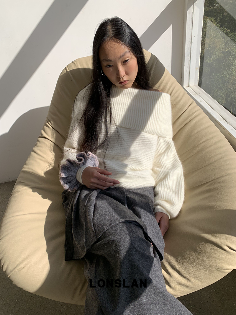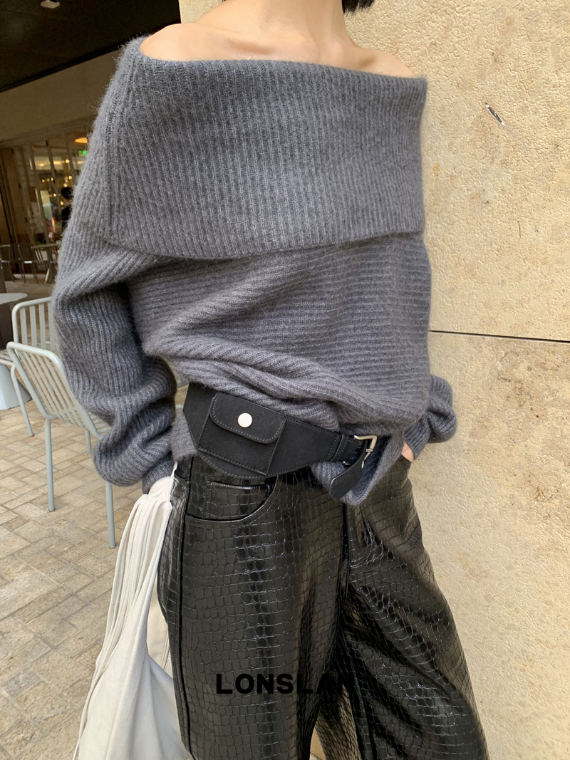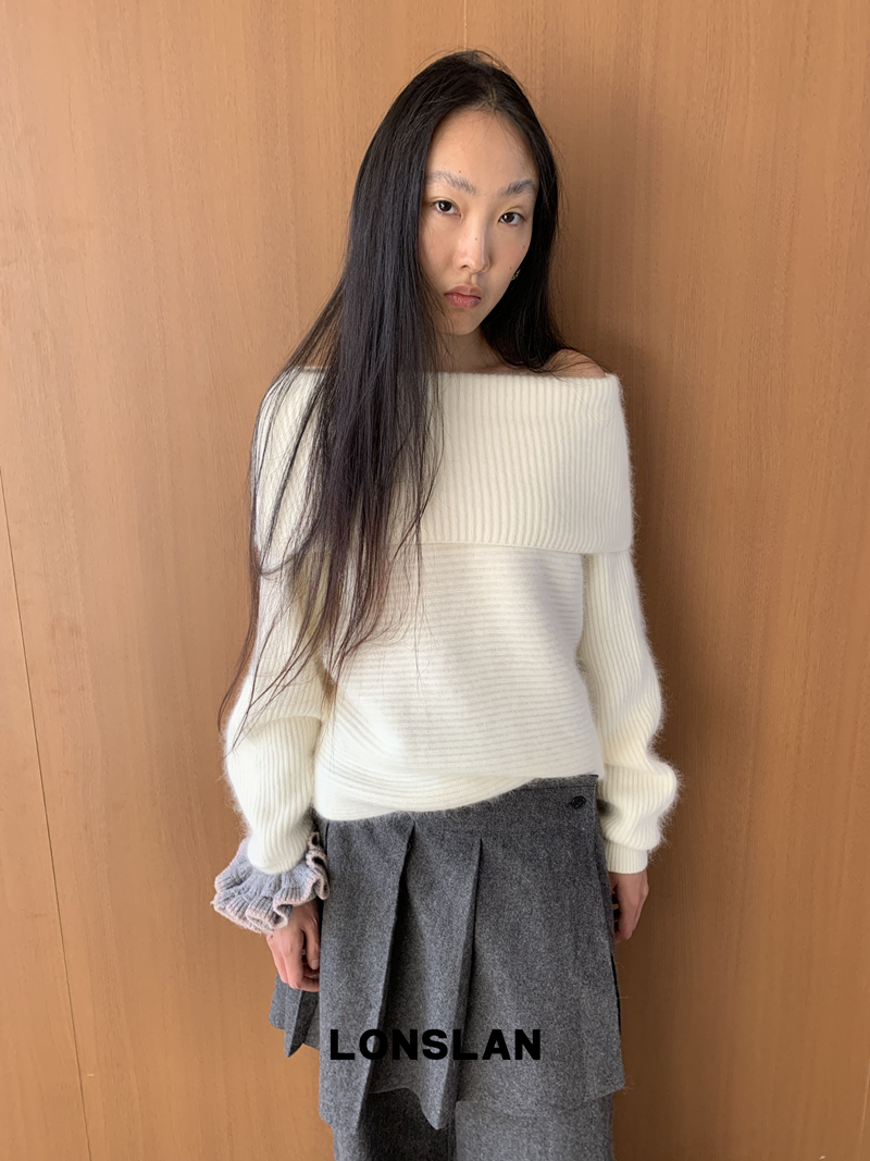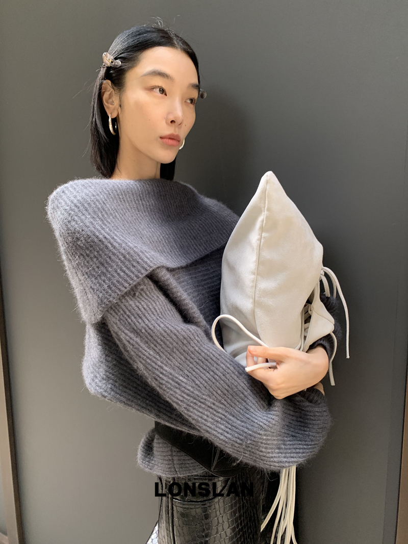 LONSLAN One-Character Shoulder Rabbit Fur Stripe Sweater