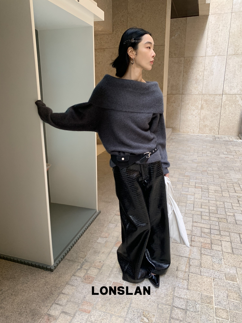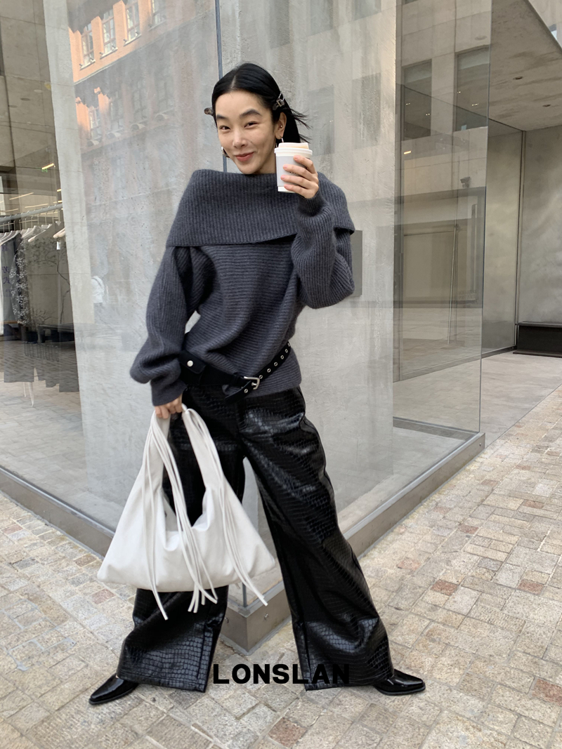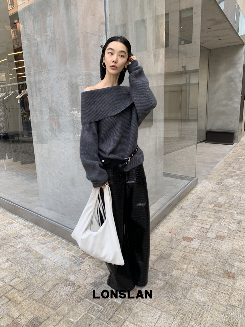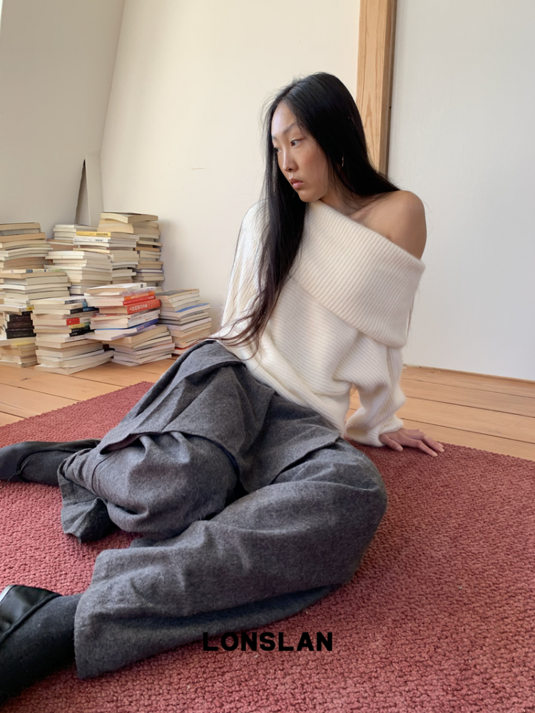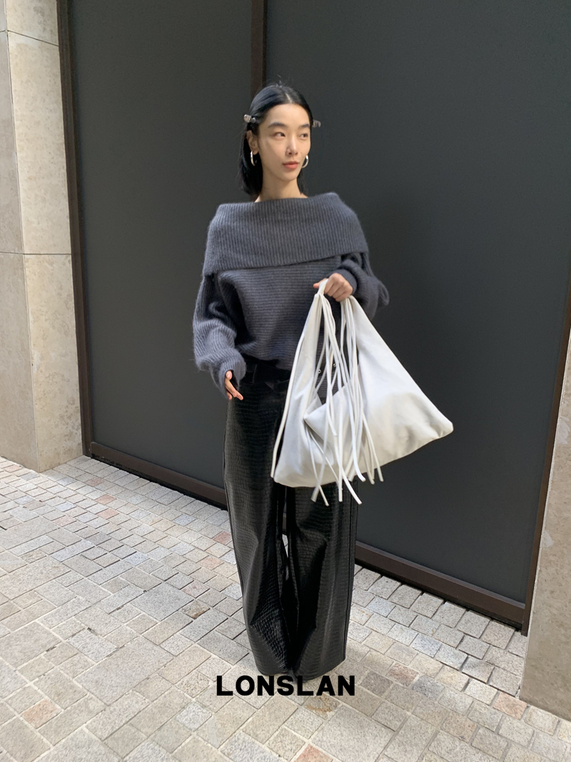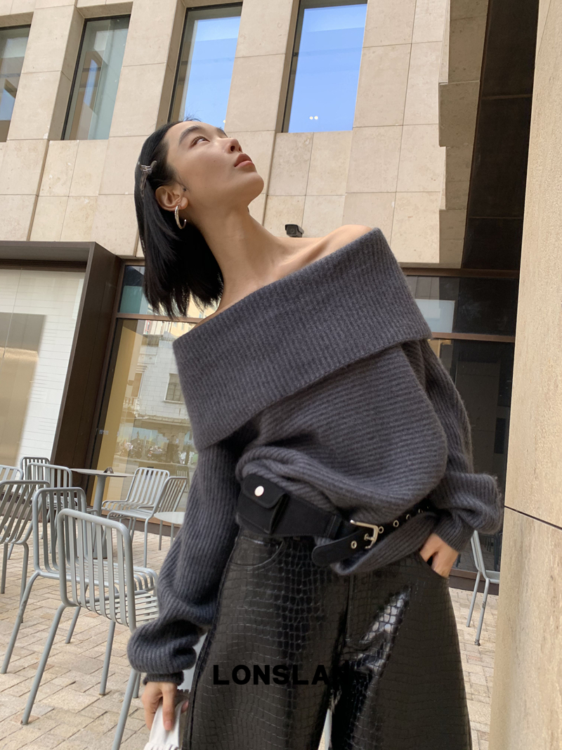 LONSLAN One-Character Shoulder Rabbit Fur Stripe Sweater