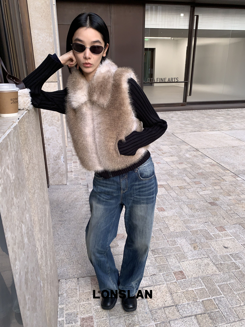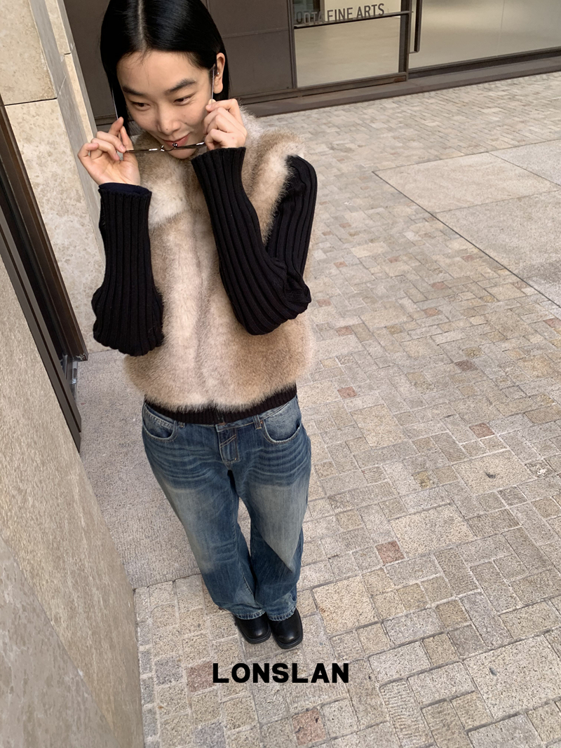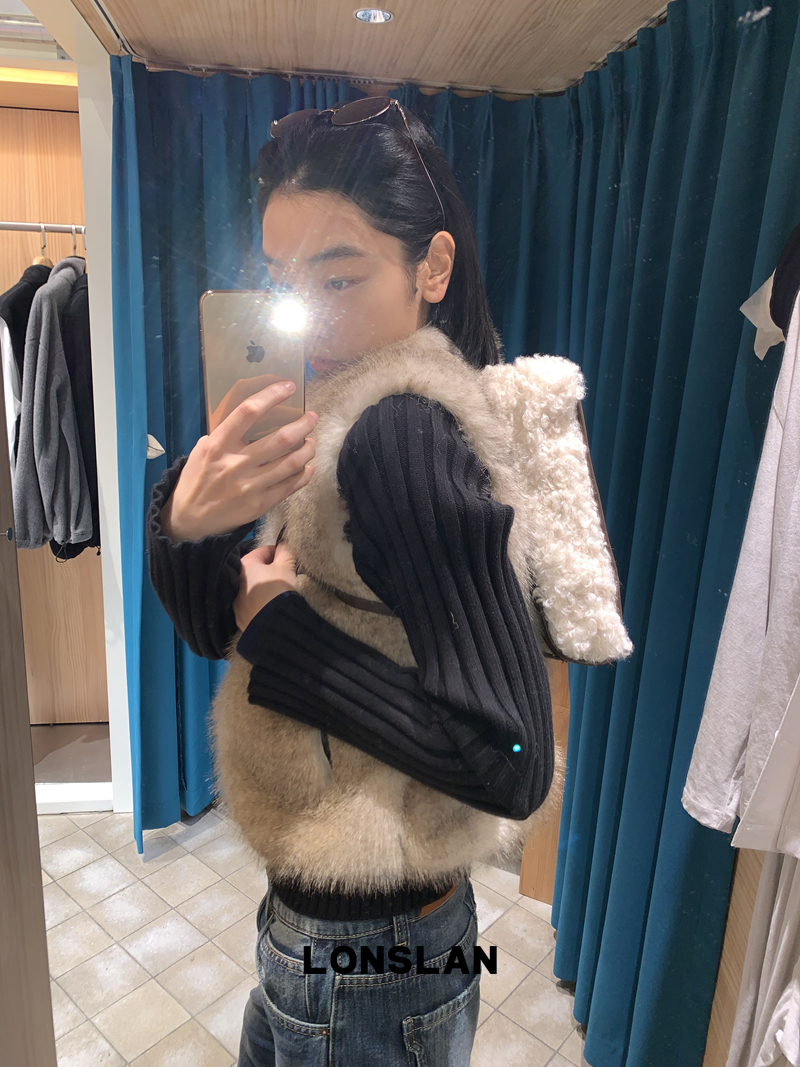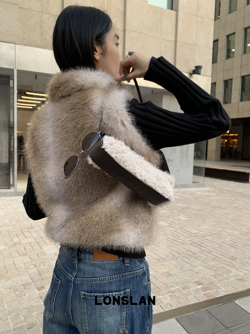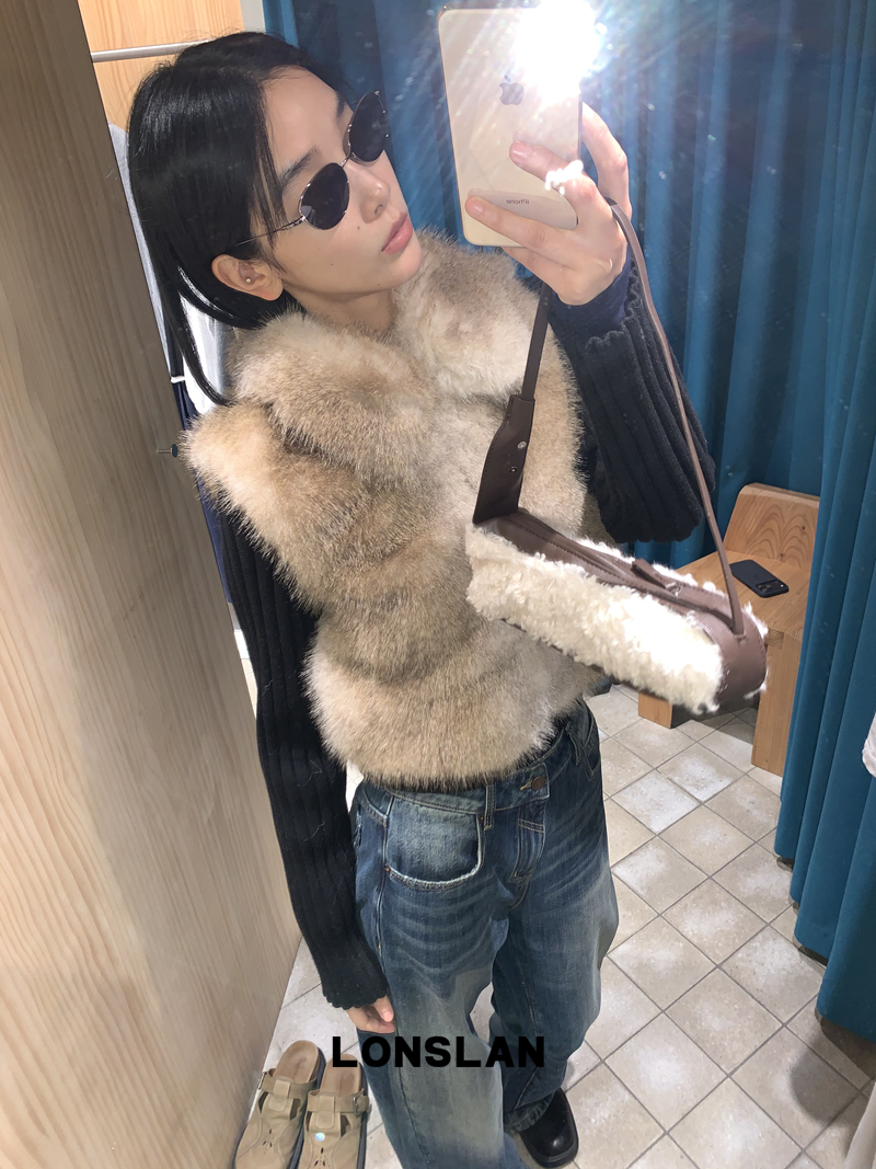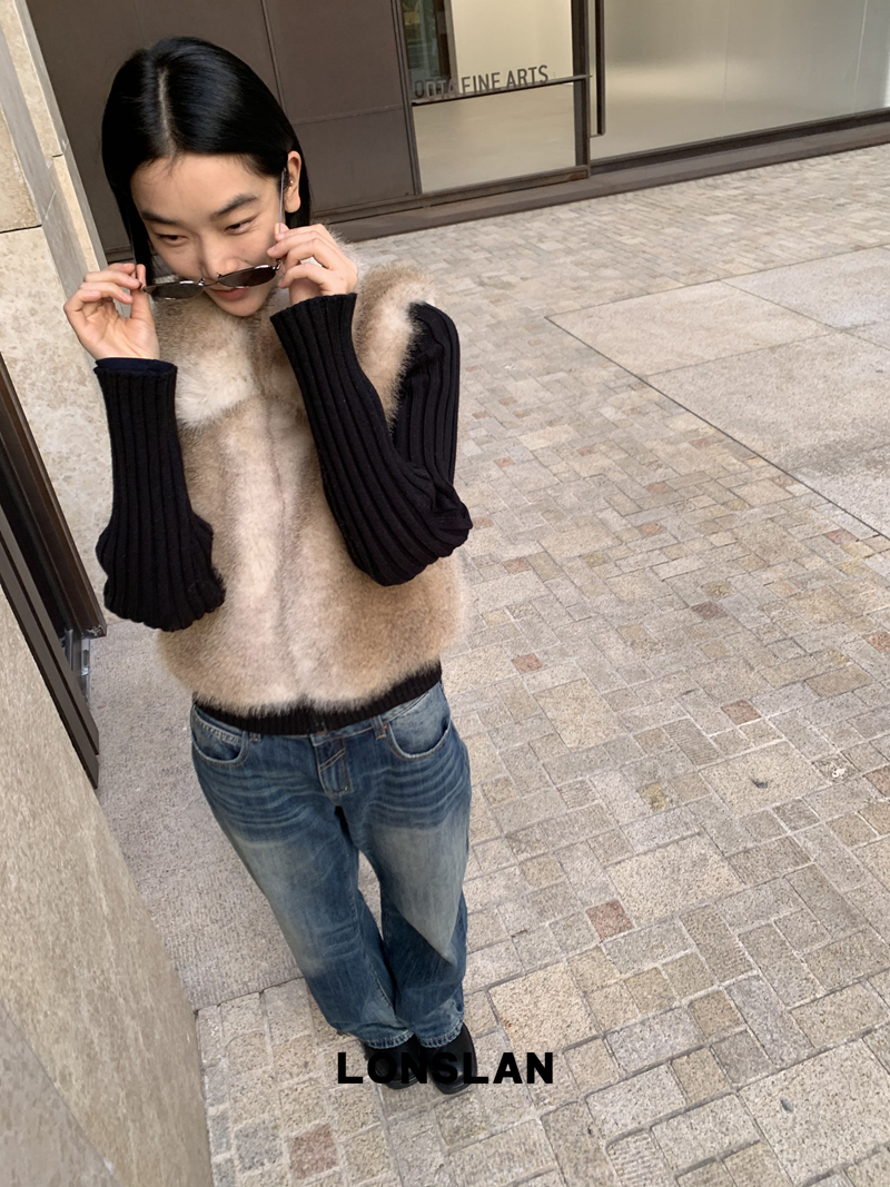LONSLAN Knit Sleeve Seamless Fake Two-Piece Fur Jacket