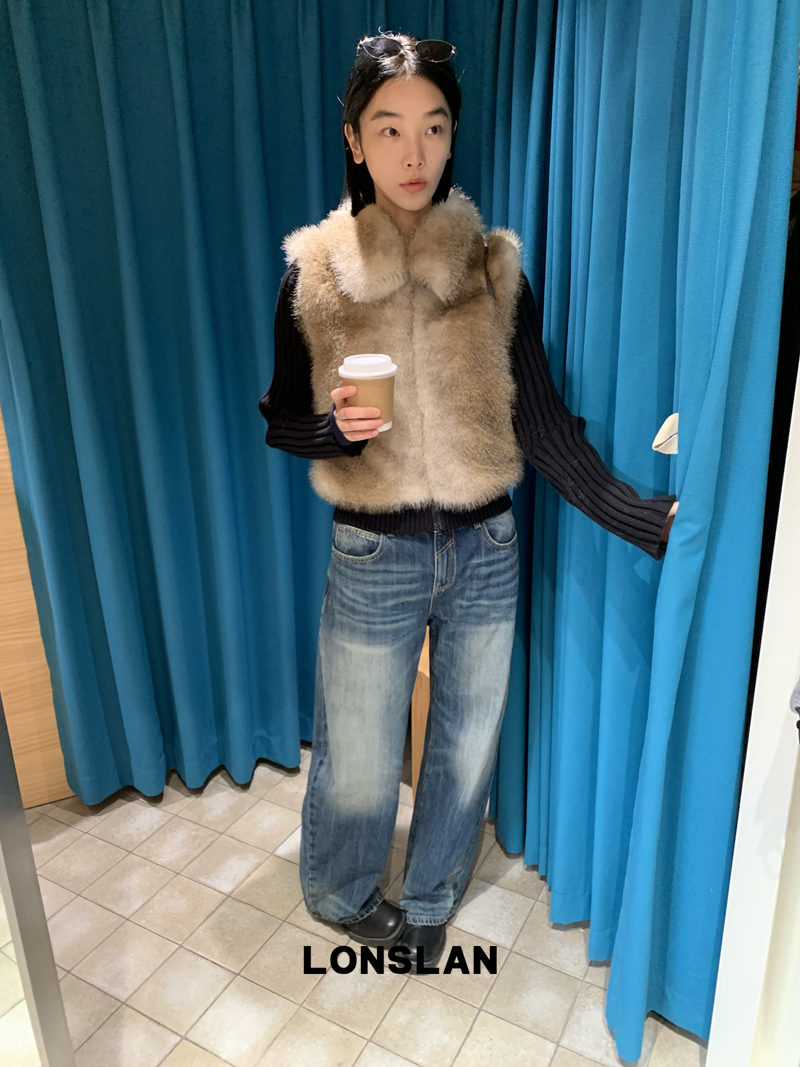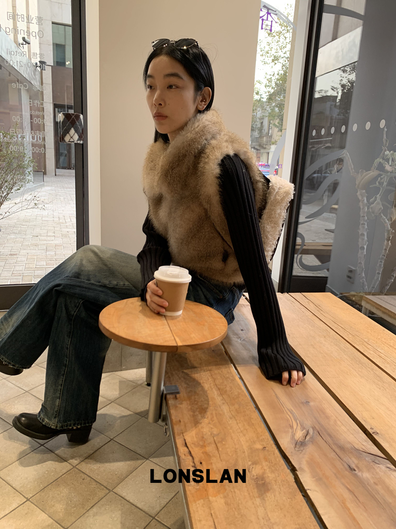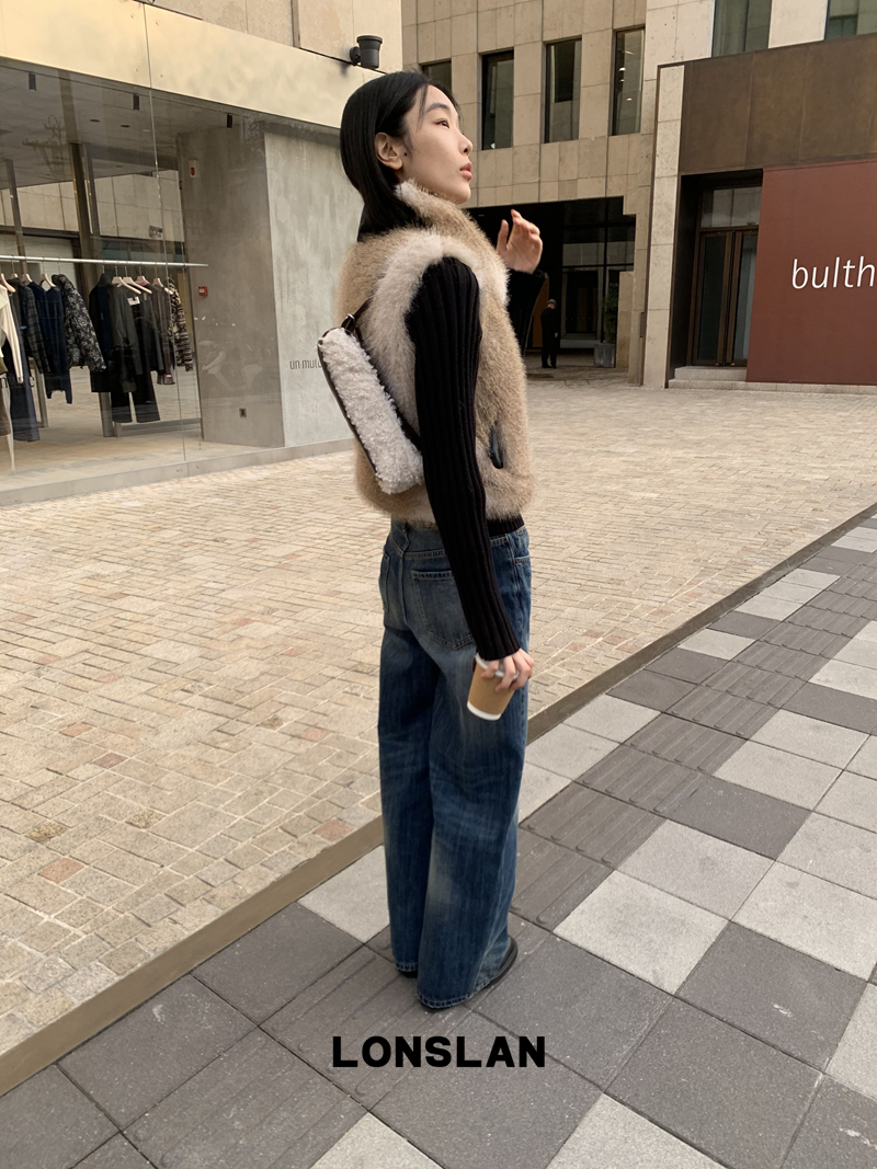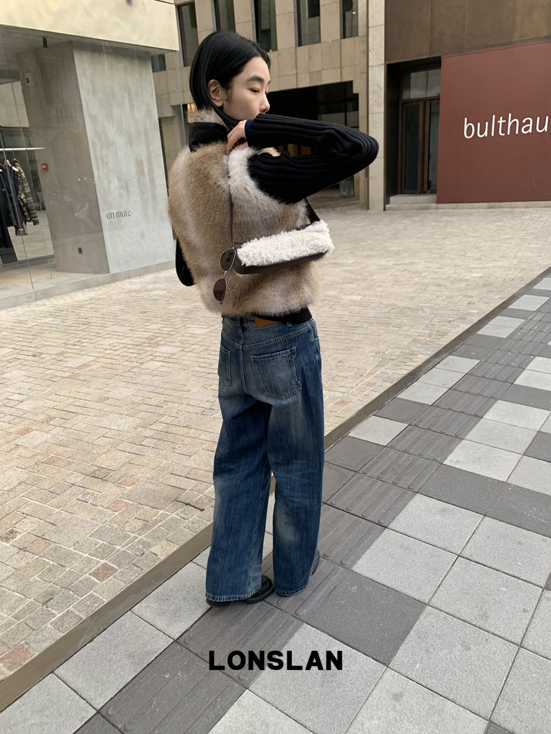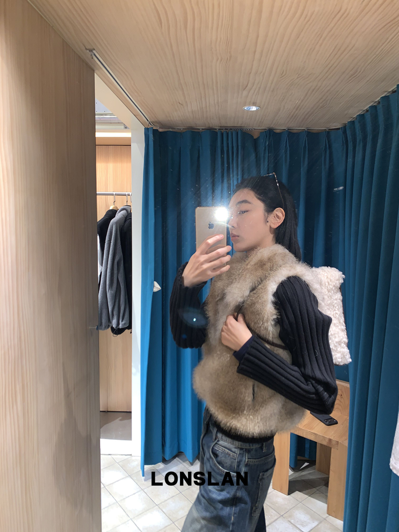 LONSLAN Knit Sleeve Seamless Fake Two-Piece Fur Jacket