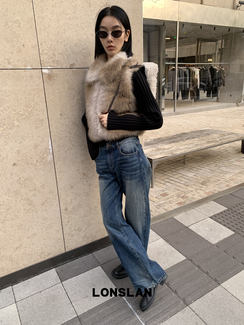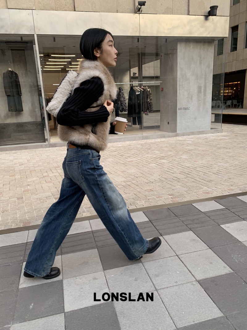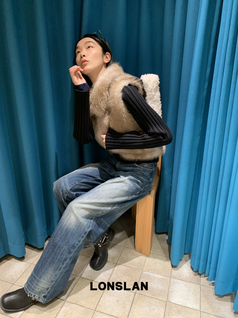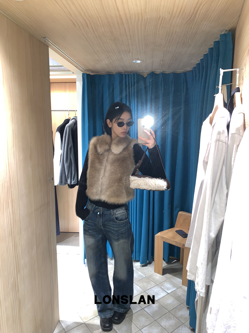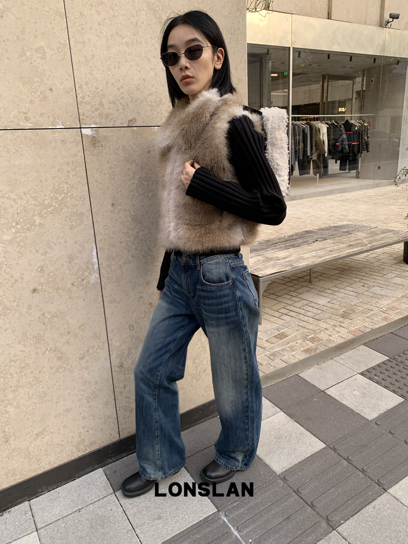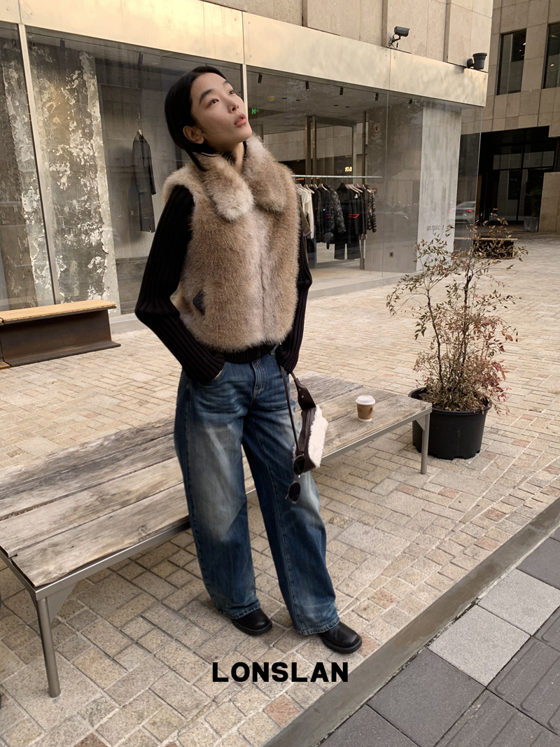 LONSLAN Knit Sleeve Seamless Fake Two-Piece Fur Jacket