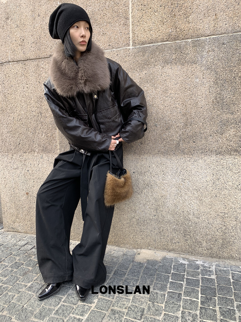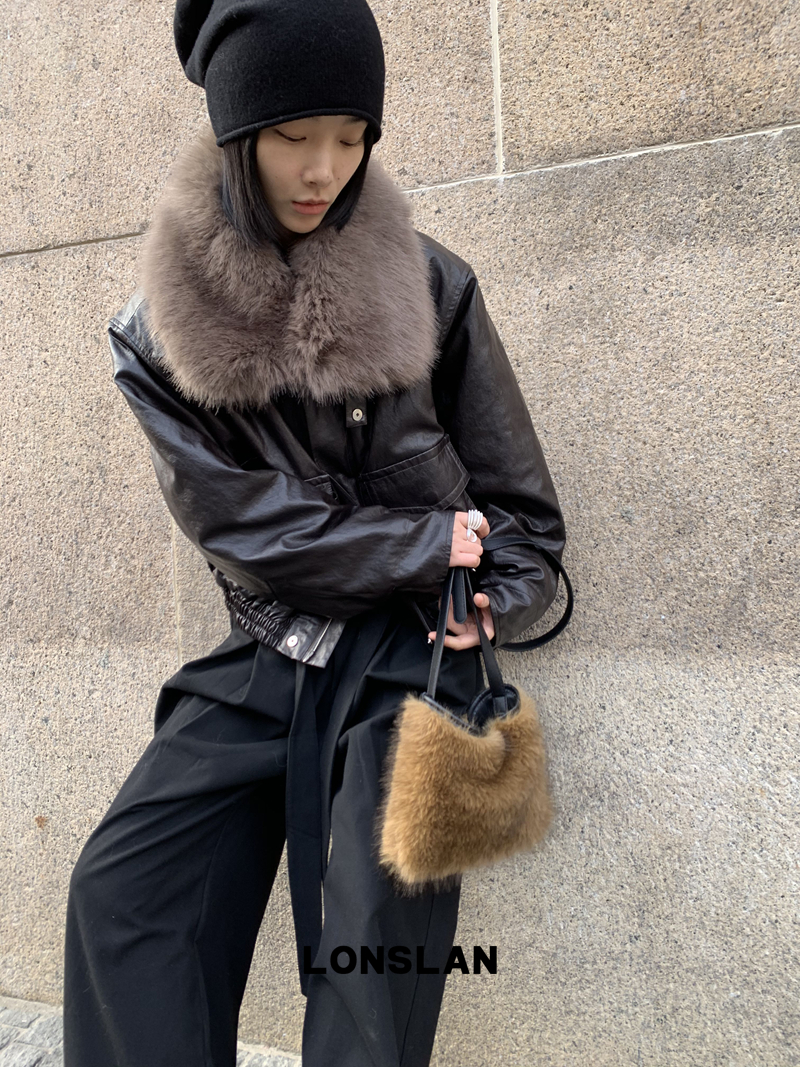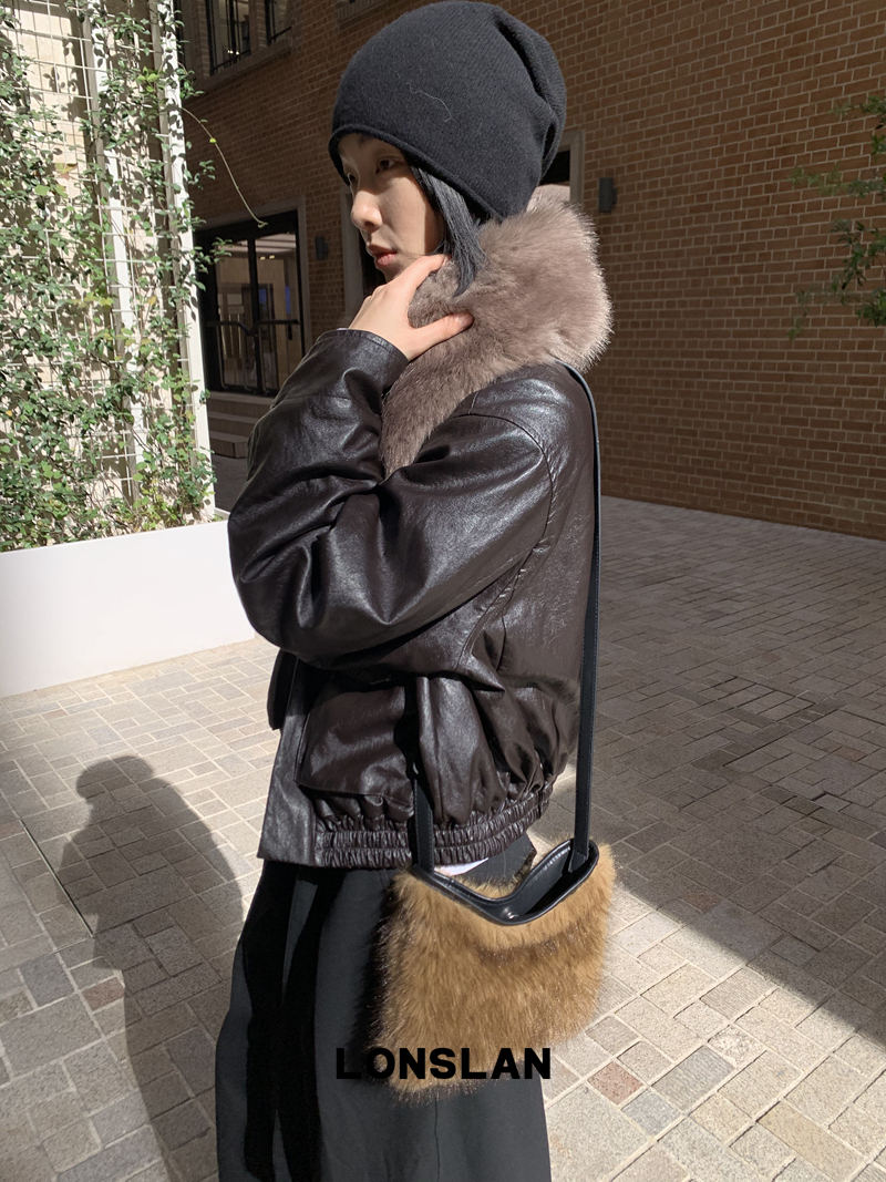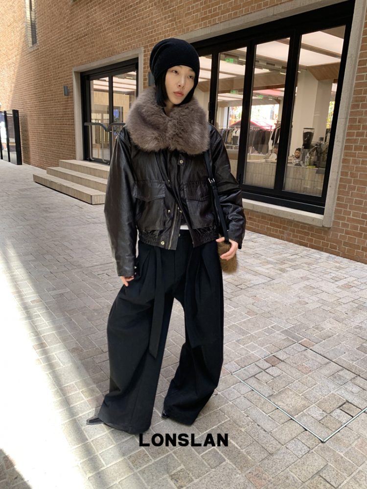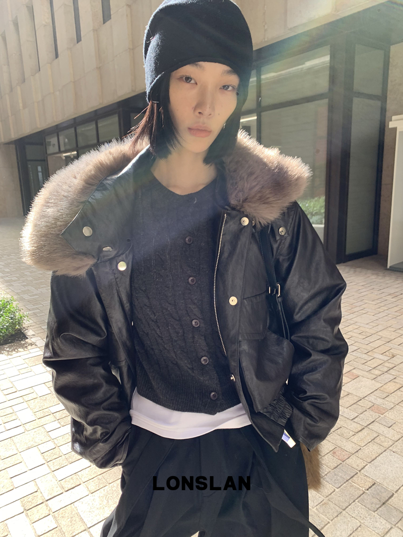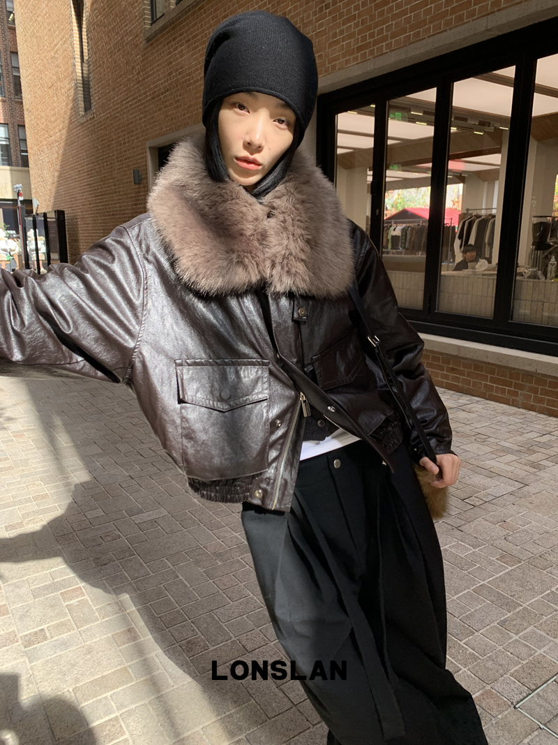 LONSLAN Large Hair Collar Vintage Black Brown Leather Jacket