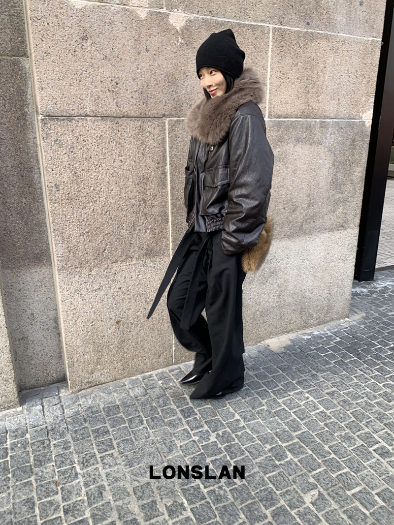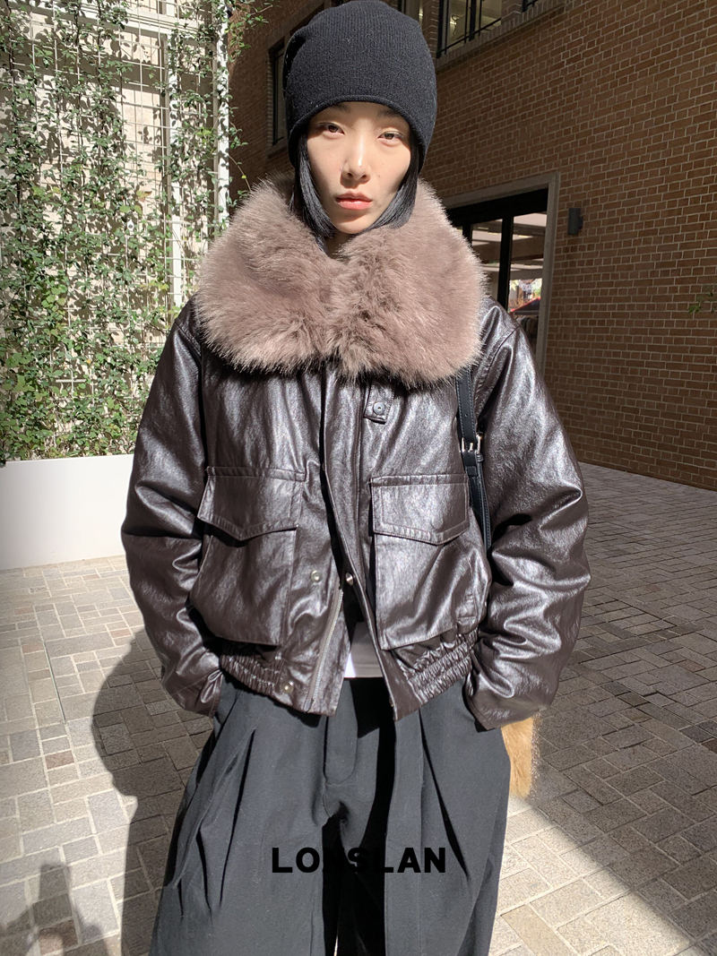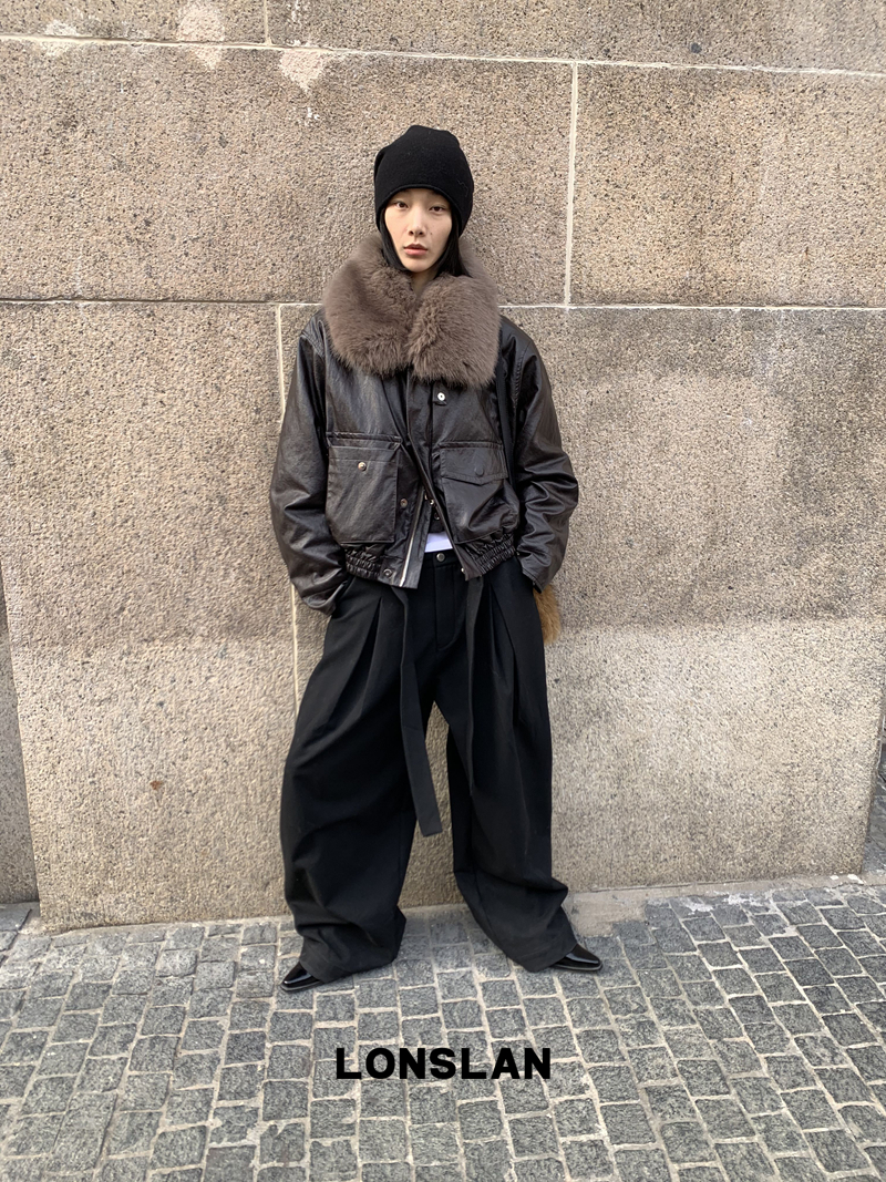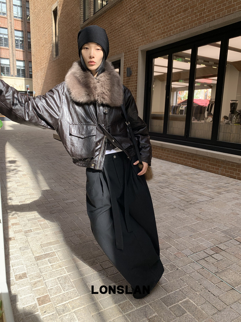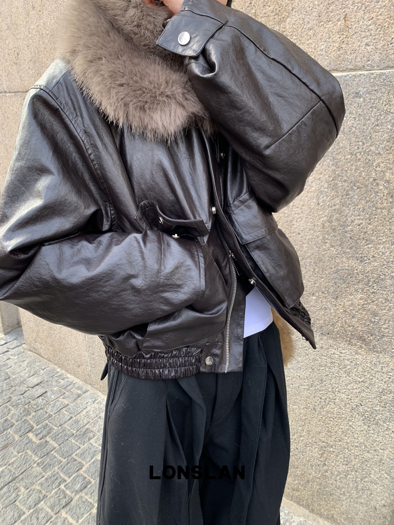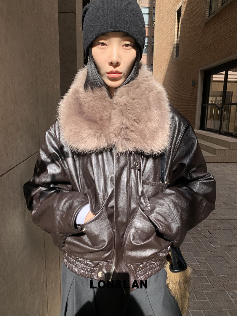 LONSLAN Large Hair Collar Vintage Black Brown Leather Jacket