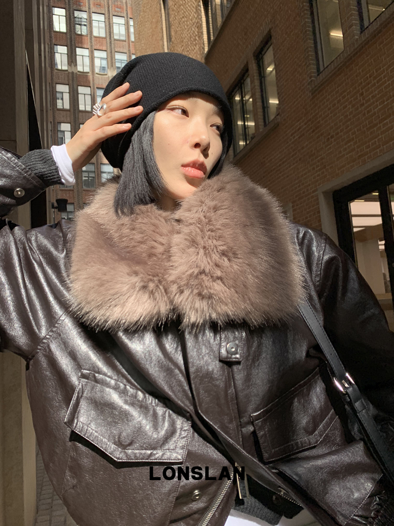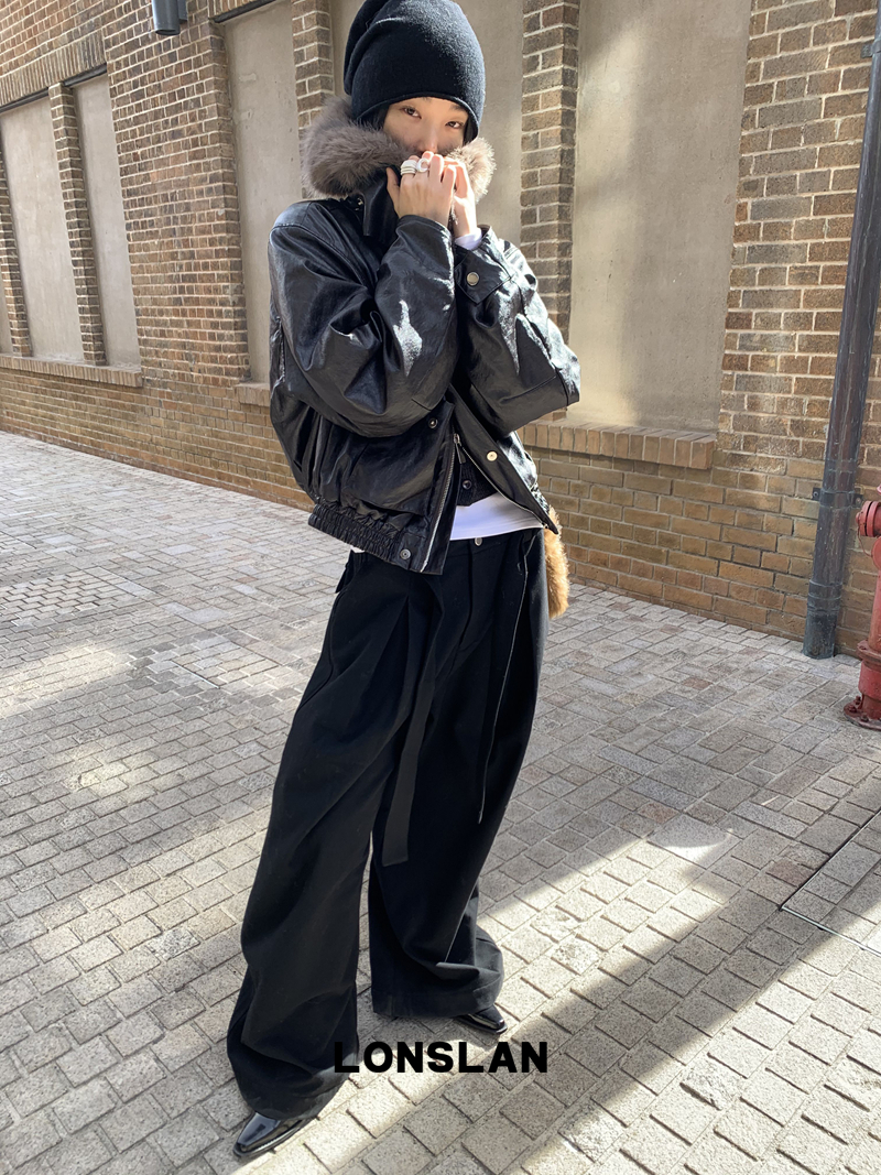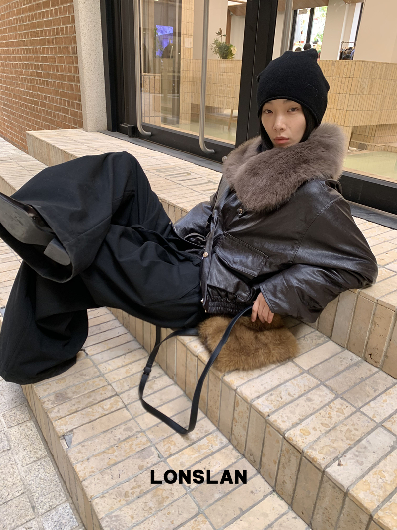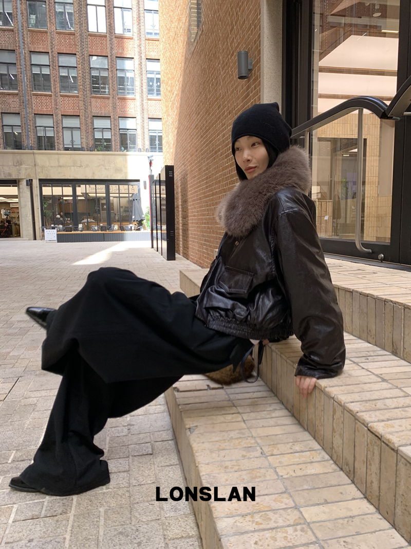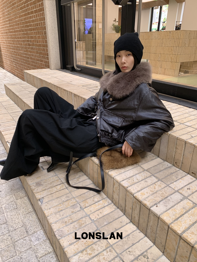 LONSLAN Large Hair Collar Vintage Black Brown Leather Jacket