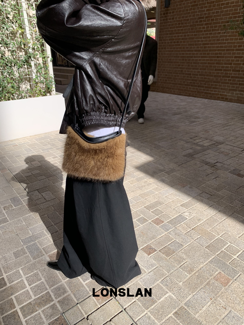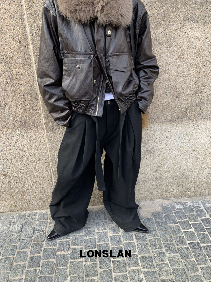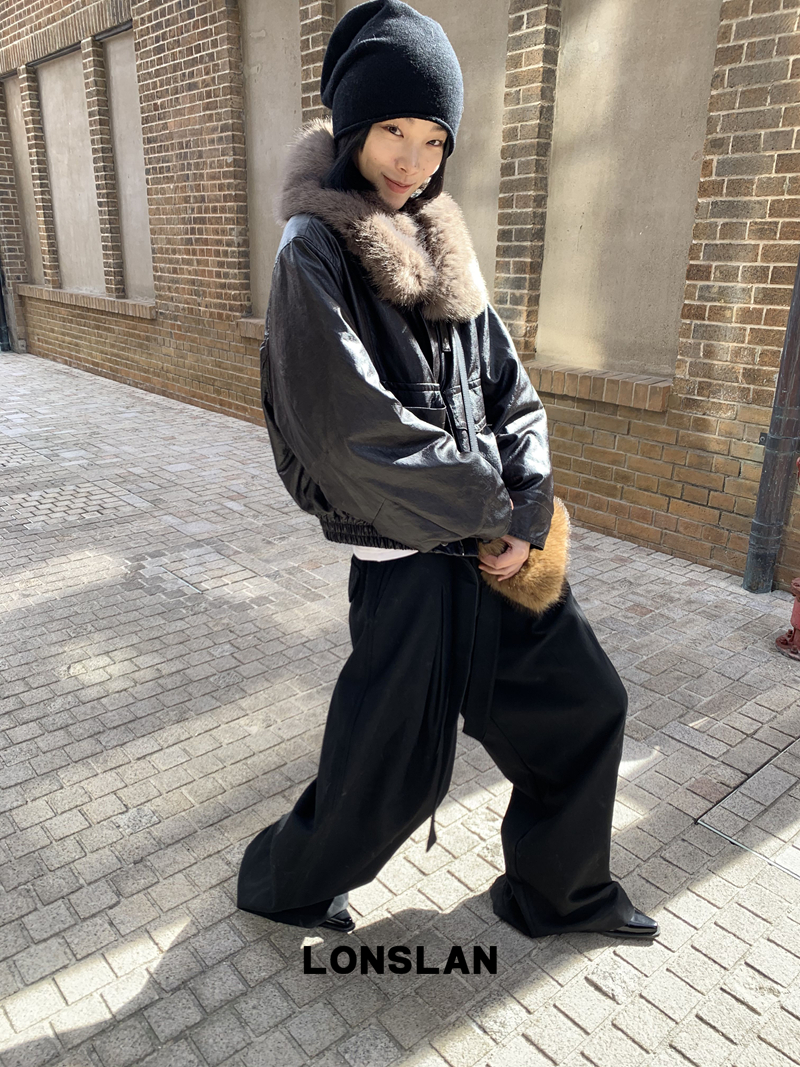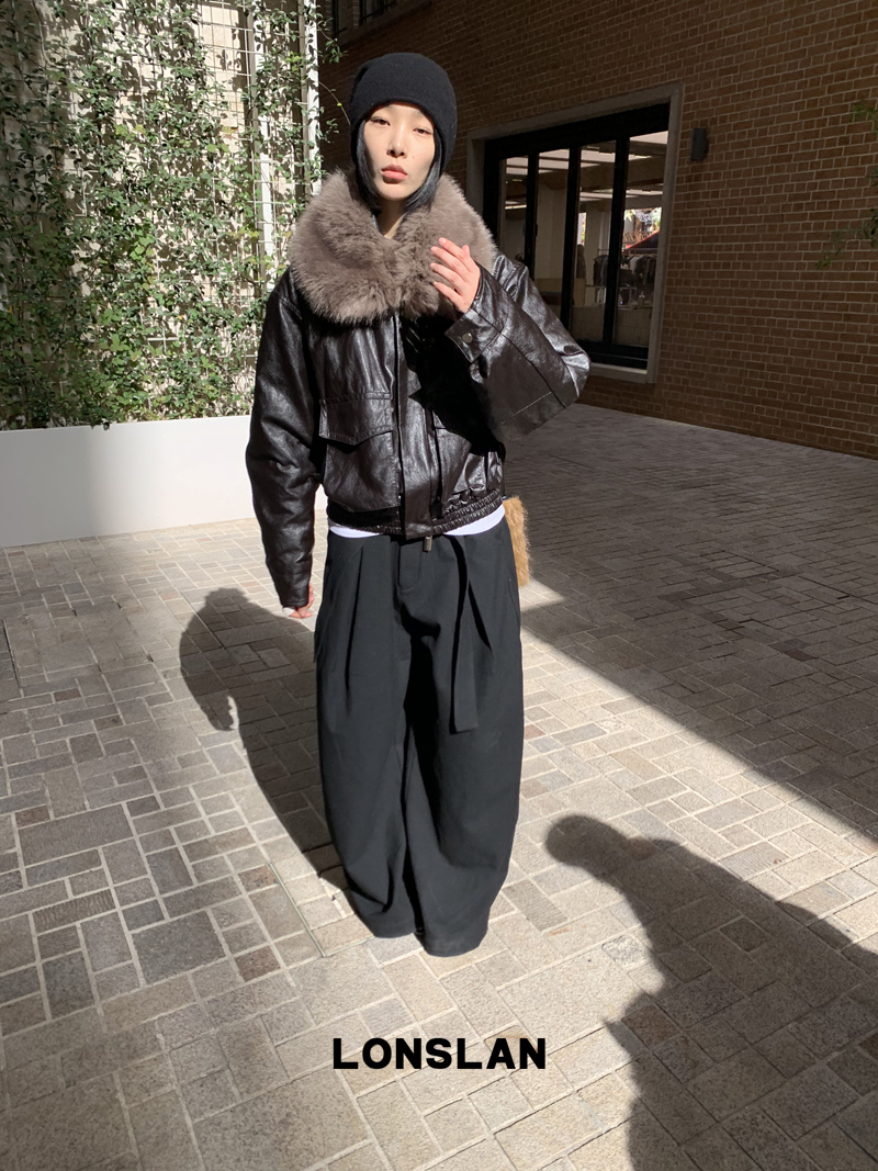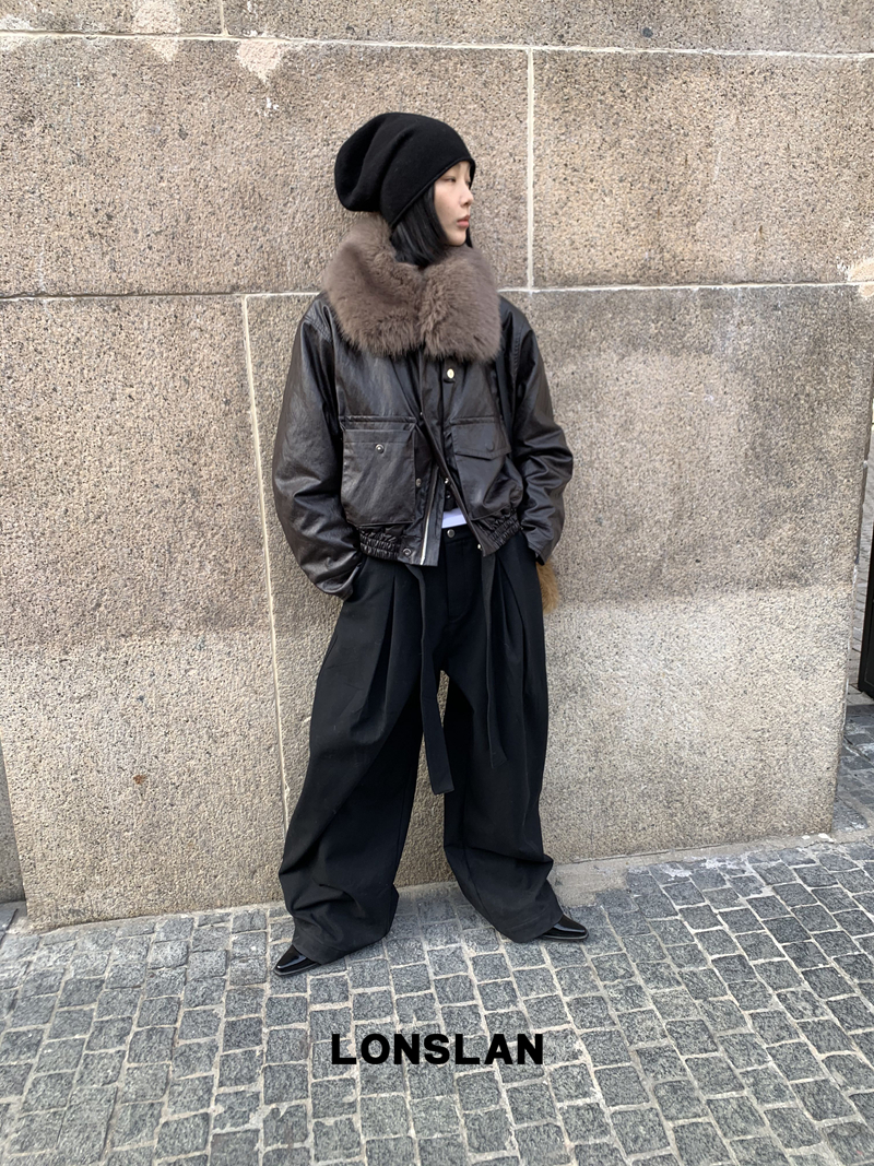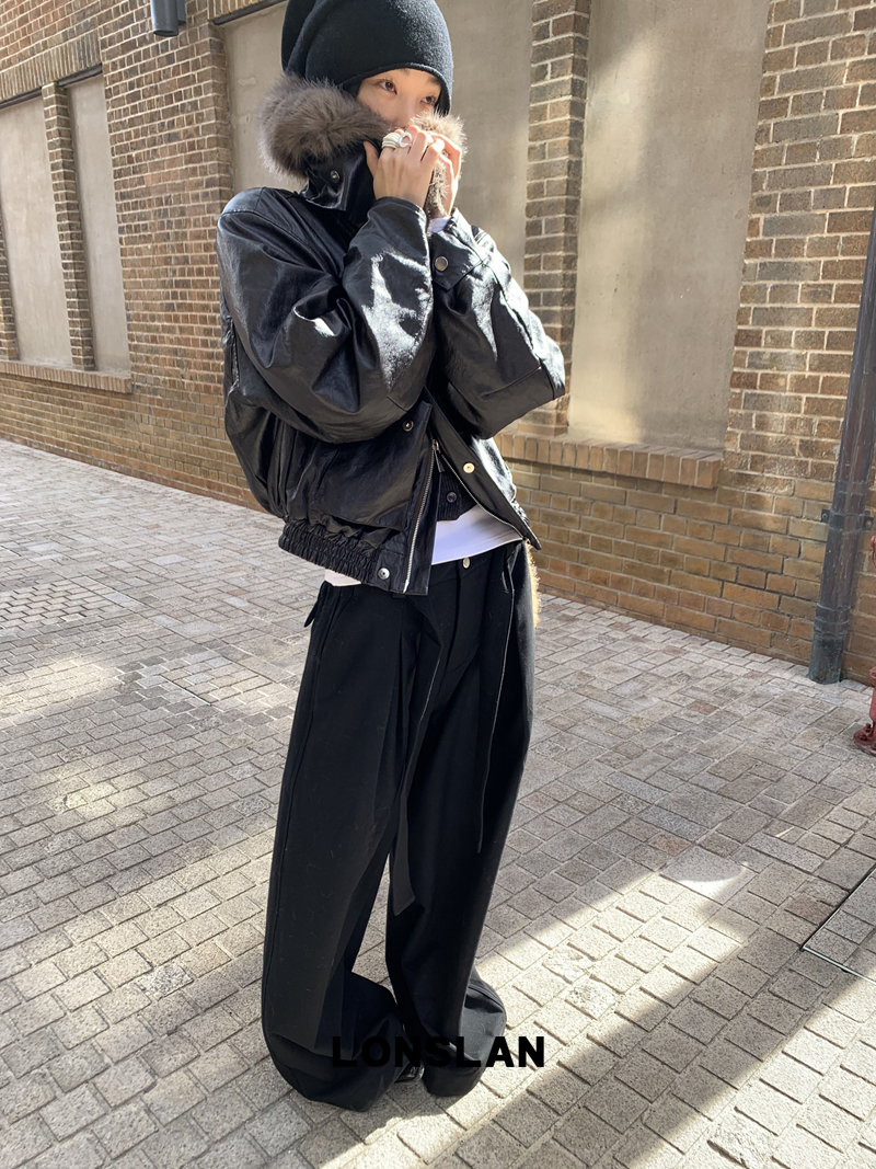 LONSLAN Large Hair Collar Vintage Black Brown Leather Jacket