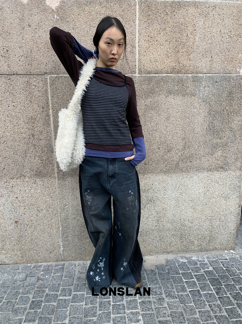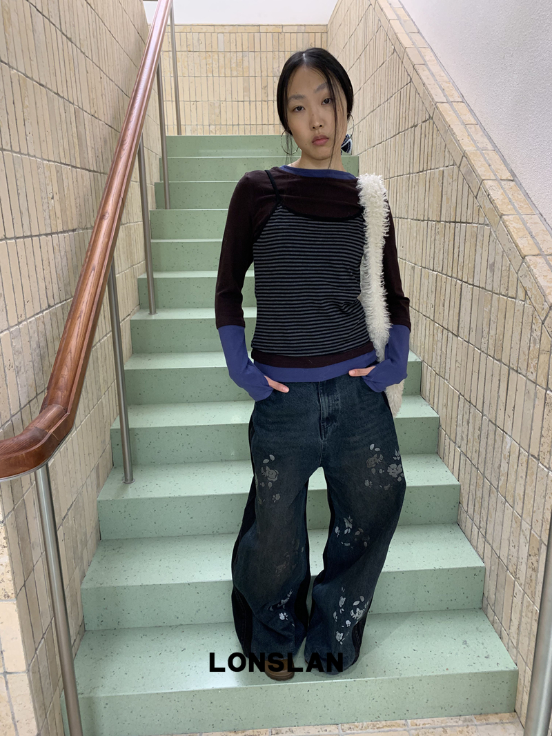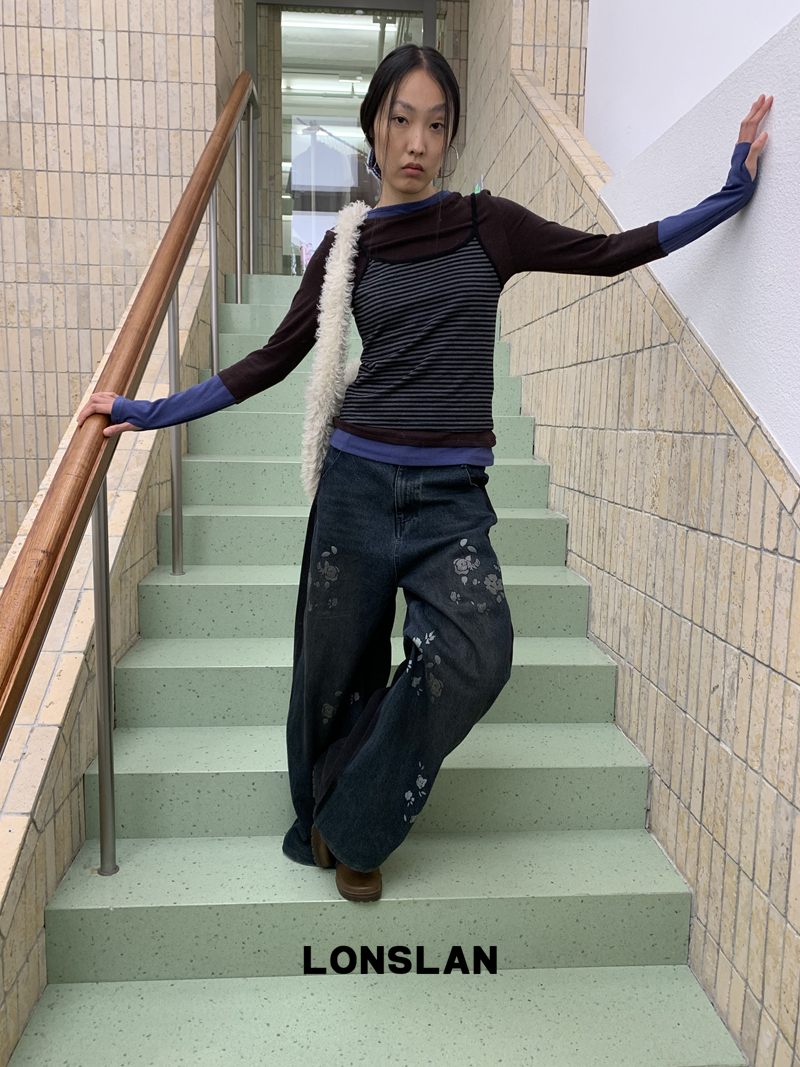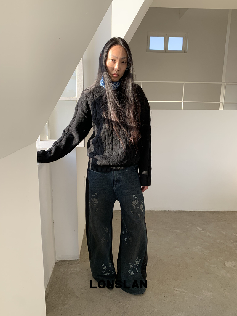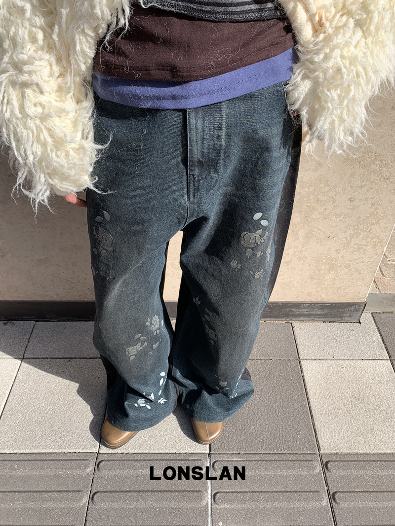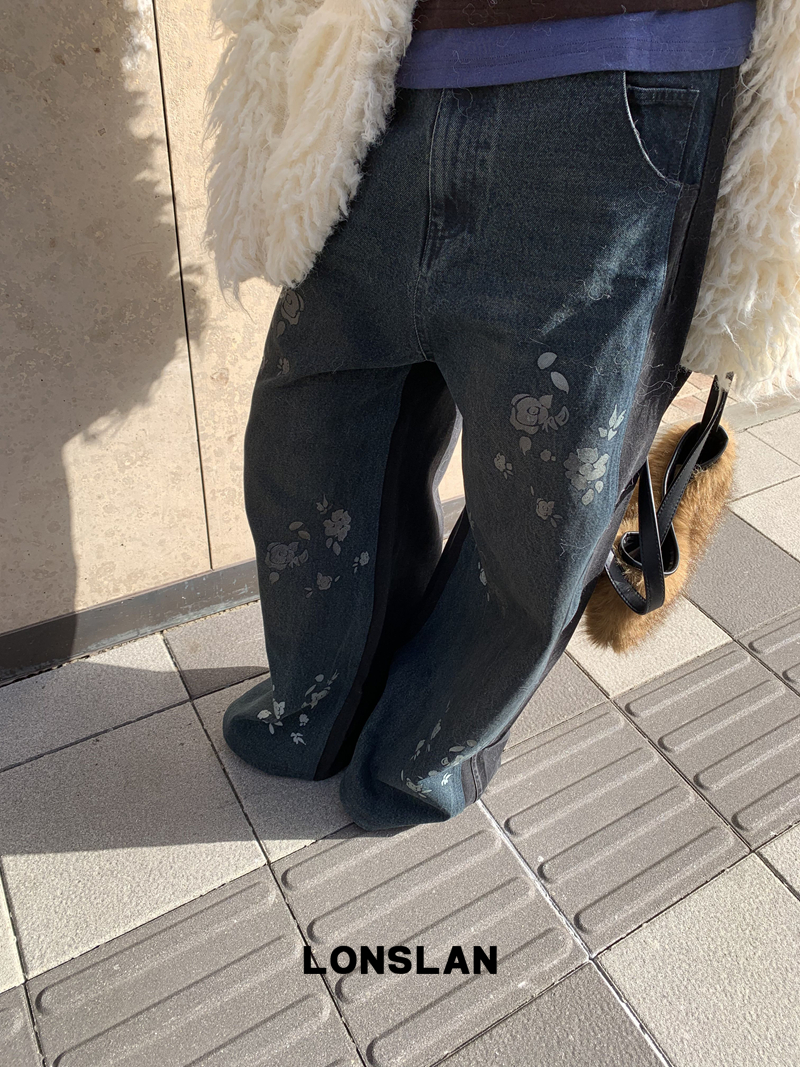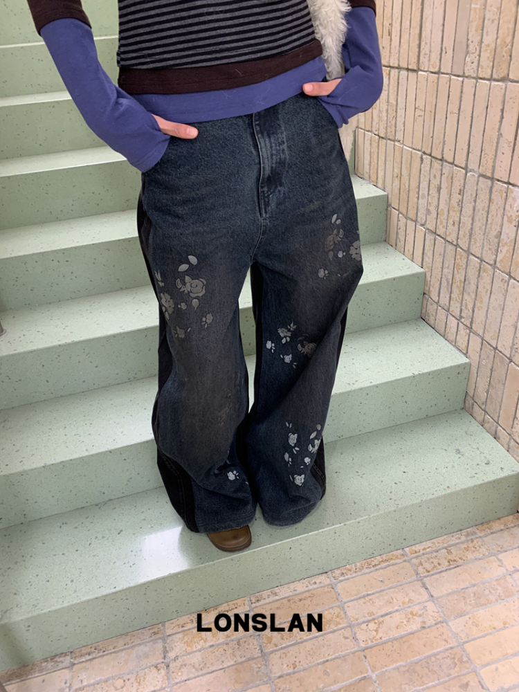 LONSLAN Flower Print Sewn Jeans Wide Leg Pants