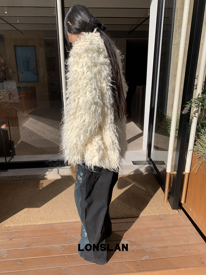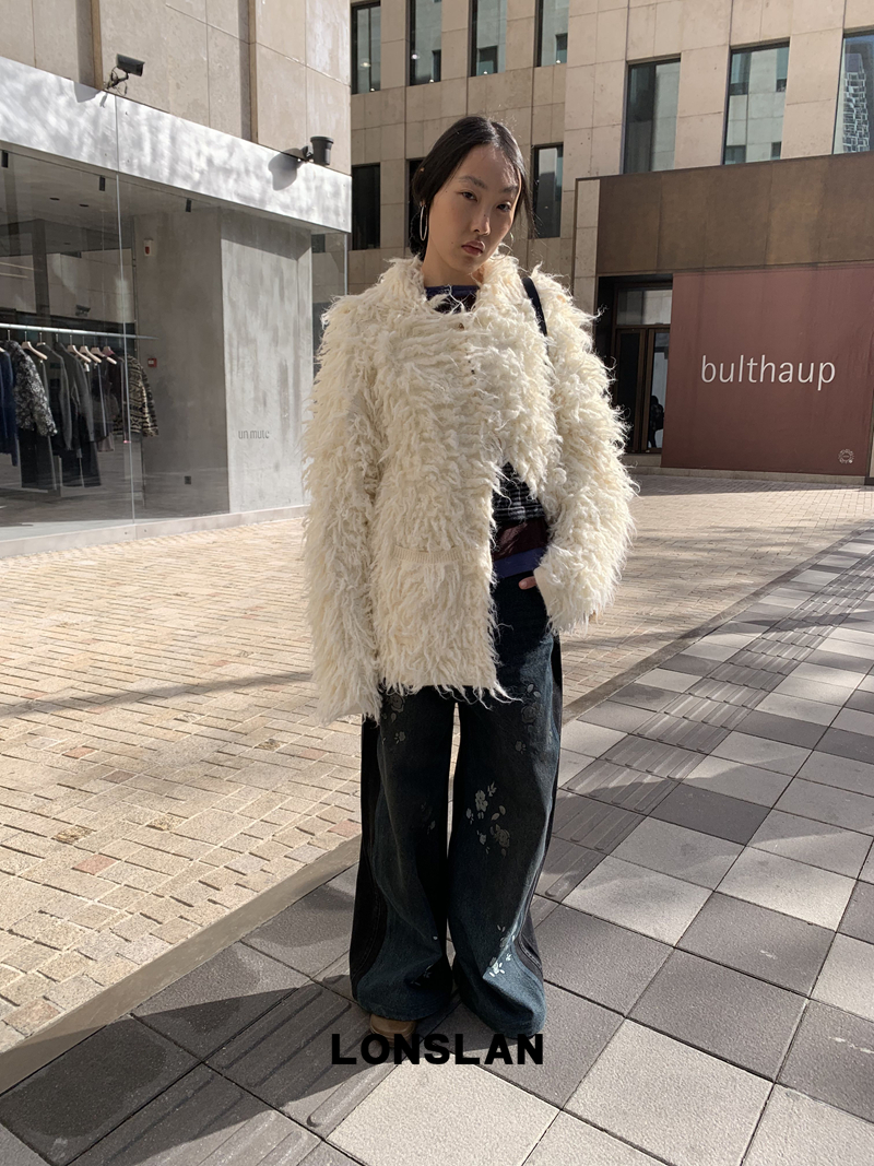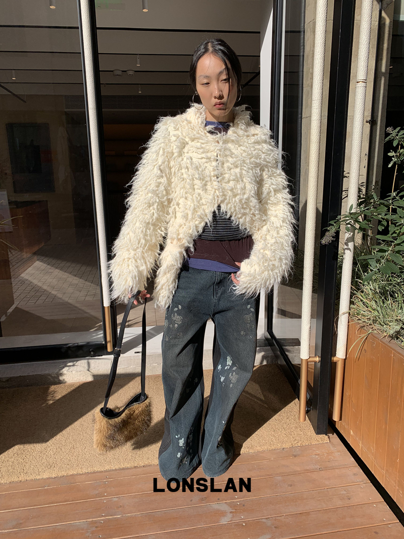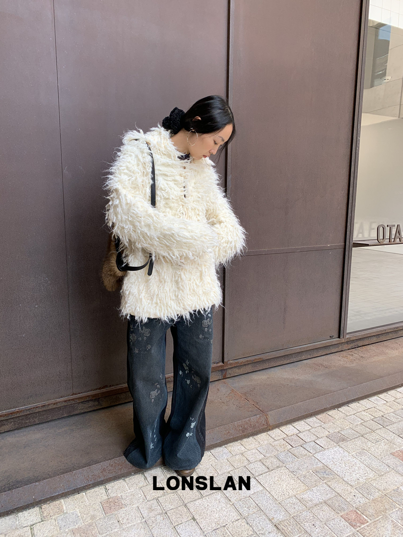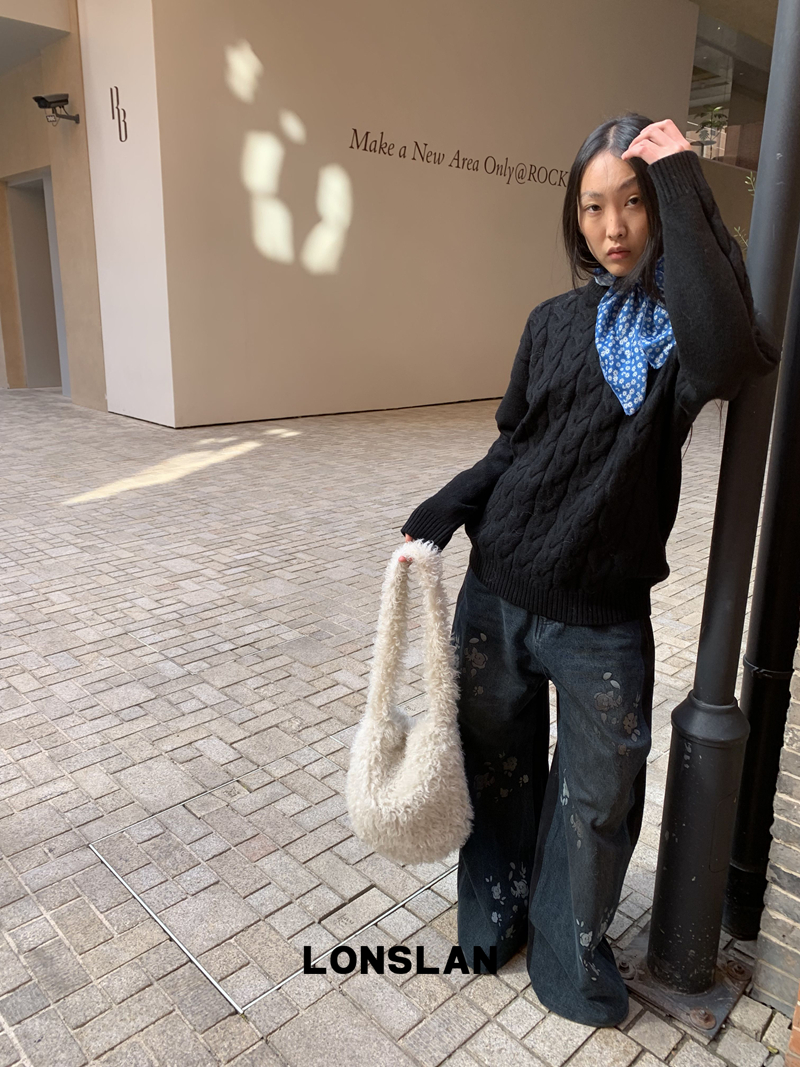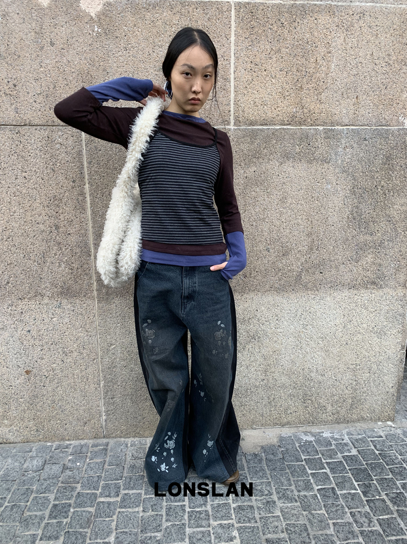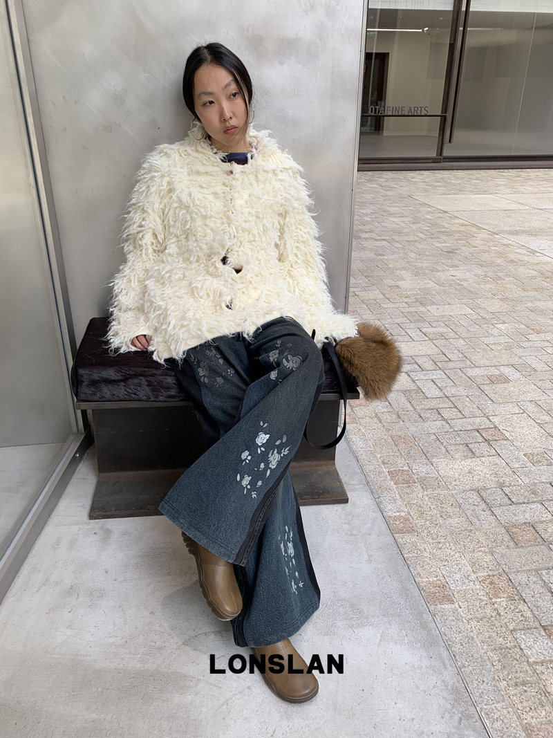 LONSLAN Flower Print Sewn Jeans Wide Leg Pants
