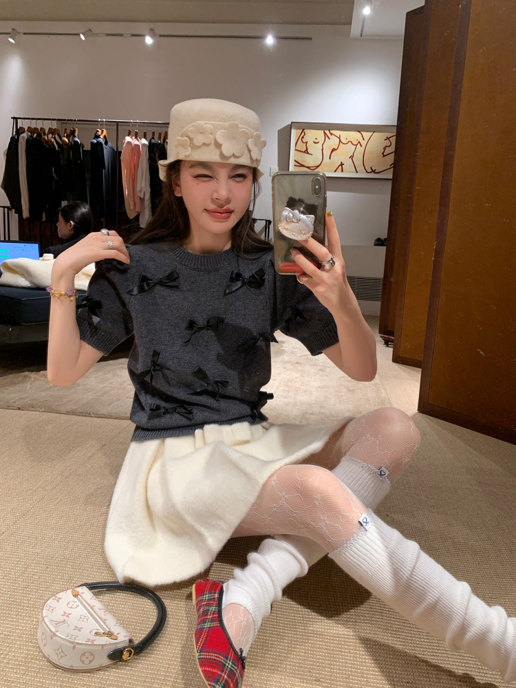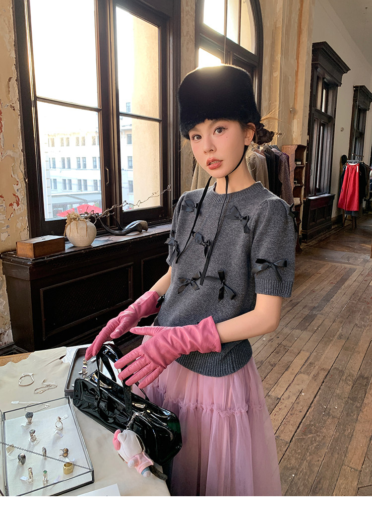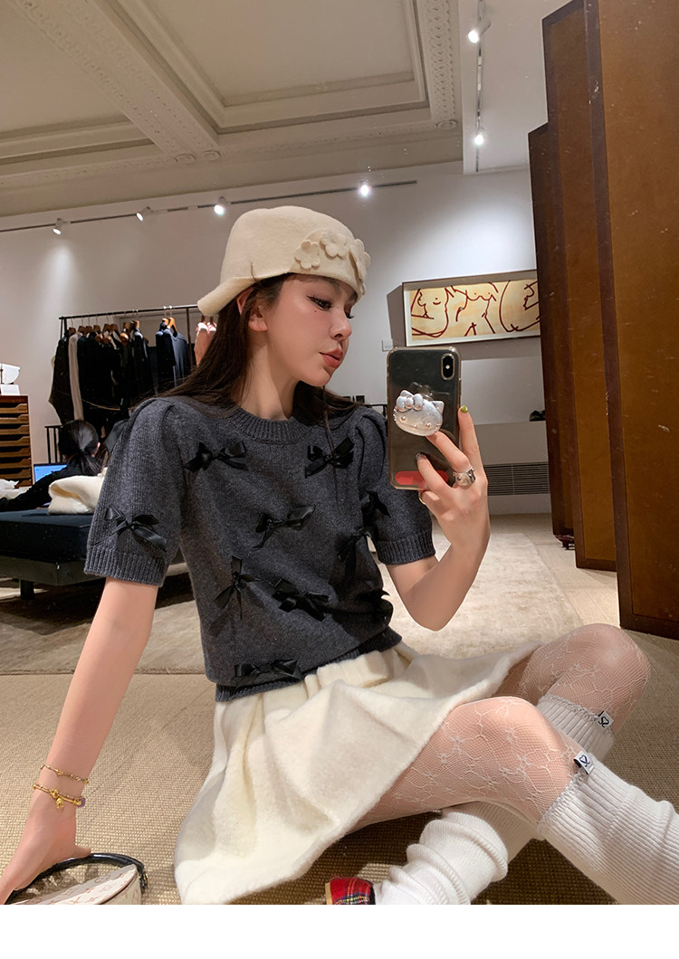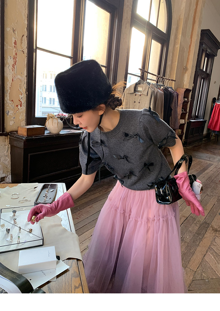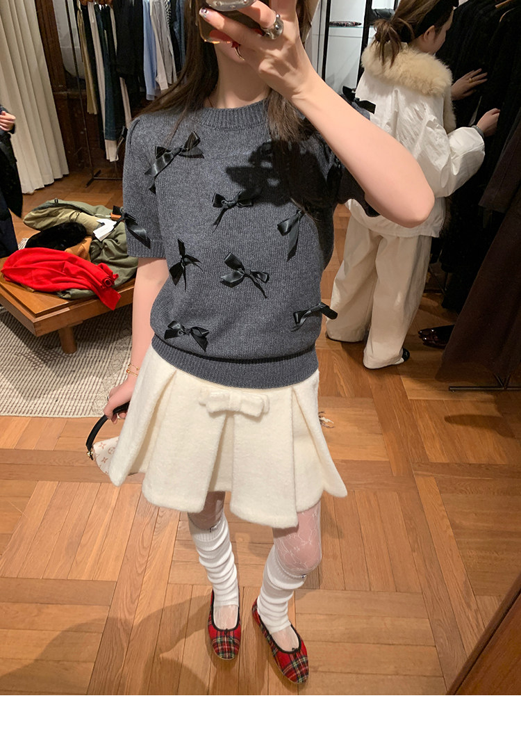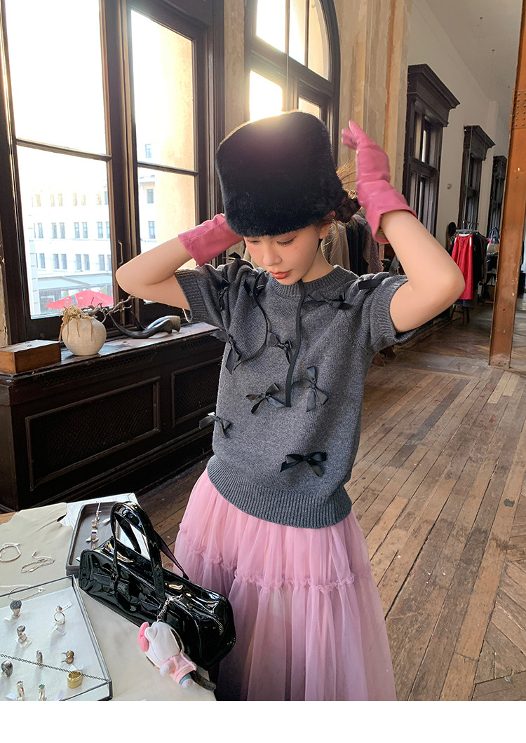 LRIB Vintage Prologue Ribbon Bow Gray Knit Short Sleeve Top