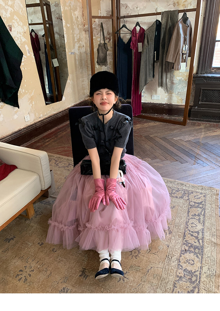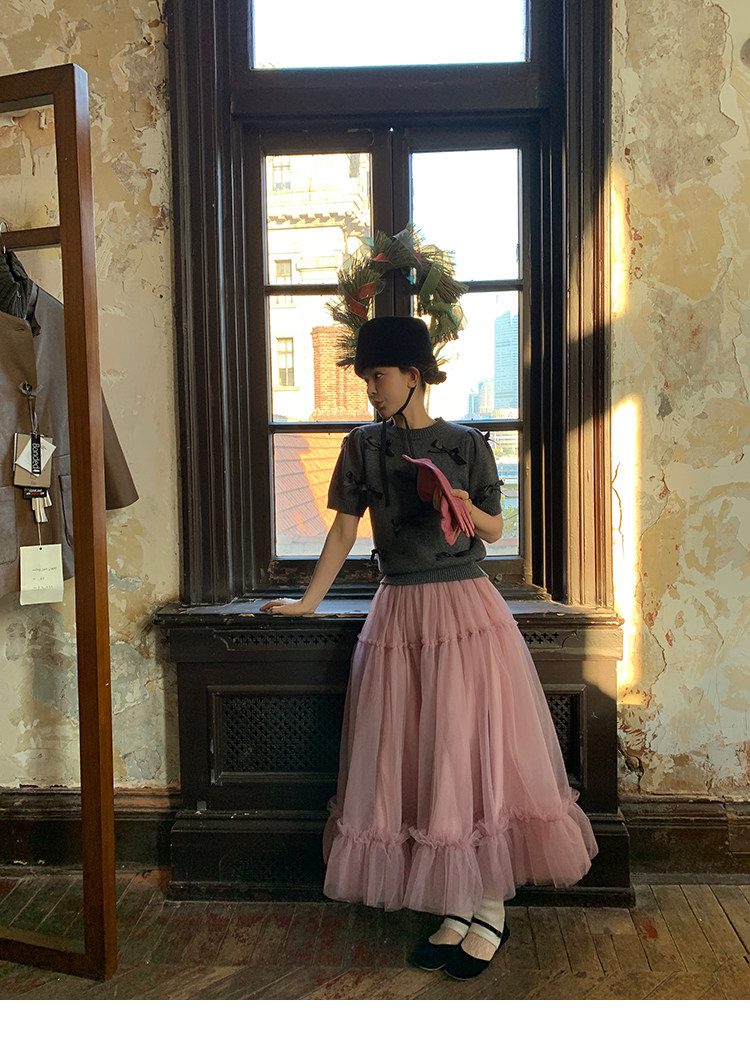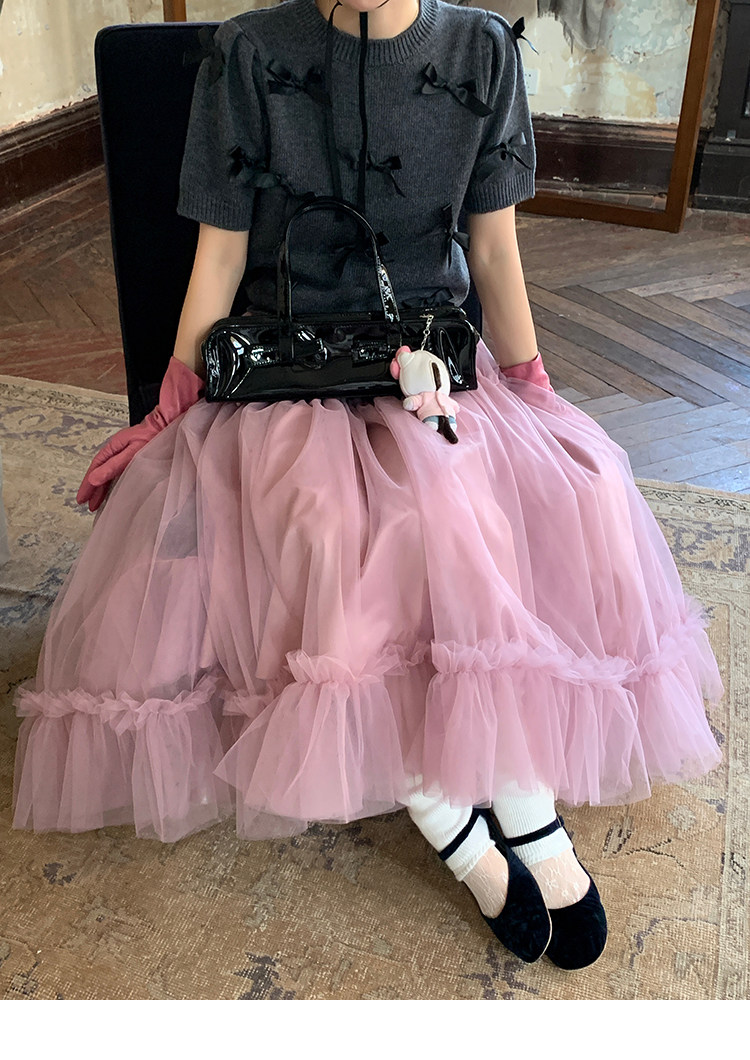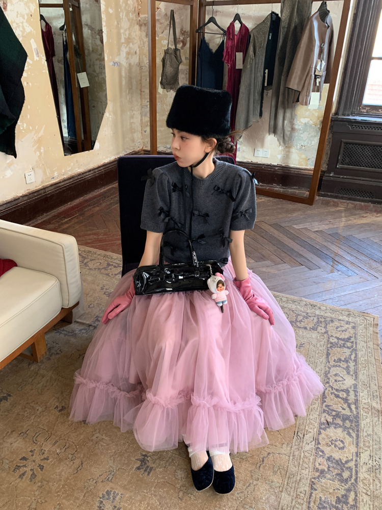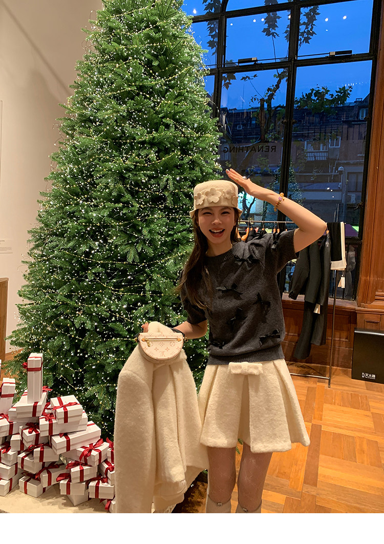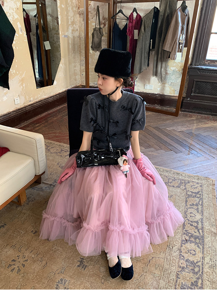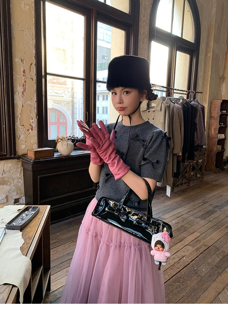LRIB Vintage Prologue Ribbon Bow Gray Knit Short Sleeve Top