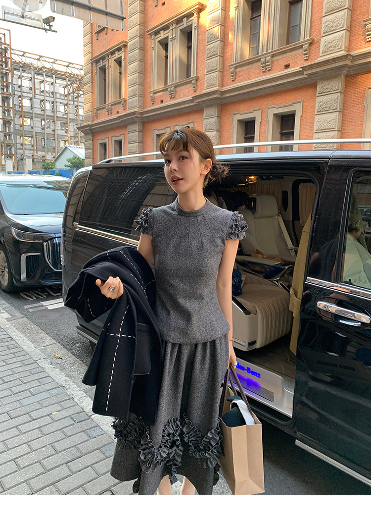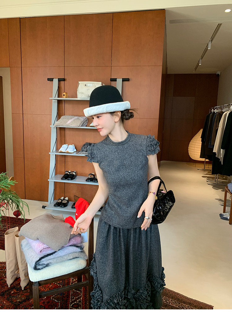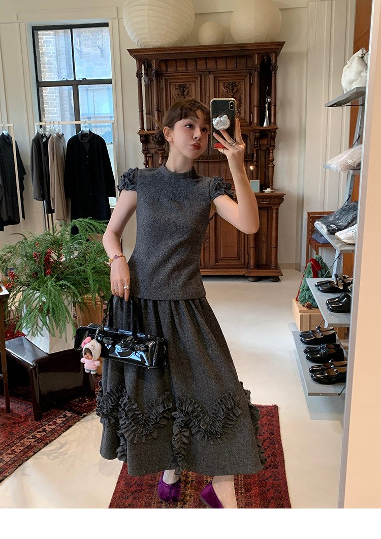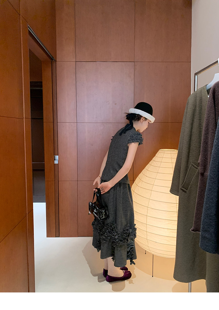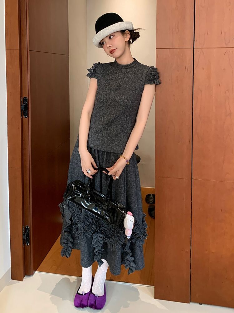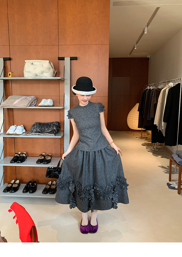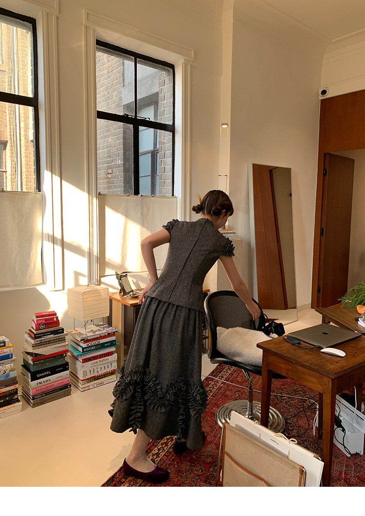 LRIB Vintage Ruffled Short-Sleeved Skirt and Wool SetNEW