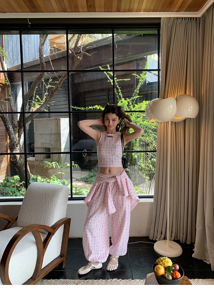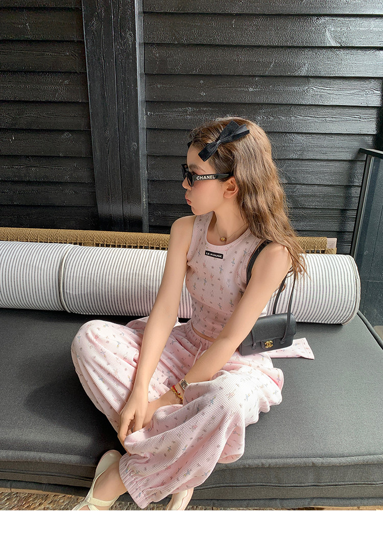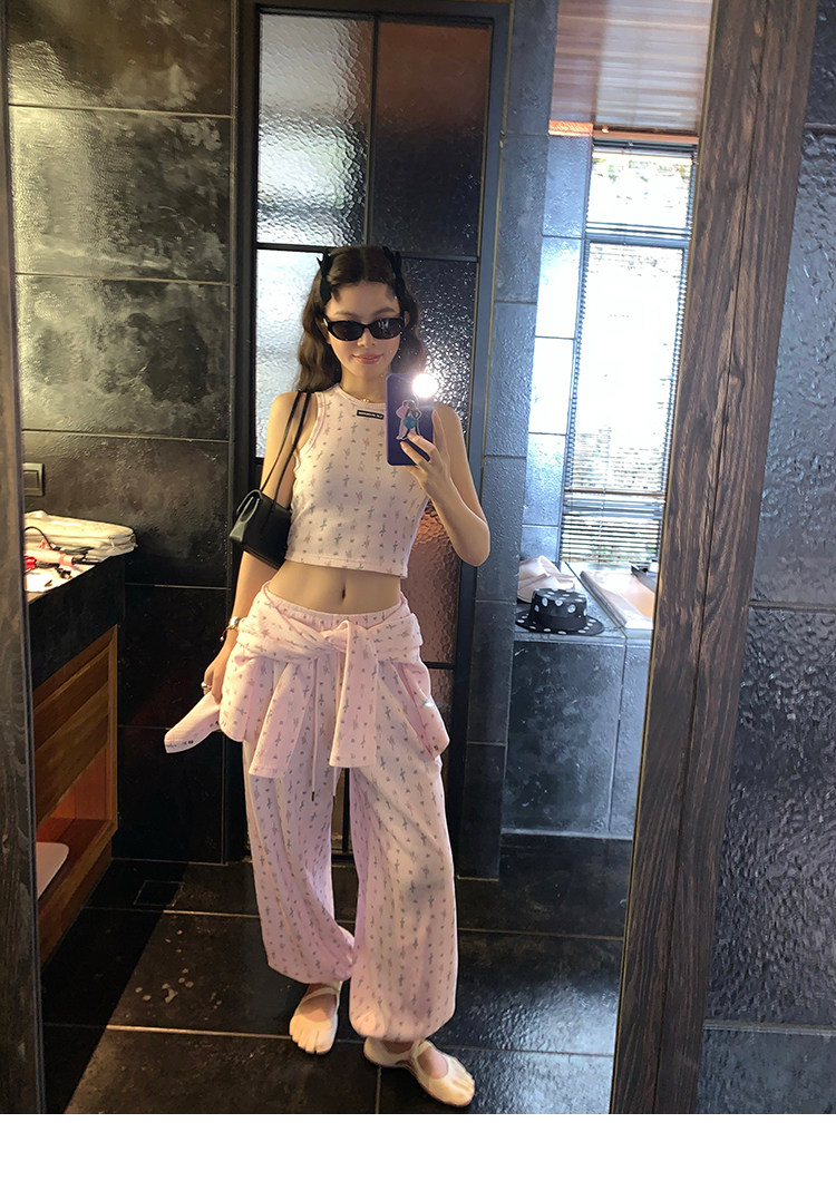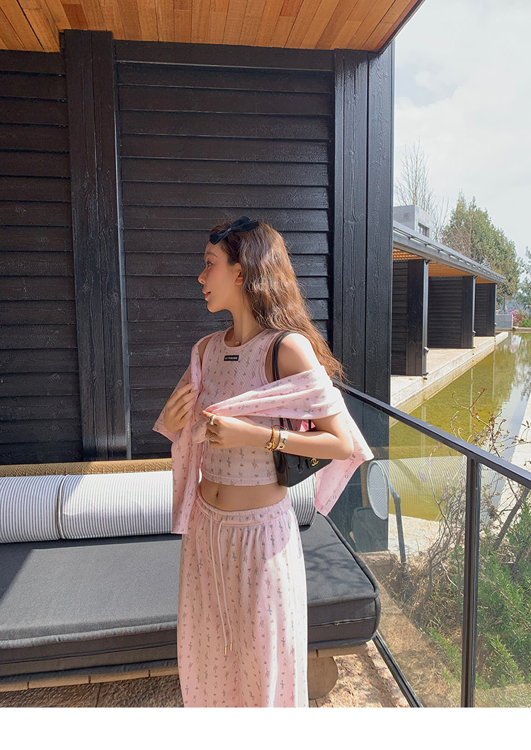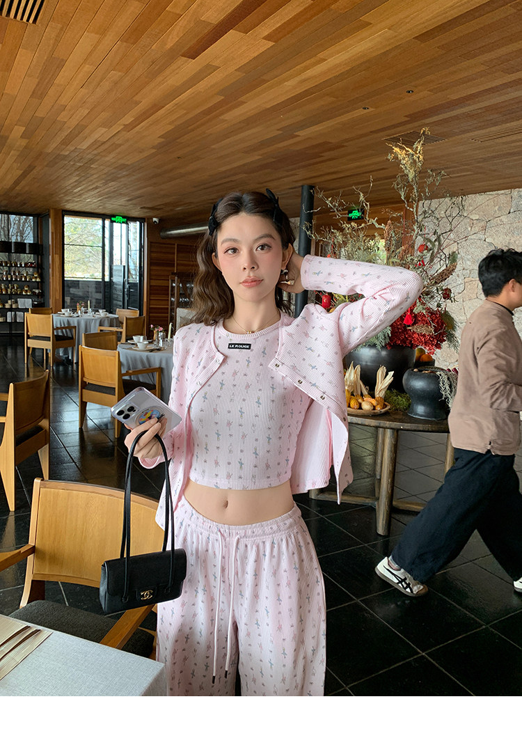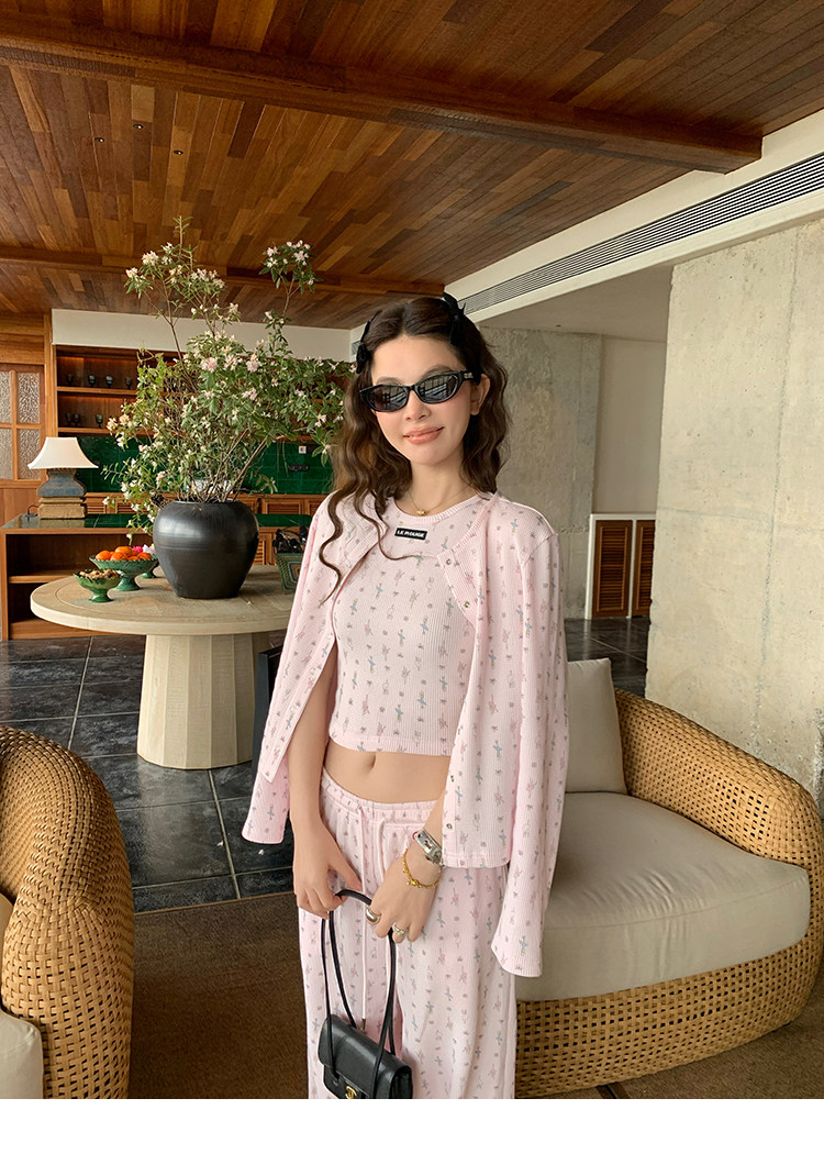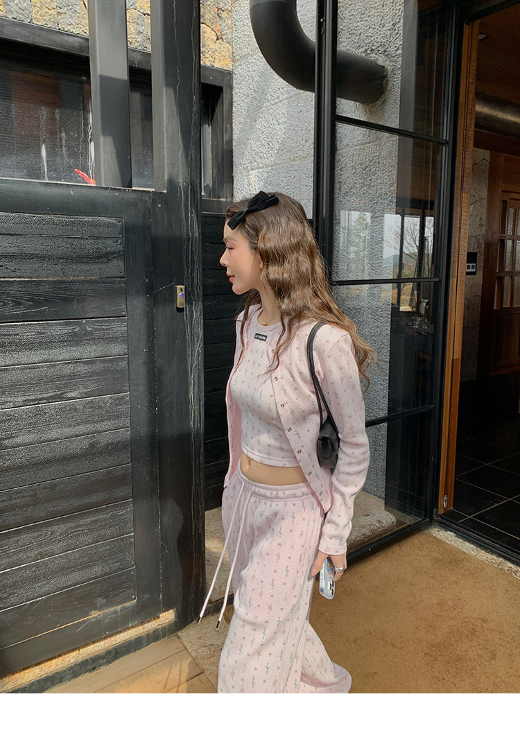 LRIB Waffle Printed Cardigan Tank Top Casual Pants SetNEW
