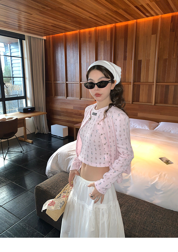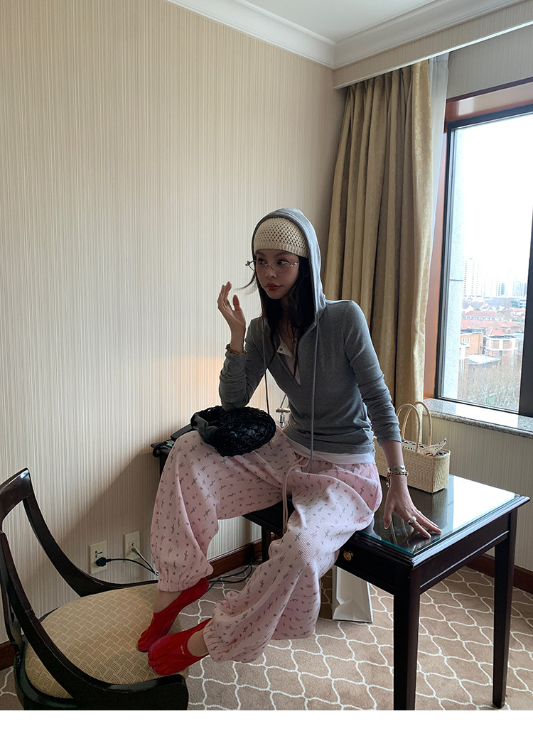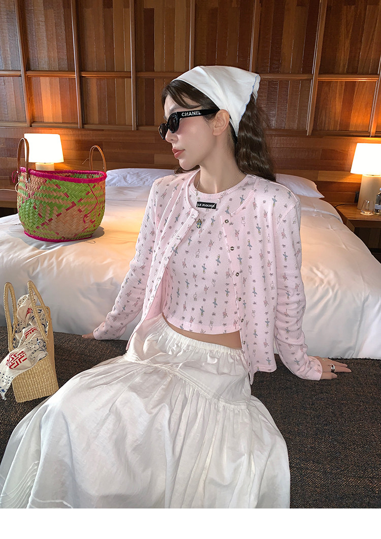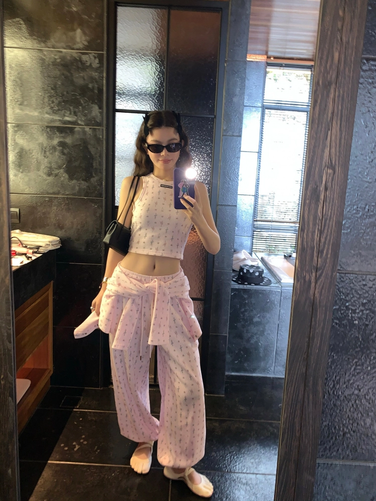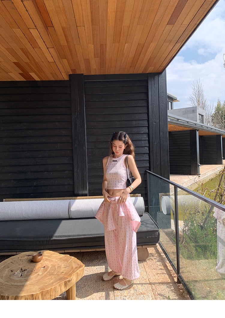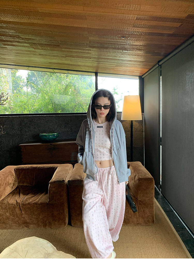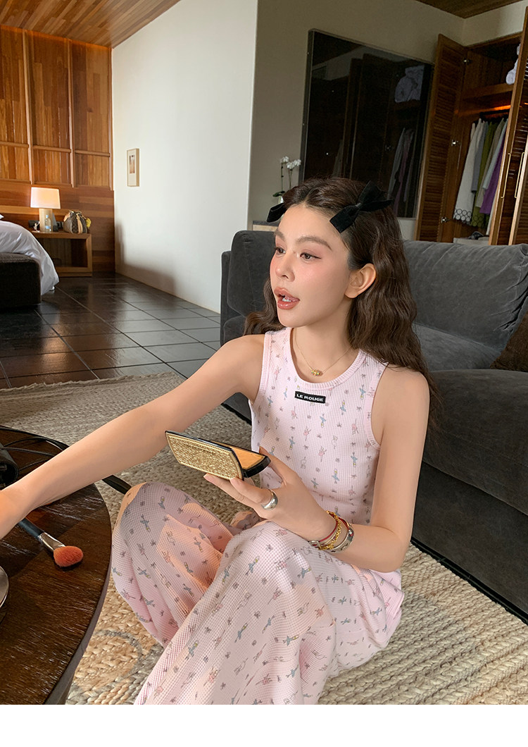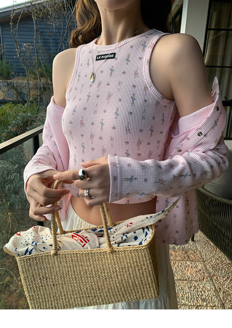 LRIB Waffle Printed Cardigan Tank Top Casual Pants SetNEW